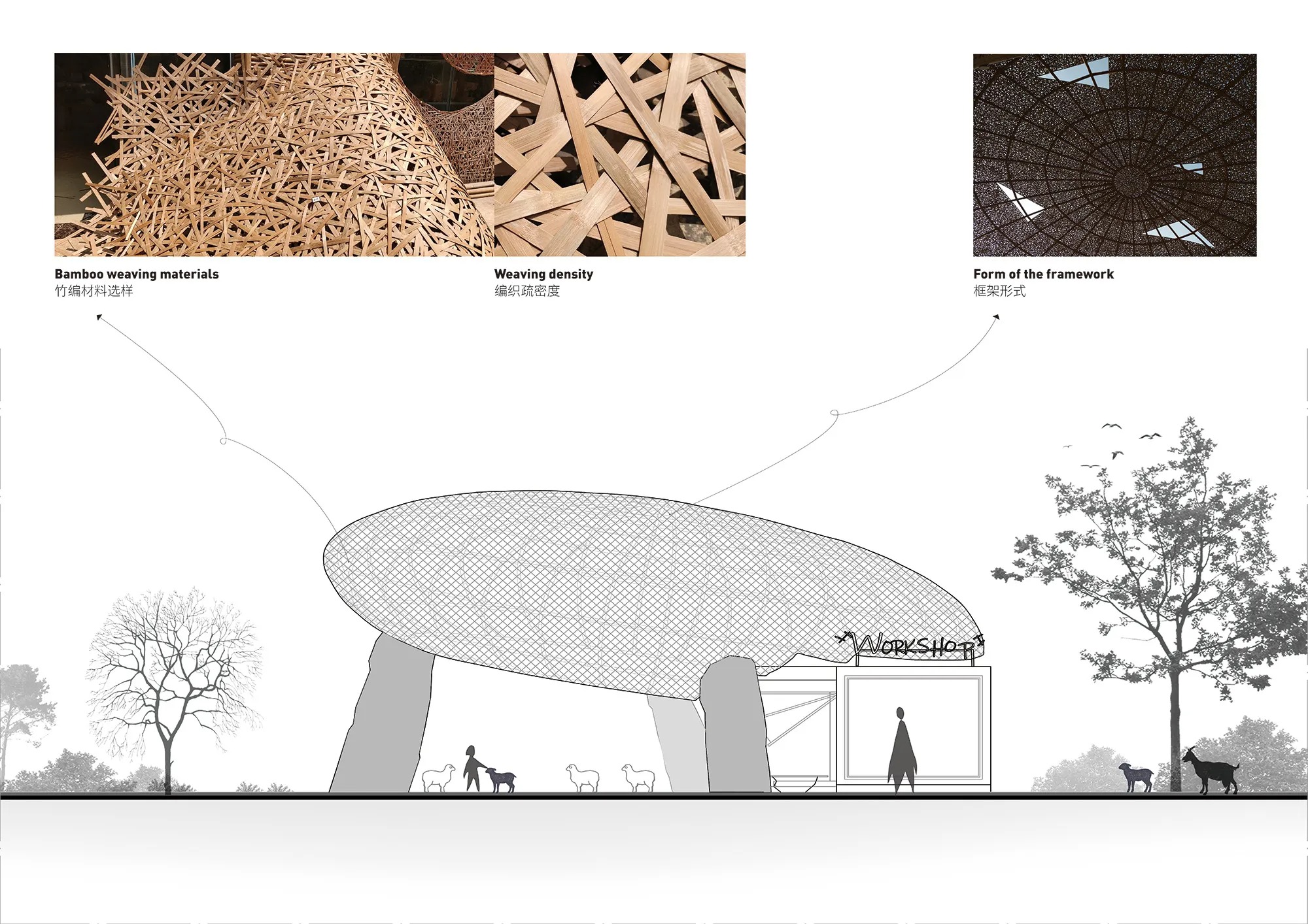 The creative workshop operates as a porous social hub. Large operable façades open to a planted courtyard, allowing craft demonstrations, informal education, and rest to spill into the pasture edge. The bamboo woven dome tempers light for daytime use while accommodating evening gatherings when interior illumination reverses the figure-ground and the canopy becomes a lantern.