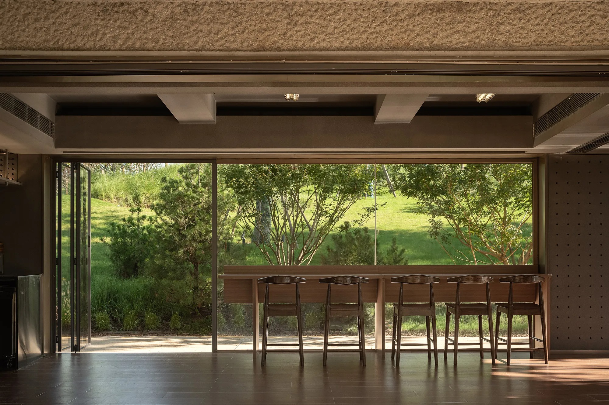공방은 투과성 있는 사교 거점으로 작동한다. 큰 가동식 파사드가 식재된 마당으로 열리며 공예 시연, 비공식 교육, 휴식이 목초지 경계로 흘러나간다. 대나무로 엮은 돔이 낮 동안 빛을 조절하고 저녁 모임을 수용한다. 내부 조명이 밝혀지면 명암이 반전되어 캐노피가 랜턴이 된다.
