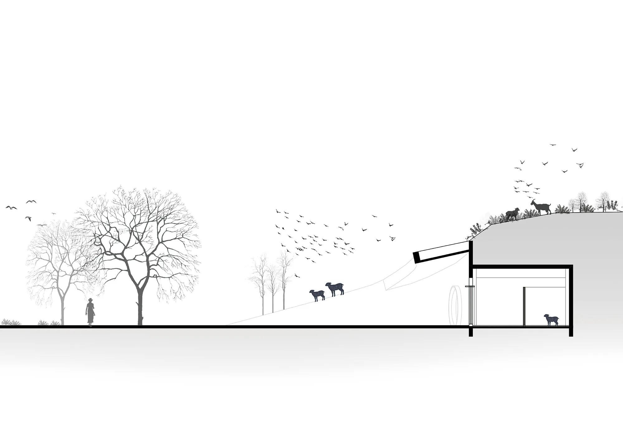 New volumes are partially earth sheltered, with the slopes extended over green roofs to reduce their apparent mass. Enclosures tuck into berms so that fencing and barriers are minimized or absorbed into landform, while graded paddocks step down to maintain clear sightlines between paths and habitats. Boulder-like profiles maintain a low horizon, allowing the tree canopies and grasses to dominate, and reinforce a steady visual cadence that reads as terrain rather than object collection.