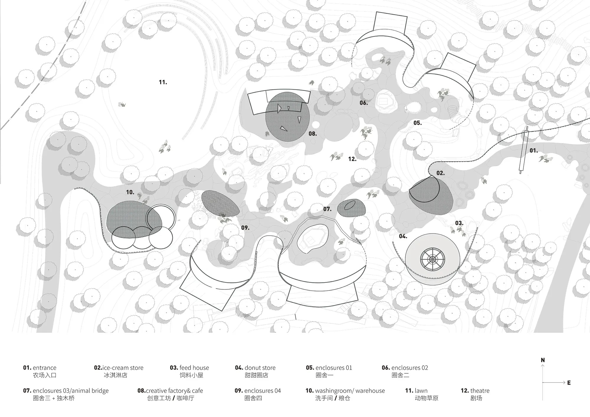 The plan adopts a closed loop that threads together animal zones, a creative workshop, and small concessions, creating a walkable gradient of exposure and rest. Sightlines open and compress along the loop to frame recurring moments of encounter with animals and landscape. The routing respects existing contours, placing entries on flatter land and using gentle inclines to choreograph views across the valley floor toward the river.