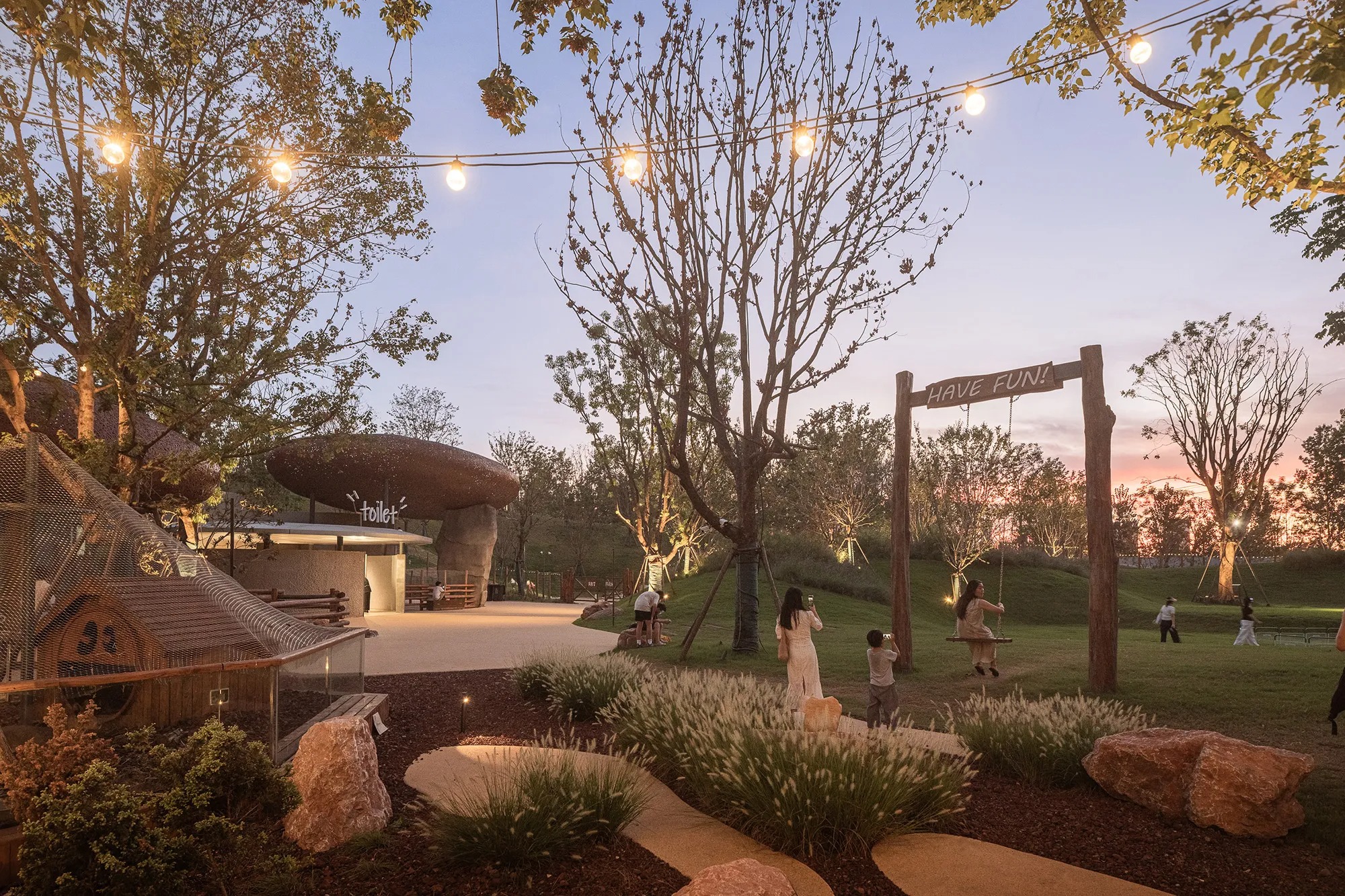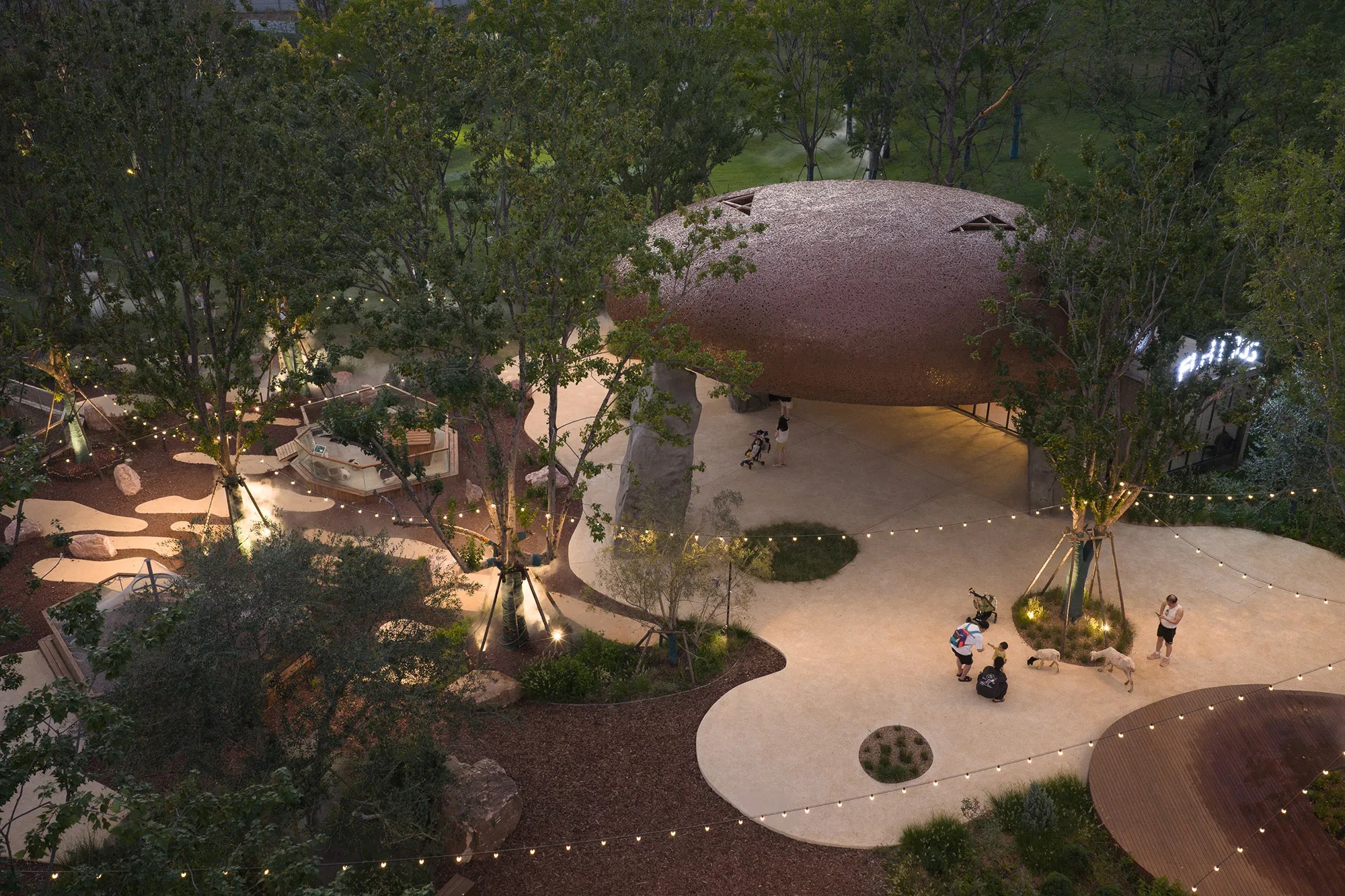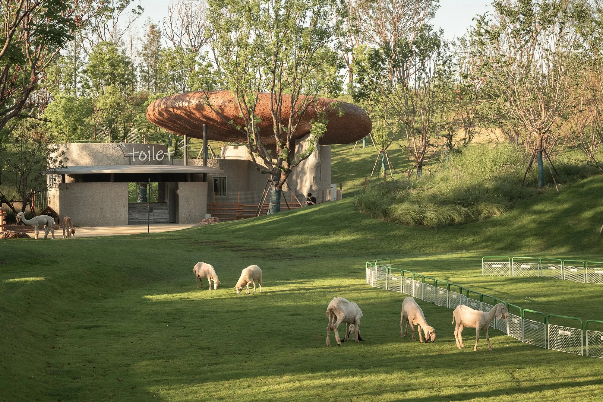 LuxeIsland Farm in Wuhan develops a compact agricultural park along the Zhujia River through a terrain led strategy that embeds small buildings into slopes and extends green roofs into the pasture. Various Associates orchestrates a legible pedestrian loop that links animal enclosures, an open workshop, and compact food pavilions. The result is a low-profile ensemble of bamboo-woven canopies and stone-like volumes that read as part of the valley, using calibrated metal landmarks to guide orientation without disrupting the site’s continuity.