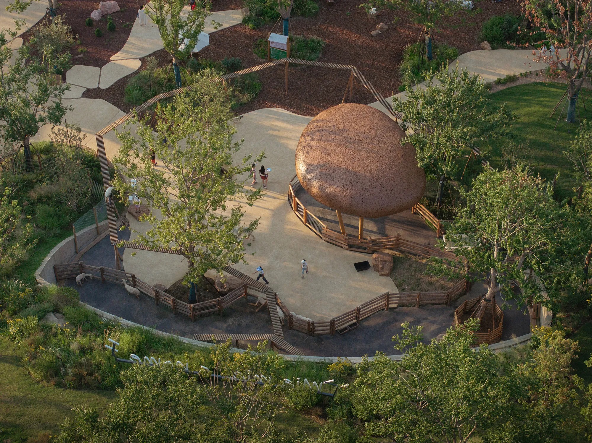 The animal areas combine habitat and measured proximity. Open paddocks, sand pits, and shaded timber frameworks provide animals with varied substrate and shelter while allowing visitors close yet controlled views. Earth-covered shelters along slopes improve thermal stability and form protective retreats, with low parapets and planting defining edges that read as landform rather than enclosure.