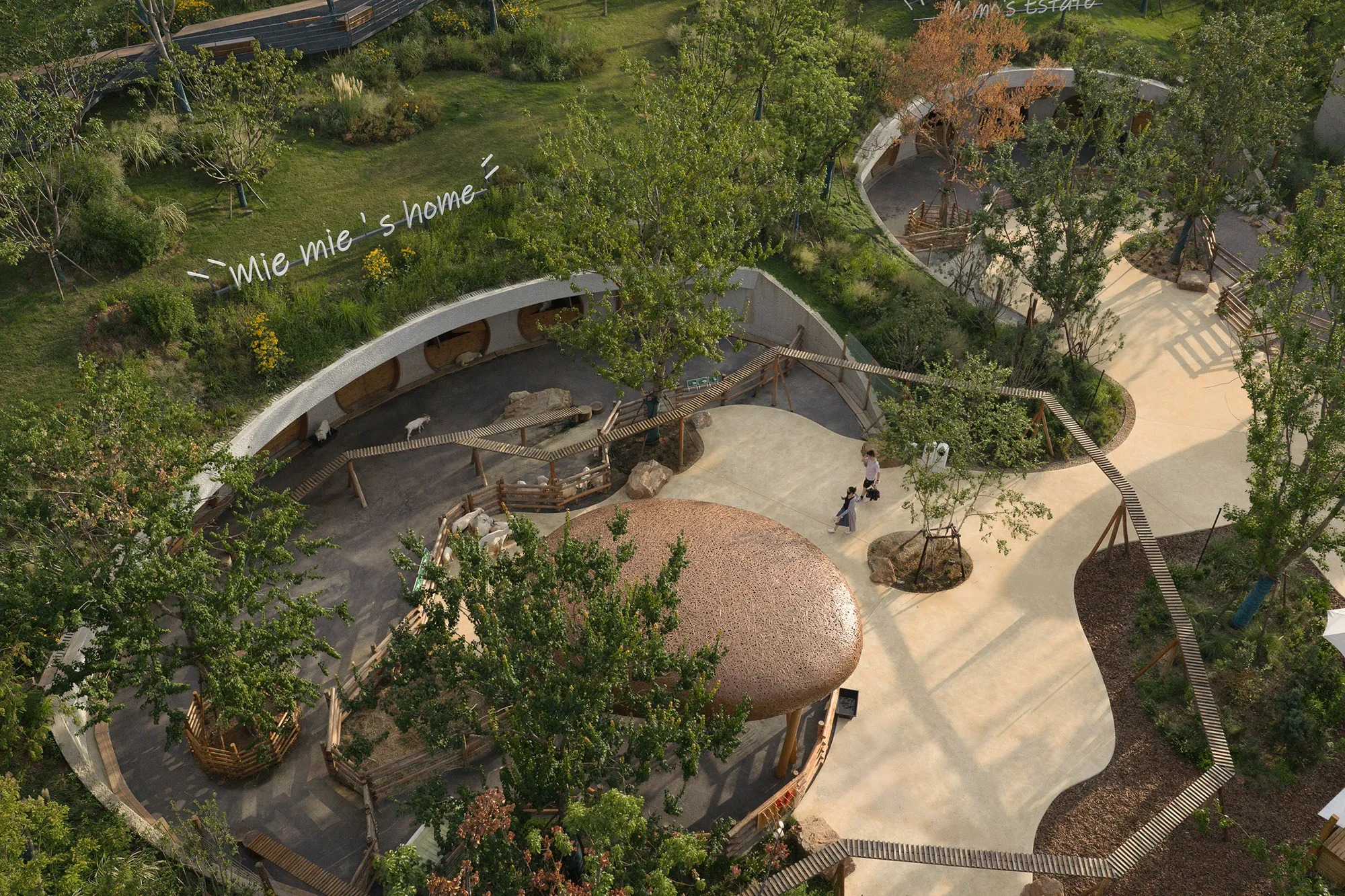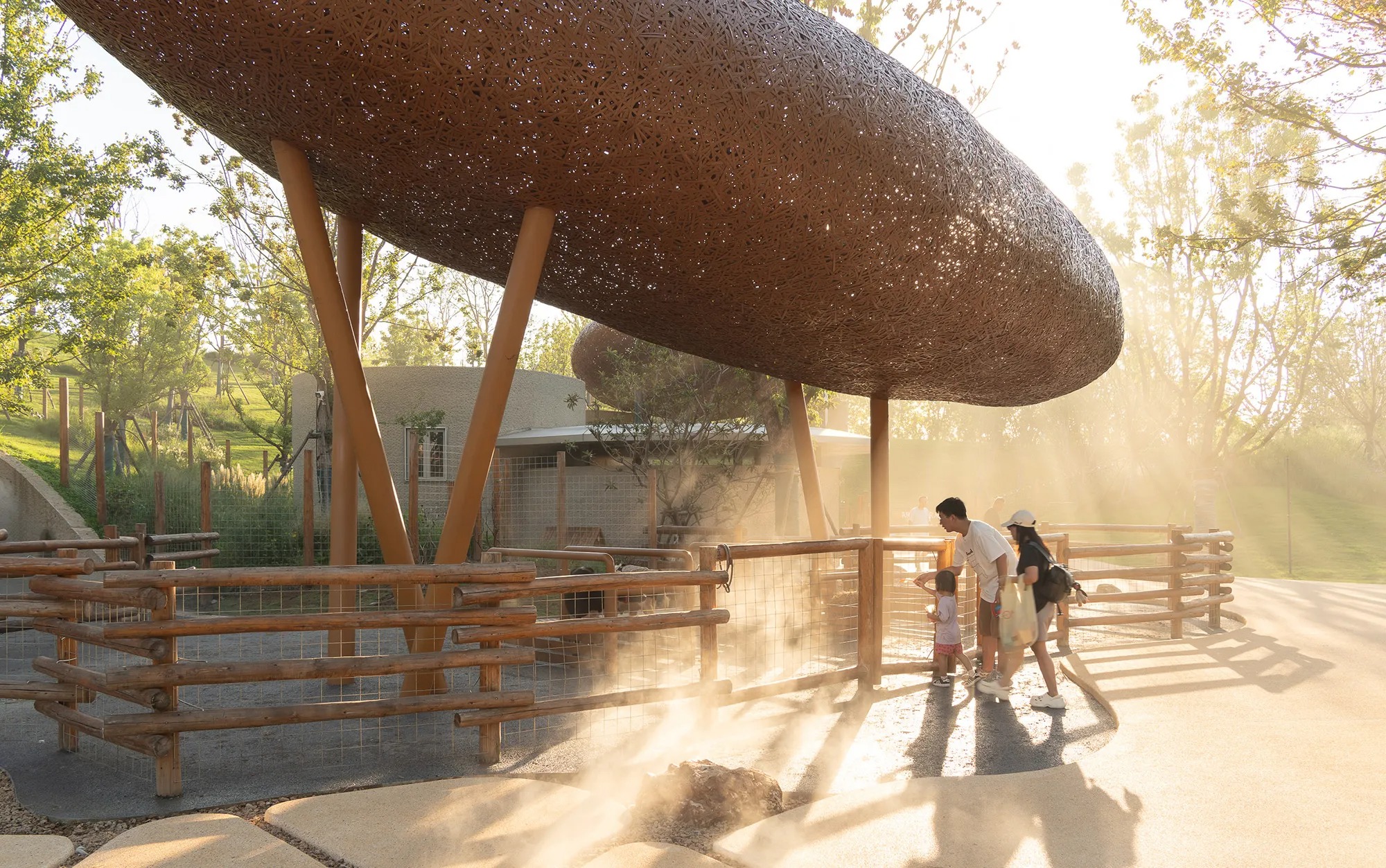 동물 구역은 서식지와 적절한 거리감을 결합한다. 열린 목장, 모래 구덩이, 그늘진 목재 프레임워크가 동물에게 다양한 바닥재와 은신처를 제공하면서 방문자는 가까이 다가서되 적절한 시선을 유지한다. 경사면을 따라 흙으로 덮인 은신처가 열 안정성을 개선하고 보호 공간을 형성한다. 낮은 난간과 식재가 경계를 정의하되 울타리가 아닌 땅의 형태로 읽힌다.
