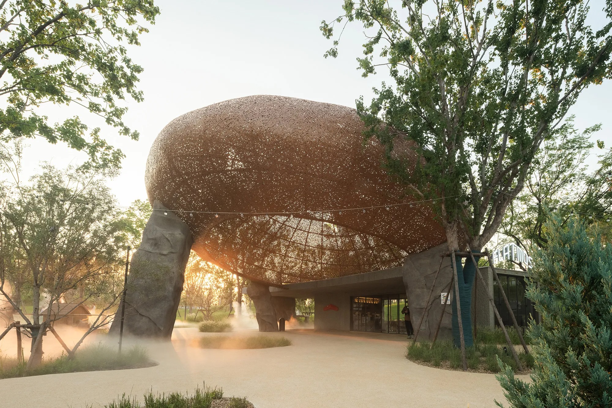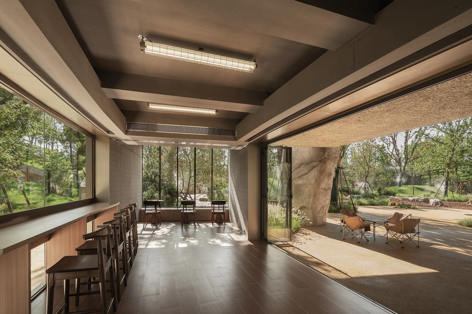 Service structures reinforce the same tectonic language for coherence. The feed barn and washroom adopt floating bamboo-and-metal roofs with stone textured bases, while interiors use cementitious coatings and textured tiles for durability and easy cleaning. By aligning back-of-house functions with the public expression, the project avoids the typical service-to-public rupture and maintains program clarity around the loop.