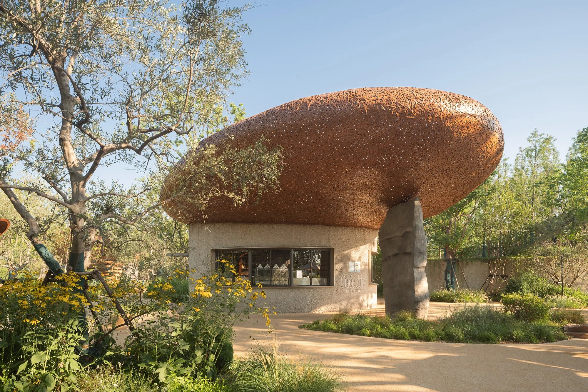 프로젝트는 두 가지 재료 레지스터를 정렬한다. 가벼운 직조 표면과 무거운 돌 같은 볼륨이다. 대나무와 목재가 기후와 빛을 조절하는 상부 요소를 형성하고, 낮은 벽과 기둥형 지지대는 광물적 표현을 택한다. 이 조합은 지면에서 구조를 안정시키면서 상부의 경량감을 유지한다. 작은 파빌리온이 시각적 부담 없이 날씨와 마모를 견뎌야 하는 상황에 유용한 전략이다.