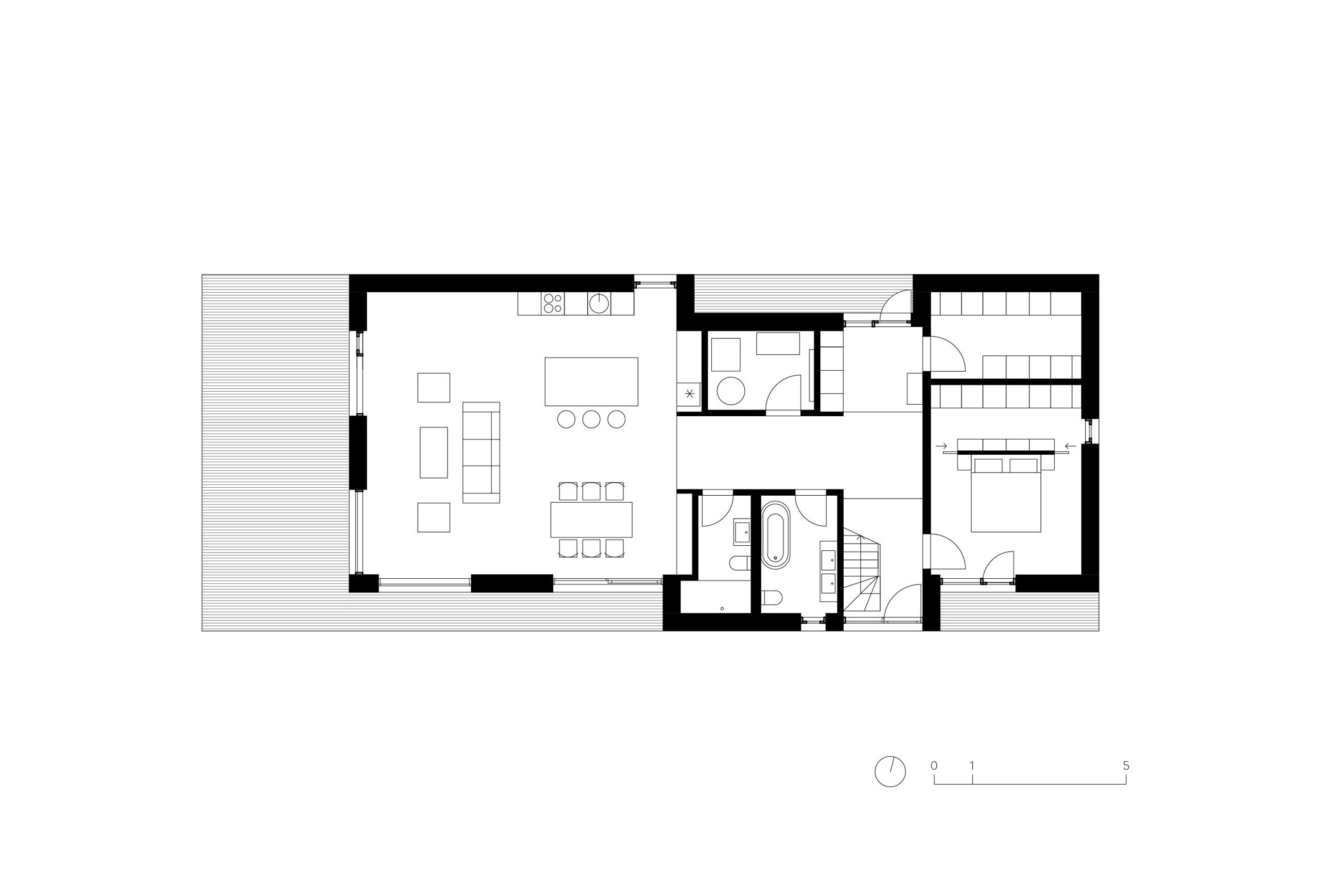 목재 데크 테라스가 거실에서 자연스럽게 이어진다. 이 테라스는 집의 서쪽 끝을 감싸며 실내 공간을 확장한다. 중앙 홀과 주침실 옆에도 각각 작은 테라스가 있어 거주자는 집 곳곳에서 밖과 만난다.
