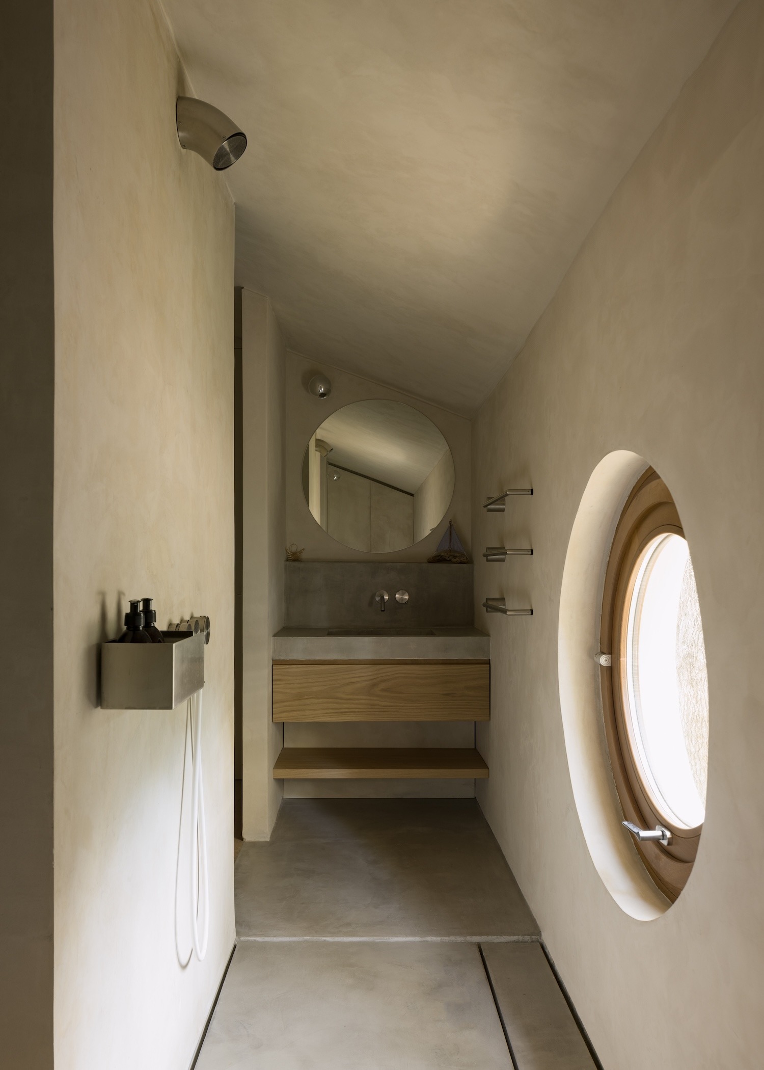 두꺼운 외벽은 단순한 구조체가 아니다. 이 벽은 위층으로 오르는 계단을 품고, 수납 공간을 담으며, 붙박이 가구 역할을 한다. 이런 통합 전략 덕분에 내부는 깔끔한 질서를 유지한다. 별도의 가구나 드러난 설비 없이도 모든 기능이 벽 속에서 작동한다.