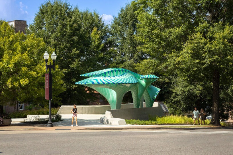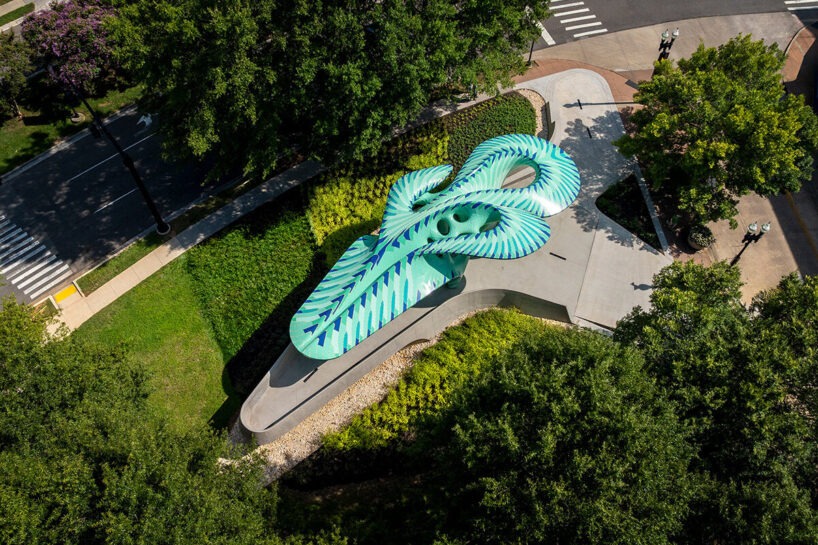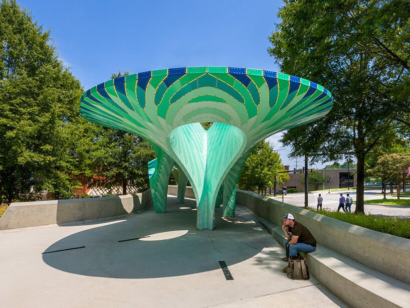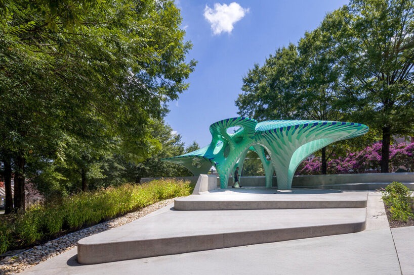 MARC FORNES / THEVERYMANY unveils Pier 865 in Knoxville’s Cradle of Country Music Park, a walkable sculpture that doubles as public infrastructure. Rising where a concrete pier meets an aluminum canopy, the piece forms a serpent-like structure. Built from hundreds of pre folded aluminum strips, each painted in a gradient of seven tones, soft greens, deep-sea blues, and butter yellow, the canopy’s surface behaves like a living skin. Stretching into the treetops, Pier 865 offers views of foliage, neighborhoods, and distant mountains. From the ground, it evokes plant life sprouting from concrete; from above, a reptilian silhouette coiling through the park. Cantilevered wings provide places to sit, gather, or pause, turning this public artwork into a civic hangout that moves with the landscape.