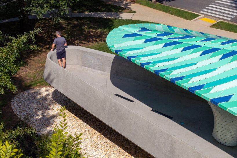 하나는 앞으로 휘어지며 좌석을 만든다. 다른 하나는 위로 솟아 그늘진 플랫폼이 되어 지역 행사를 위한 작은 무대 역할을 한다. 세 번째 날개는 낮고 조용하게 뻗어 나무 사이에서 은신처를 제공한다.