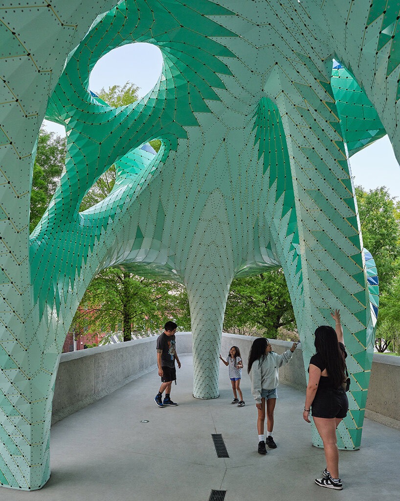 뱀처럼 구불거리는 알루미늄 캐노피, 녹스빌 공원의 새로운 랜드마크 MARC FORNES / THEVERYMANY's serpent-like sculpture slithers through knoxville