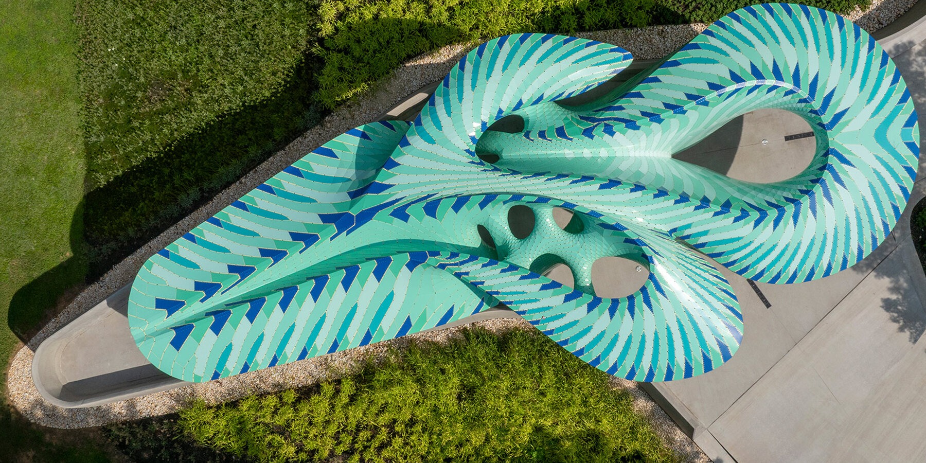 수백 개의 알루미늄 띠 패널을 조립해 만든 캐노피는 부드러운 초록에서 청록, 파랑, 옅은 노랑으로 이어지는 그라데이션을 입었다. 표면은 살아 숨 쉬는 피부처럼 빛을 받아들인다.