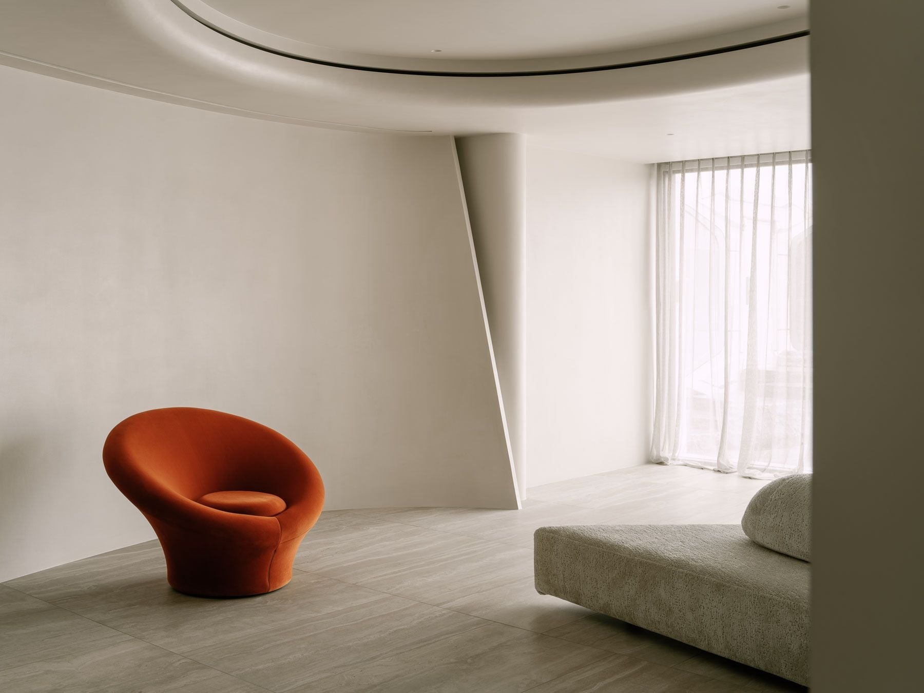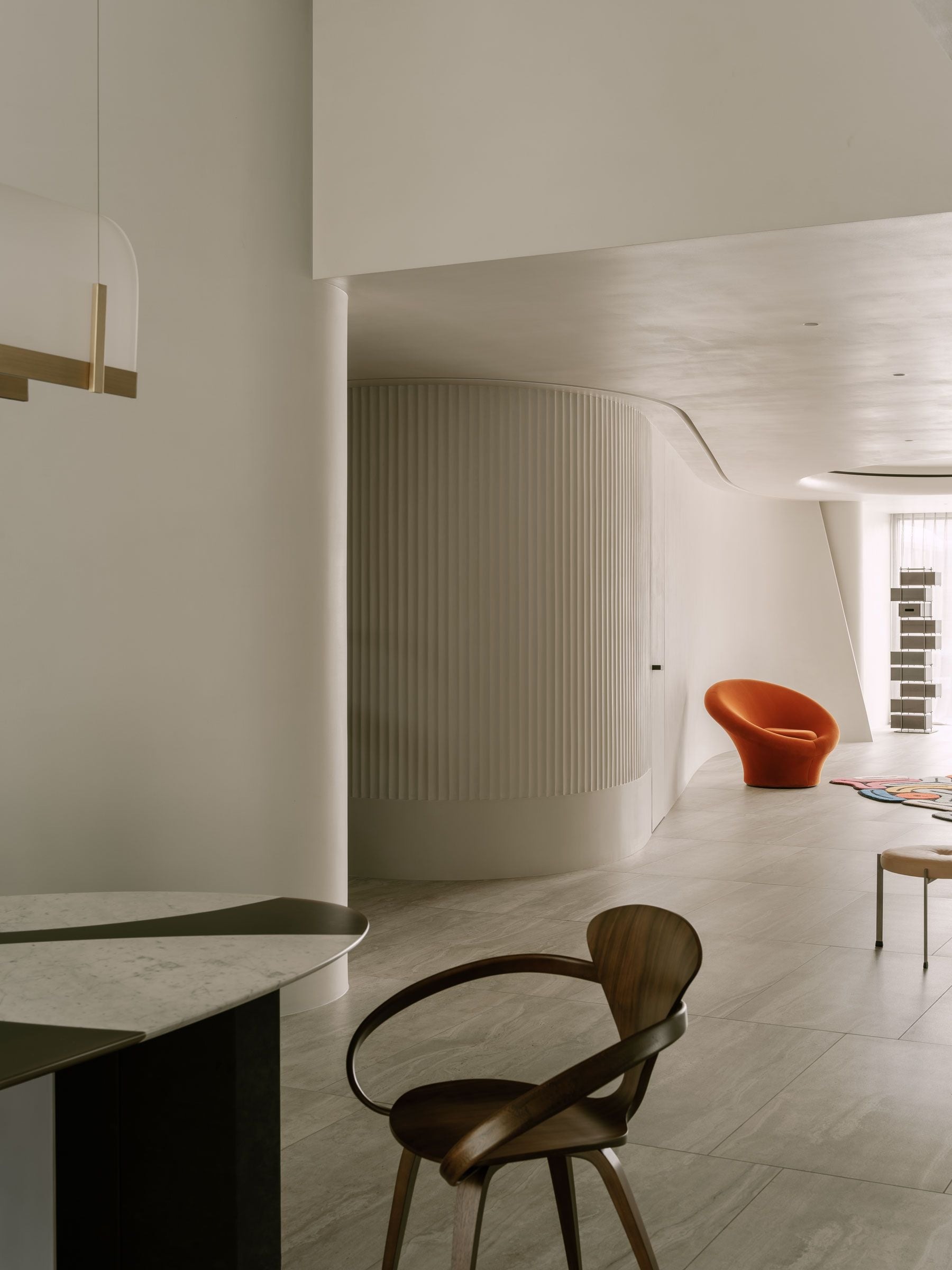 The fluid design language allows the open plan living and dining area on the ground floor to unfold in rhythmic progression where an eclectic mix of contemporary and vintage furniture pieces echo the home’s flowing geometry. In the sitting area, a sculptural sofa anchors the space, surrounded by a pair of 1970s Zen Lounge Chairs by Kwok Hoi Chan, and Pierre Paulin’s iconic 1963 Mushroom Chair in a blood orange, constituting one of the few bursts of colour in the house.