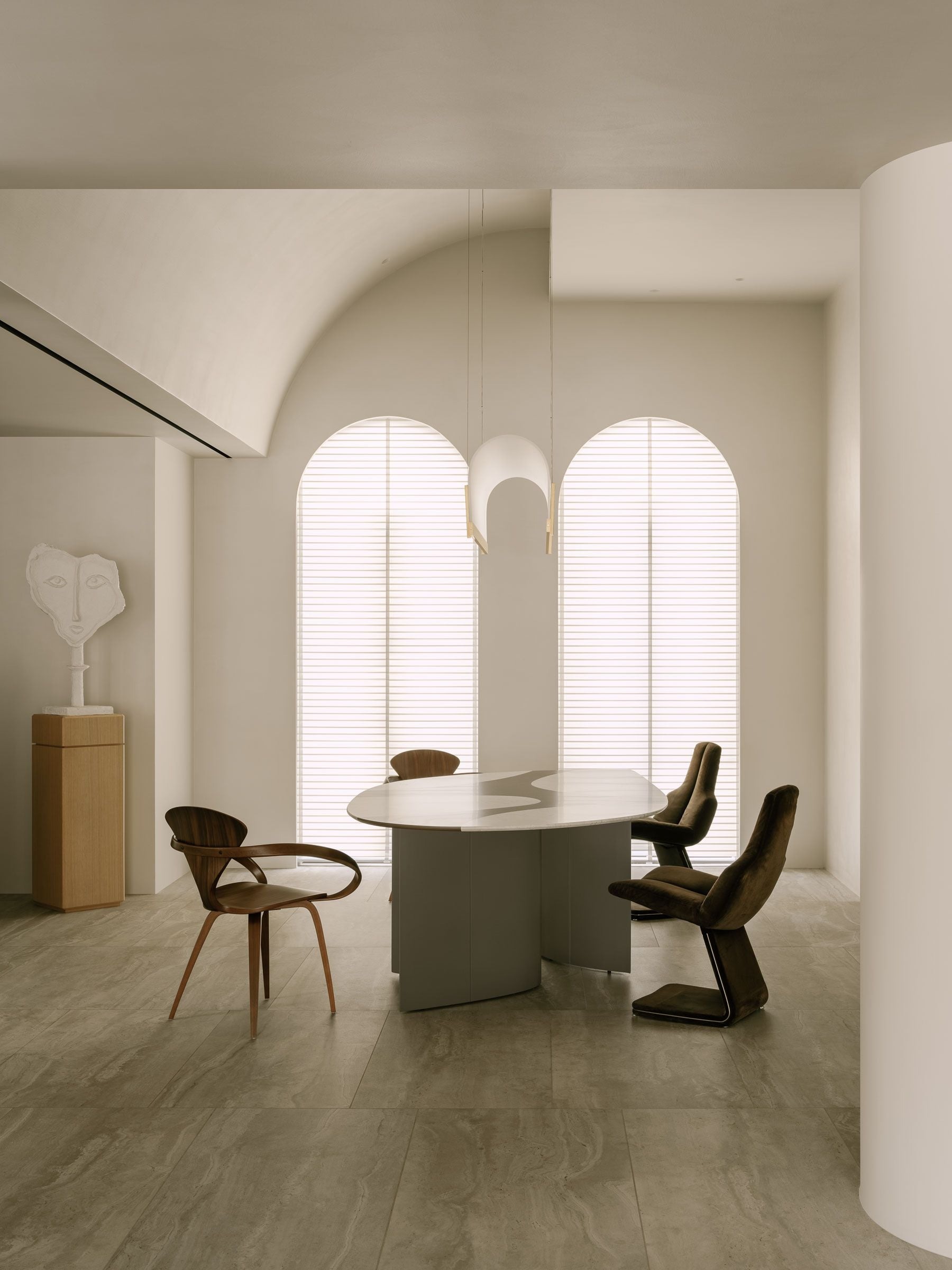 식당 공간에서는 유기적 형태의 테이블이 노먼 체르너가 1958년 디자인한 성형 합판 의자들과 가스토네 리날디가 1960년대 리마를 위해 만든 스페이스 에이지 Z 체어와 짝을 이룬다. 우아한 곡선이 절제된 배경을 풍요롭게 만든다.