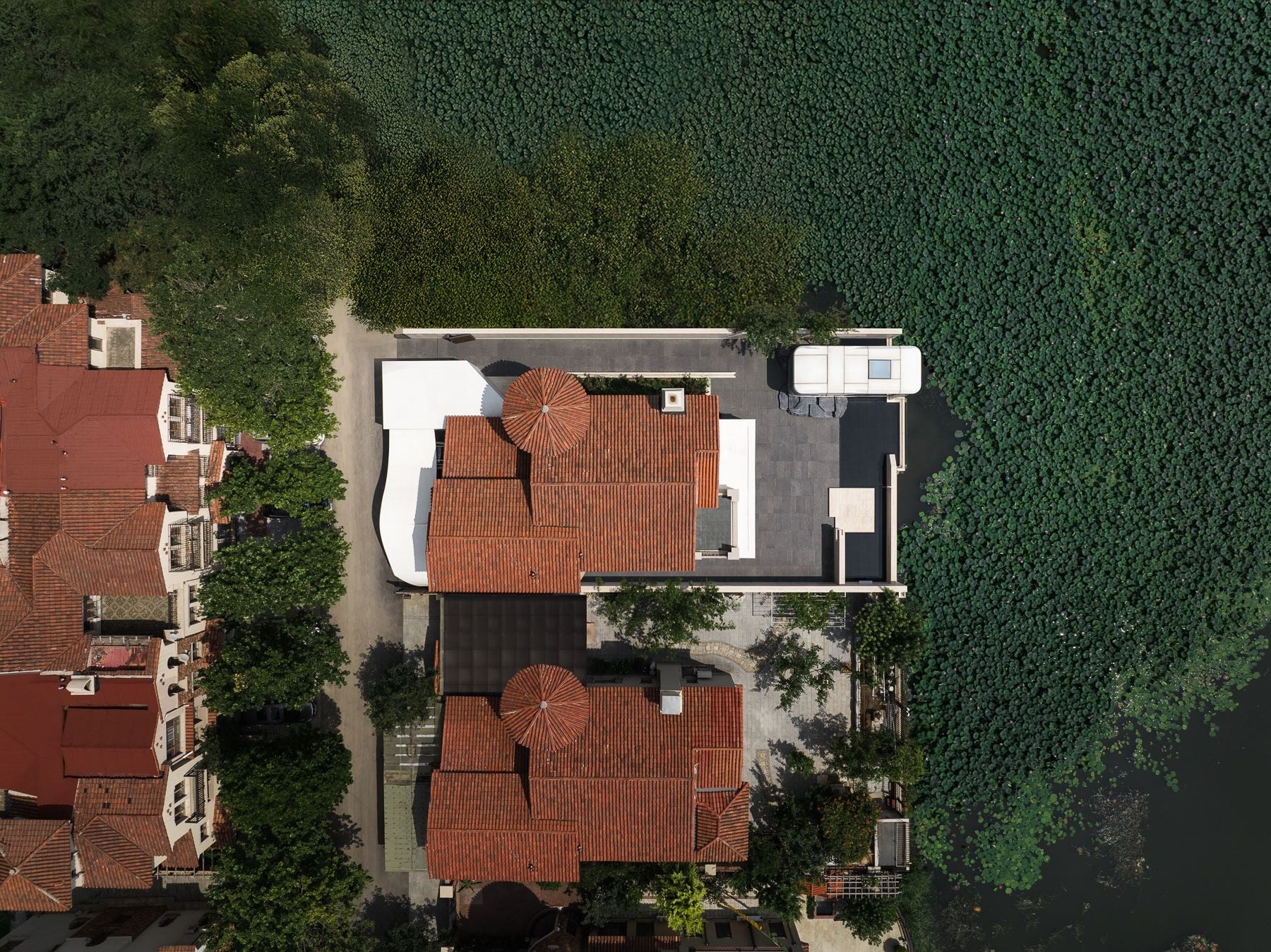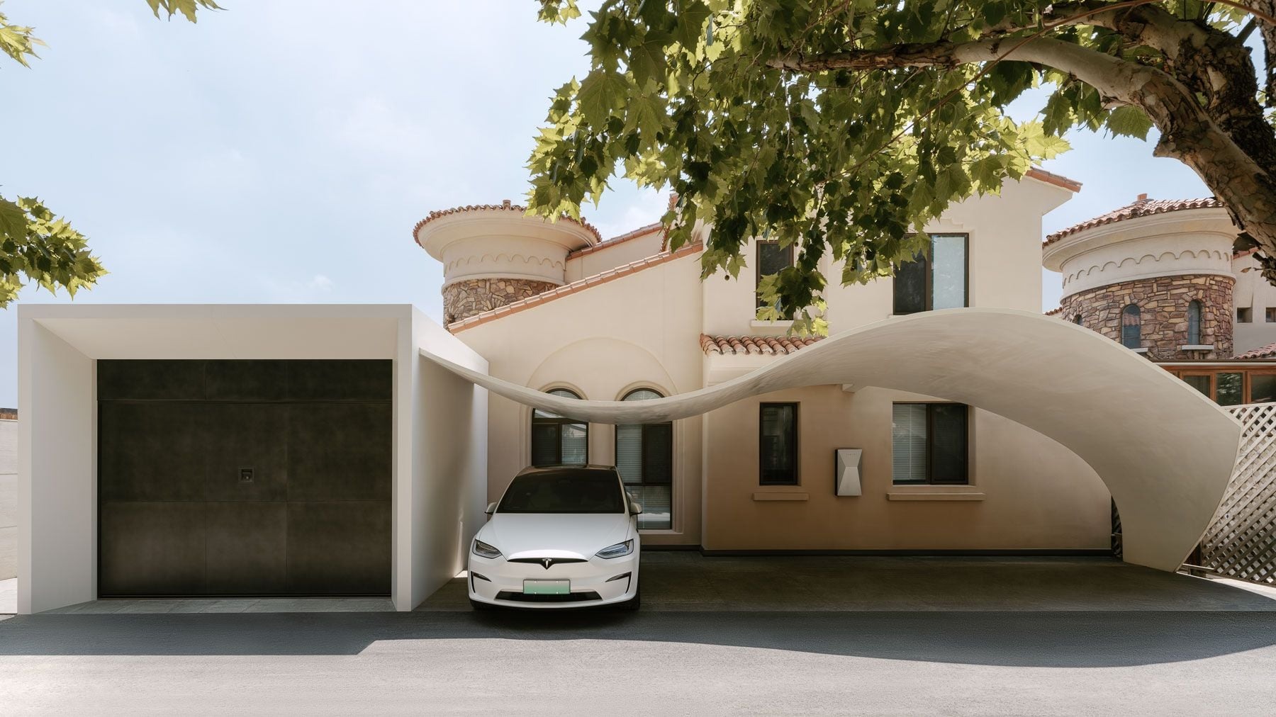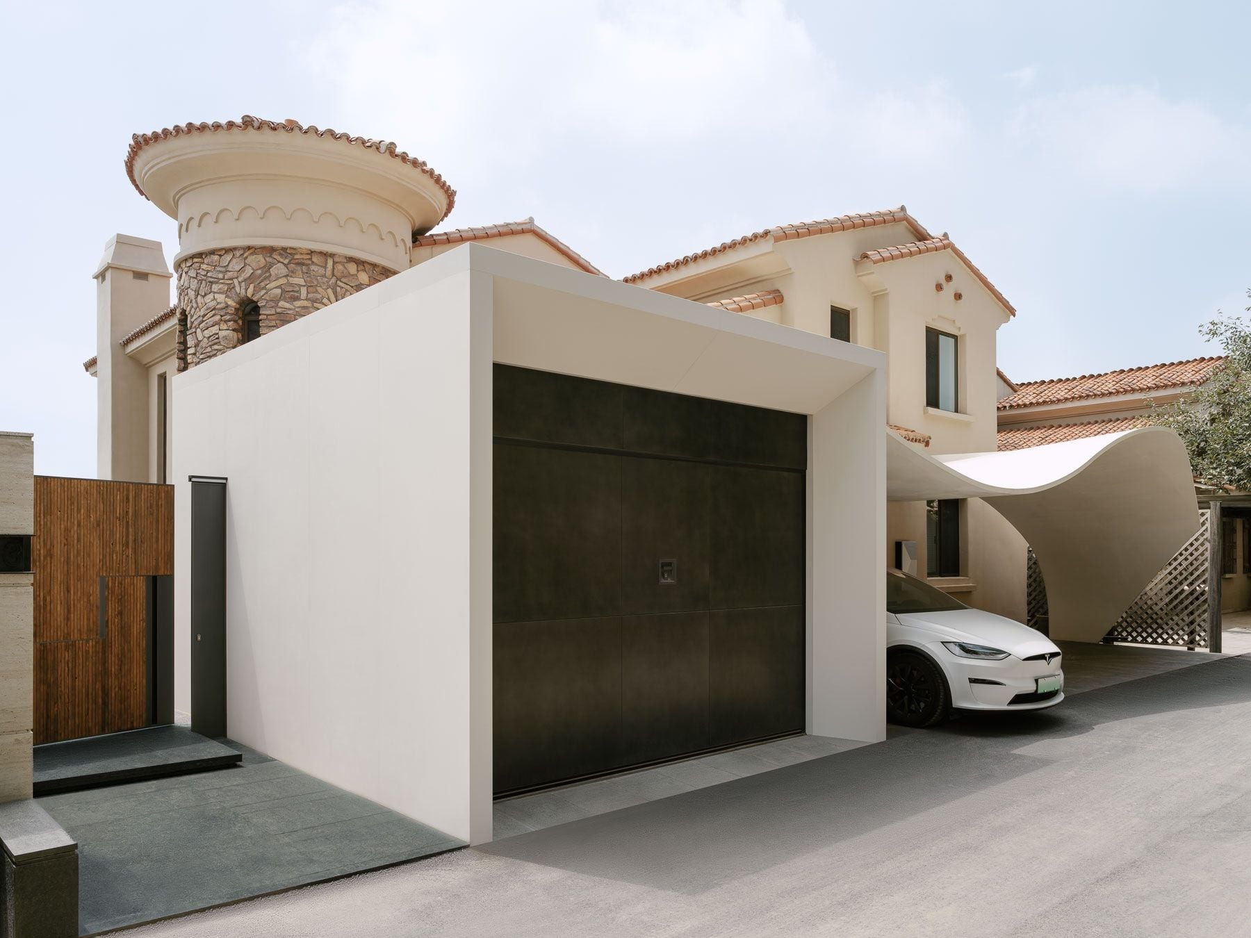 While the villa’s interior was radically transformed to align with the family’s needs, the designers retained the exterior’s quaint charm—think terracotta roof tiles, arched windows, and a fairytale turret choosing instead to engage it in quiet dialogue. The most striking intervention appears at the front: a wave-shaped canopy hovers above the driveway like a suspended ribbon, its fluid form echoing the owner’s automotive passion while signalling the home’s new identity. Beside it, a minimalist white box houses a garage, while at the back, a detached, space capsule-like pavilion serves as a lakeside retreat for the owner’s father who likes to fish and organize late-night gatherings with friends. The additions neither compete nor conceal, offering a contemporary counterbalance to the villa’s nostalgic character.