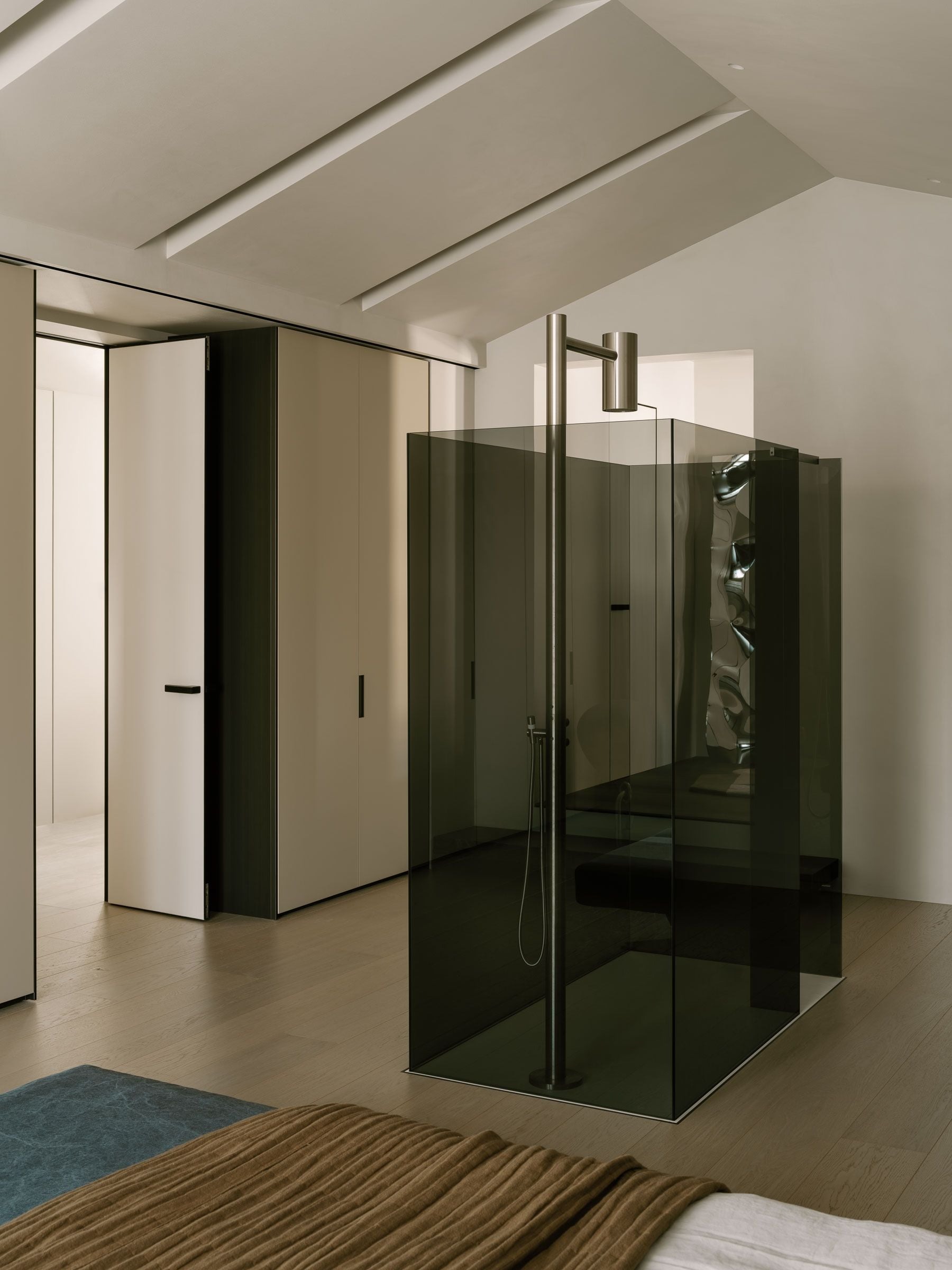 The upper floor hosts three bedrooms, including a generous master suite where a freestanding glass shower shower enclosure introduces a sense of ritual calm, complemented by a sunken bathtub that enhances the master bathroom’s spa-like serenity. One of the children’s bedrooms, in contrast, balances function and playfulness with terrazzo floors and floral curtains.