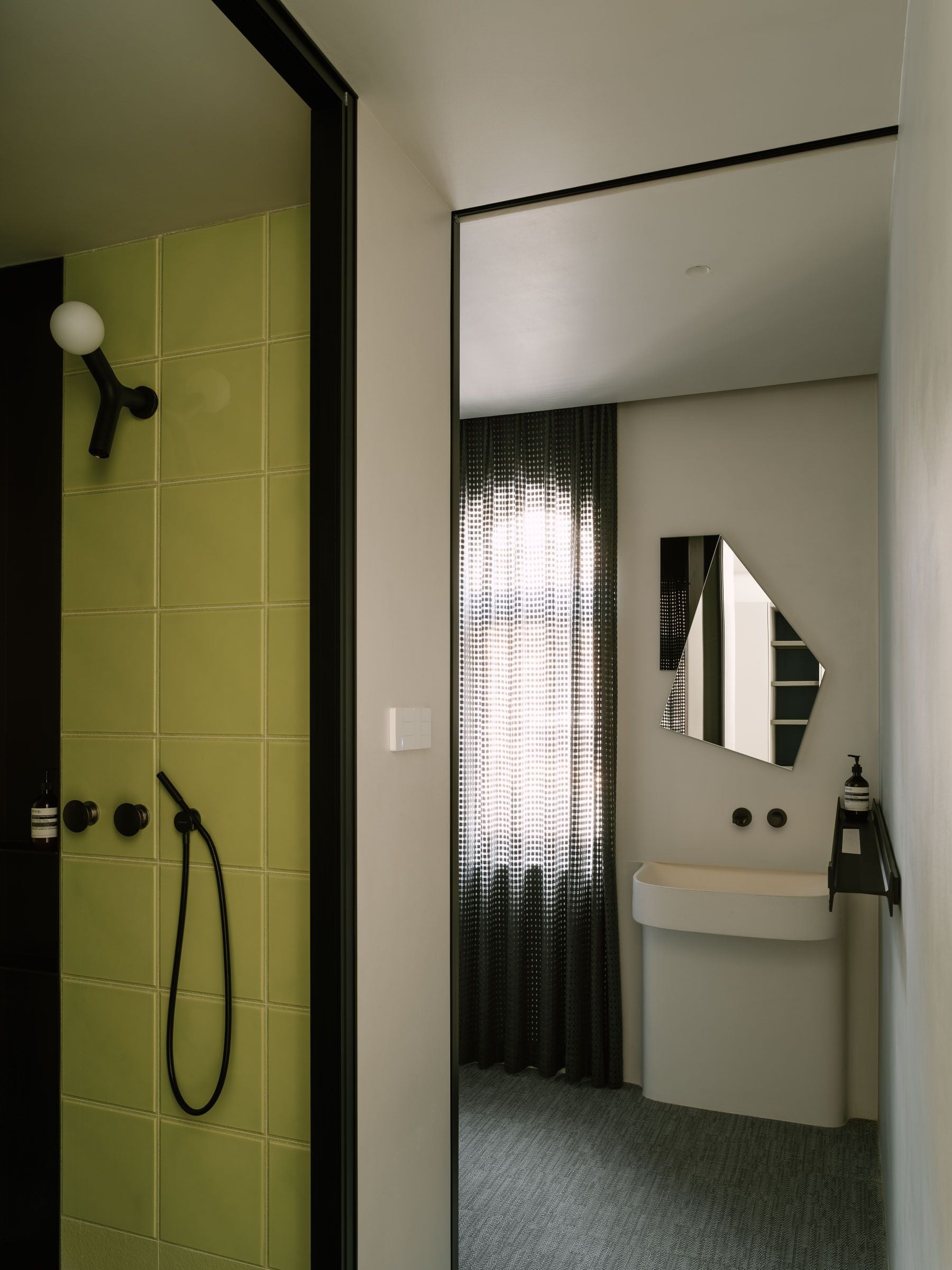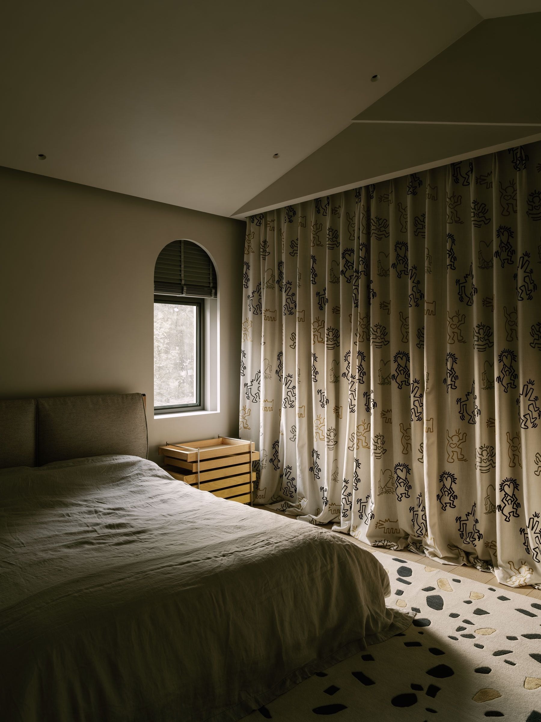 위층에는 넉넉한 마스터 스위트를 포함해 세 개의 침실이 자리한다. 독립된 유리 샤워 부스가 차분한 분위기를 만들고, 선큰 욕조가 마스터 욕실의 스파 같은 평온함을 더한다. 자녀 방 중 하나는 테라초 바닥과 꽃무늬 커튼으로 기능성과 놀이적 요소의 균형을 맞춘다.