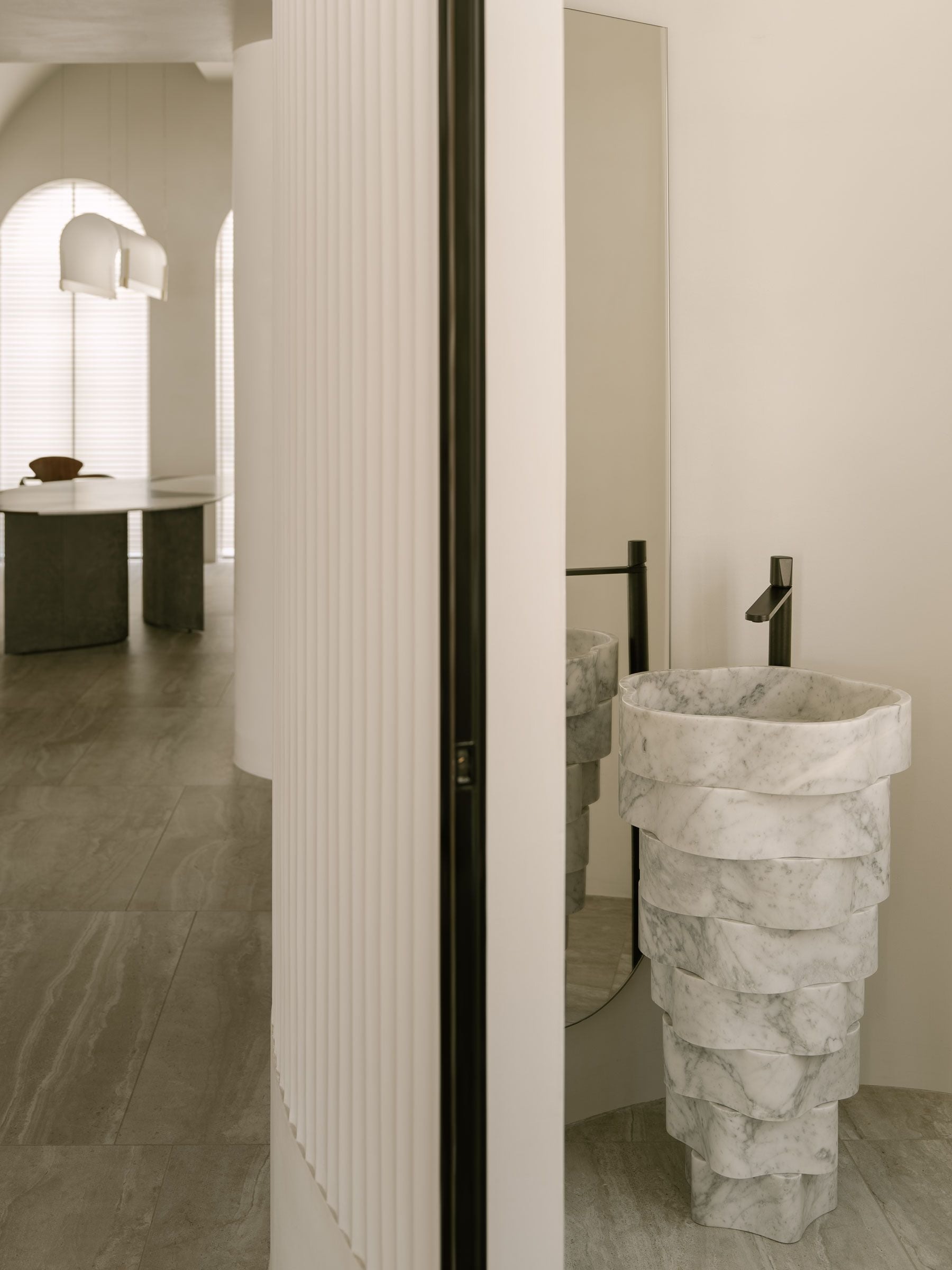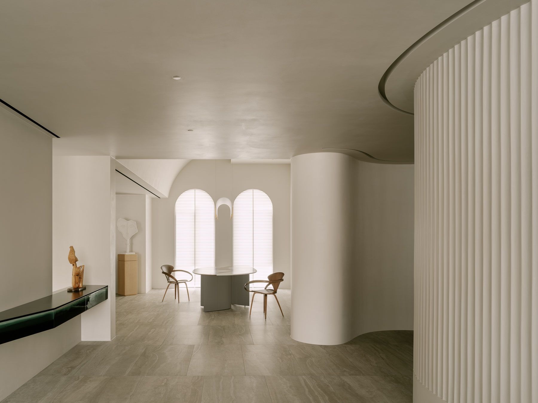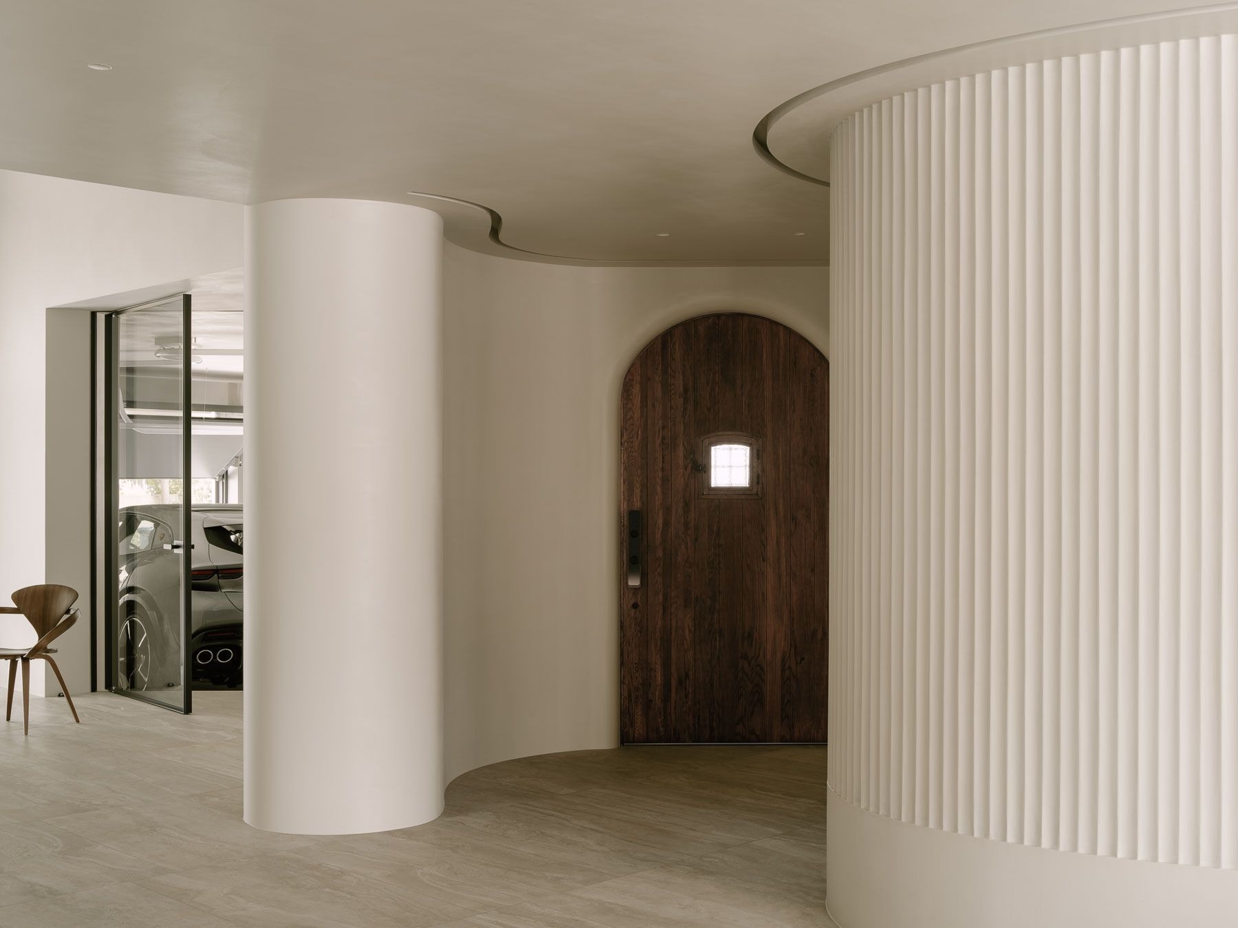 Inside, it’s a different story altogether. What was once a decorative pastiche is now a pared back environment of minimalist sophistication defined by flowing lines, textured surfaces, and a monochromatic palette. Drawing from the language of automotive aerodynamics, in what is a nod to the owner’s passion for cars, every wall, ceiling, and built-in element is shaped in continuity. Sinuous partitions, rounded corners, and curvaceous bulkheads blur the boundaries between rooms, creating a sense of motion and fluidity, while arched openings and sculptural furnishings amplify the home’s spatial rhythm.