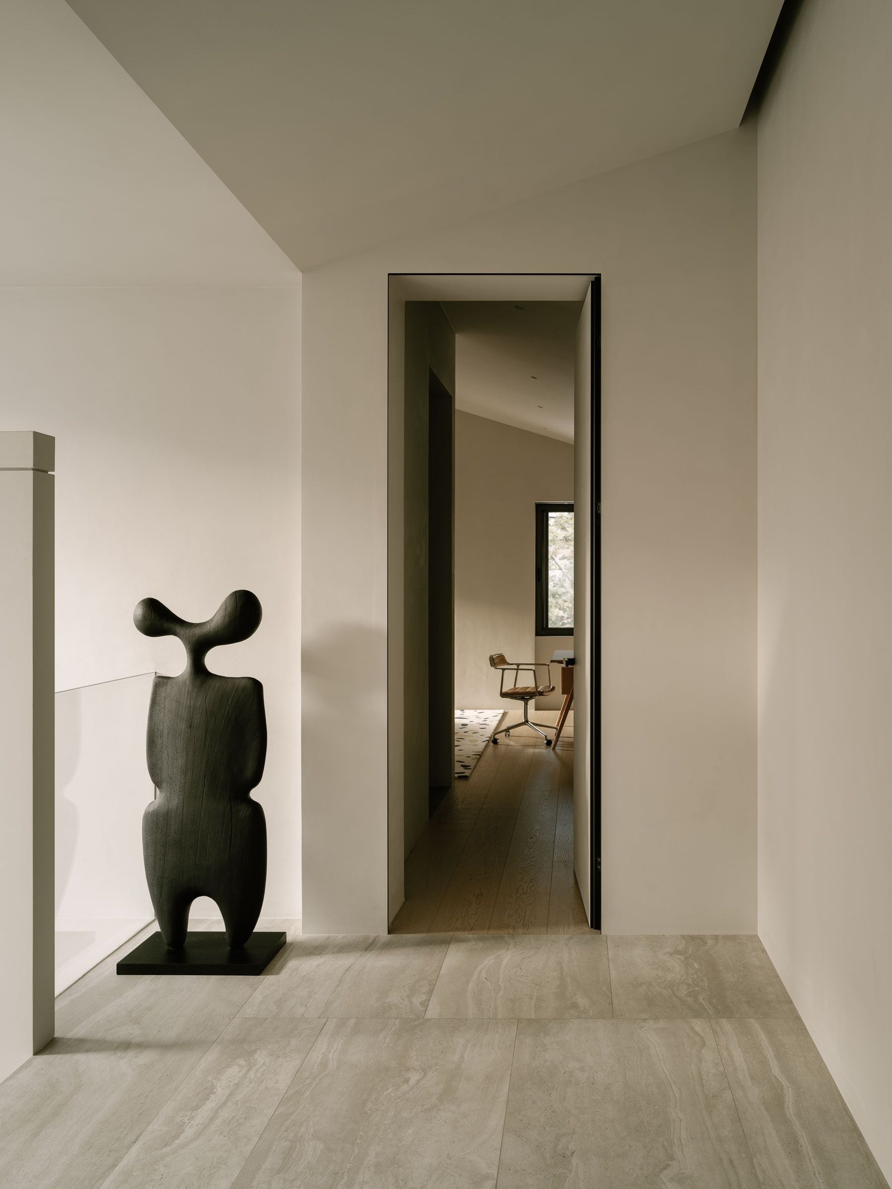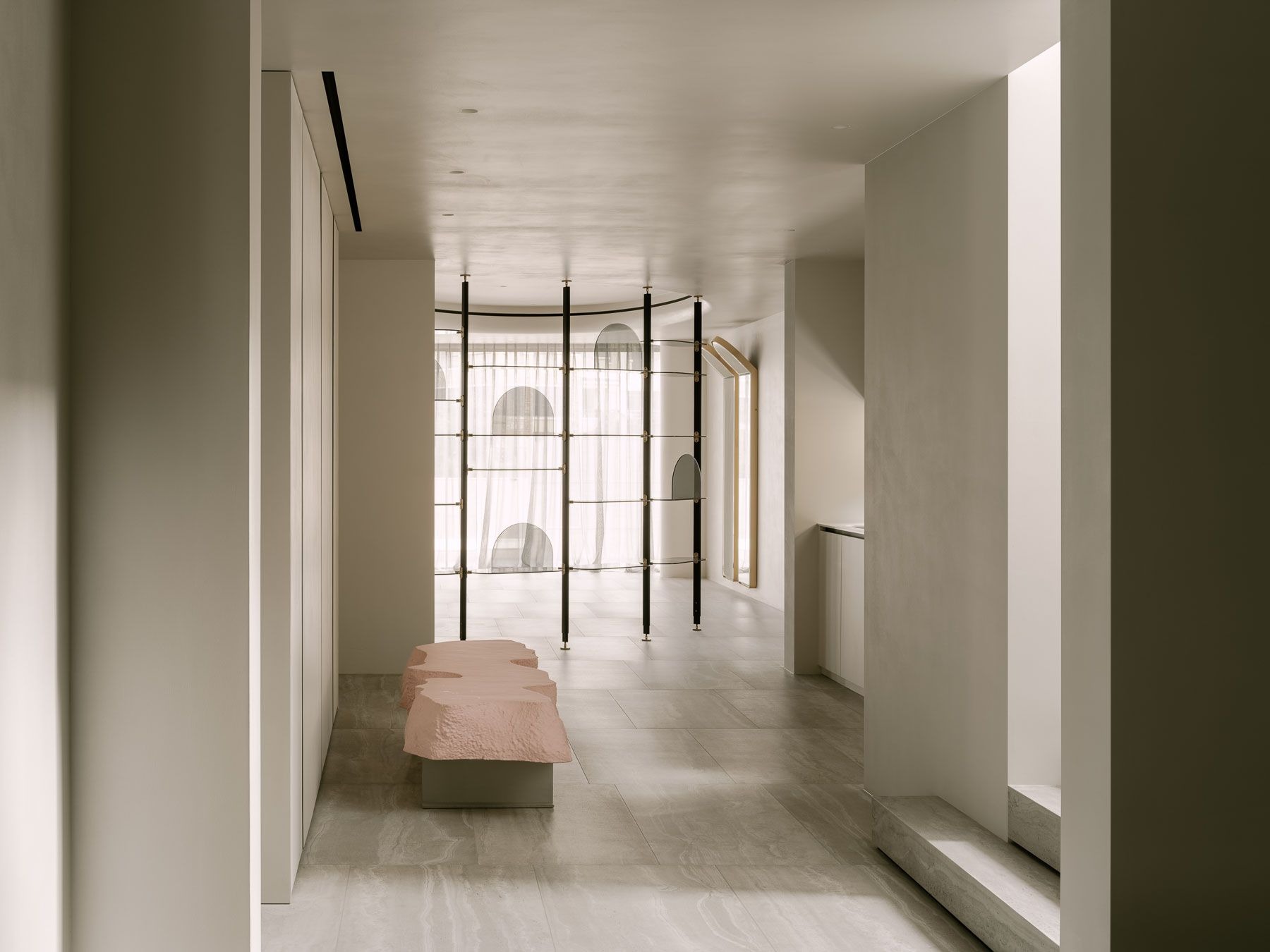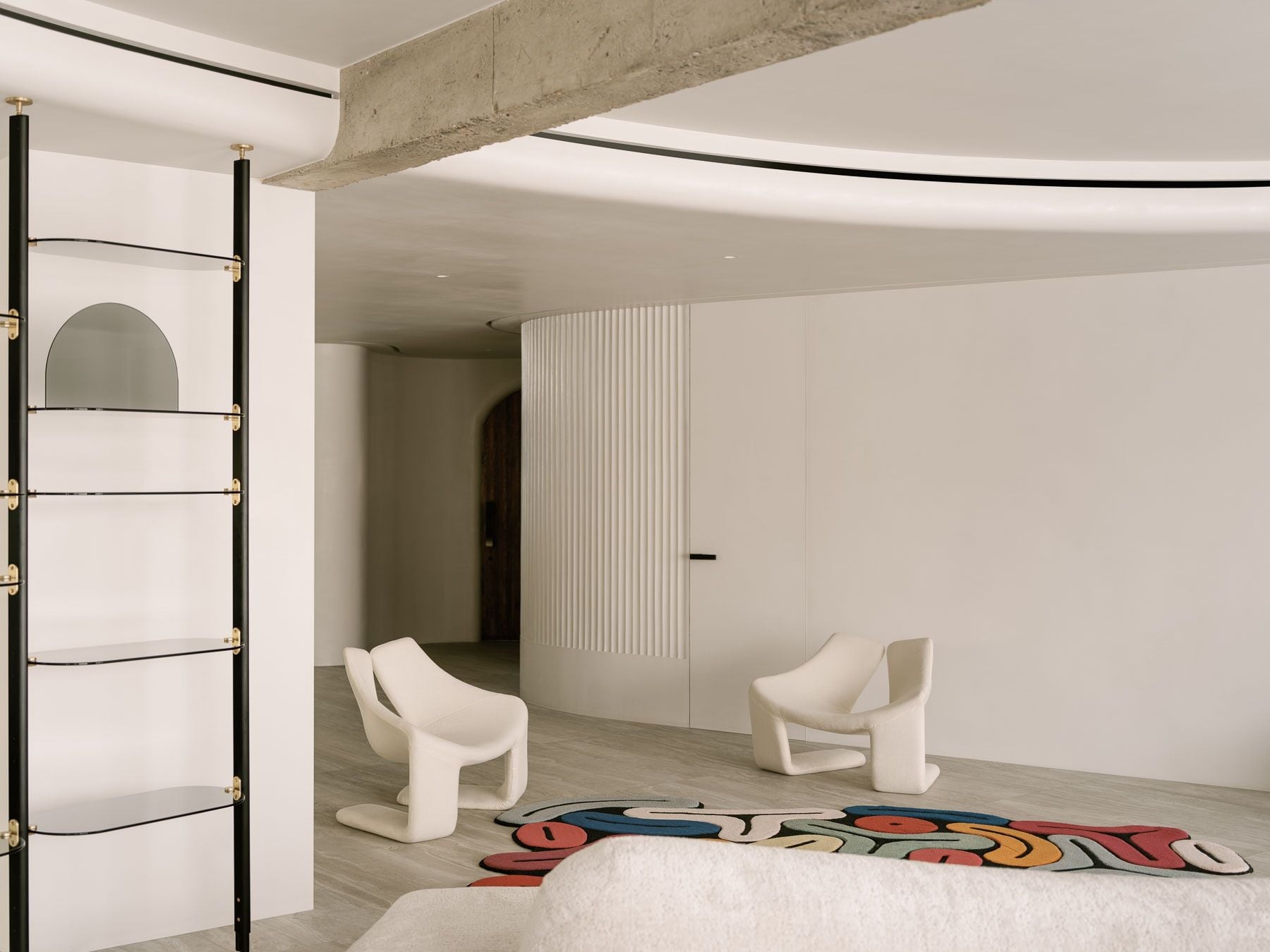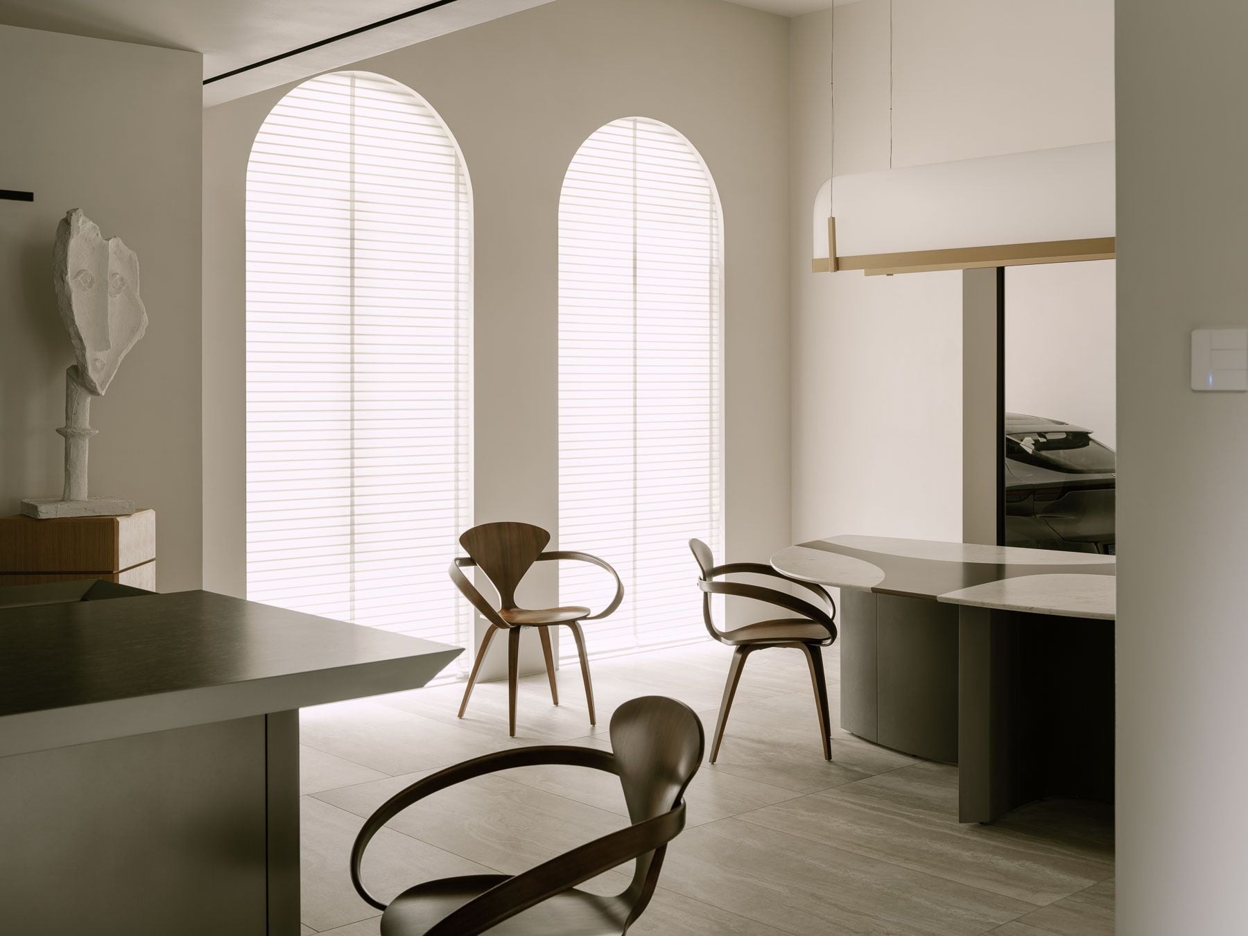 Inside, it’s a different story altogether. What was once a decorative pastiche is now a pared back environment of minimalist sophistication defined by flowing lines, textured surfaces, and a monochromatic palette. Drawing from the language of automotive aerodynamics, in what is a nod to the owner’s passion for cars, every wall, ceiling, and built-in element is shaped in continuity. Sinuous partitions, rounded corners, and curvaceous bulkheads blur the boundaries between rooms, creating a sense of motion and fluidity, while arched openings and sculptural furnishings amplify the home’s spatial rhythm.