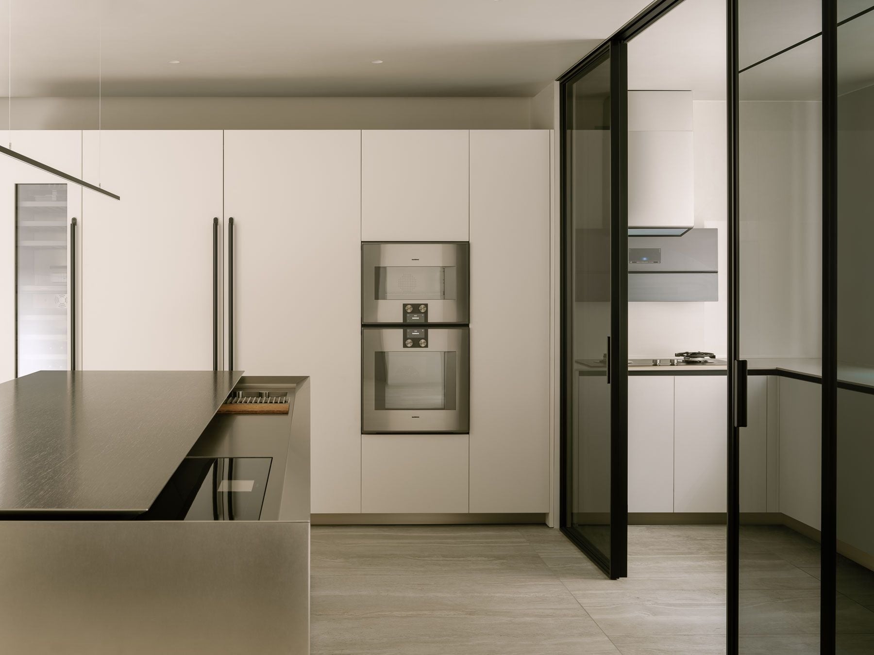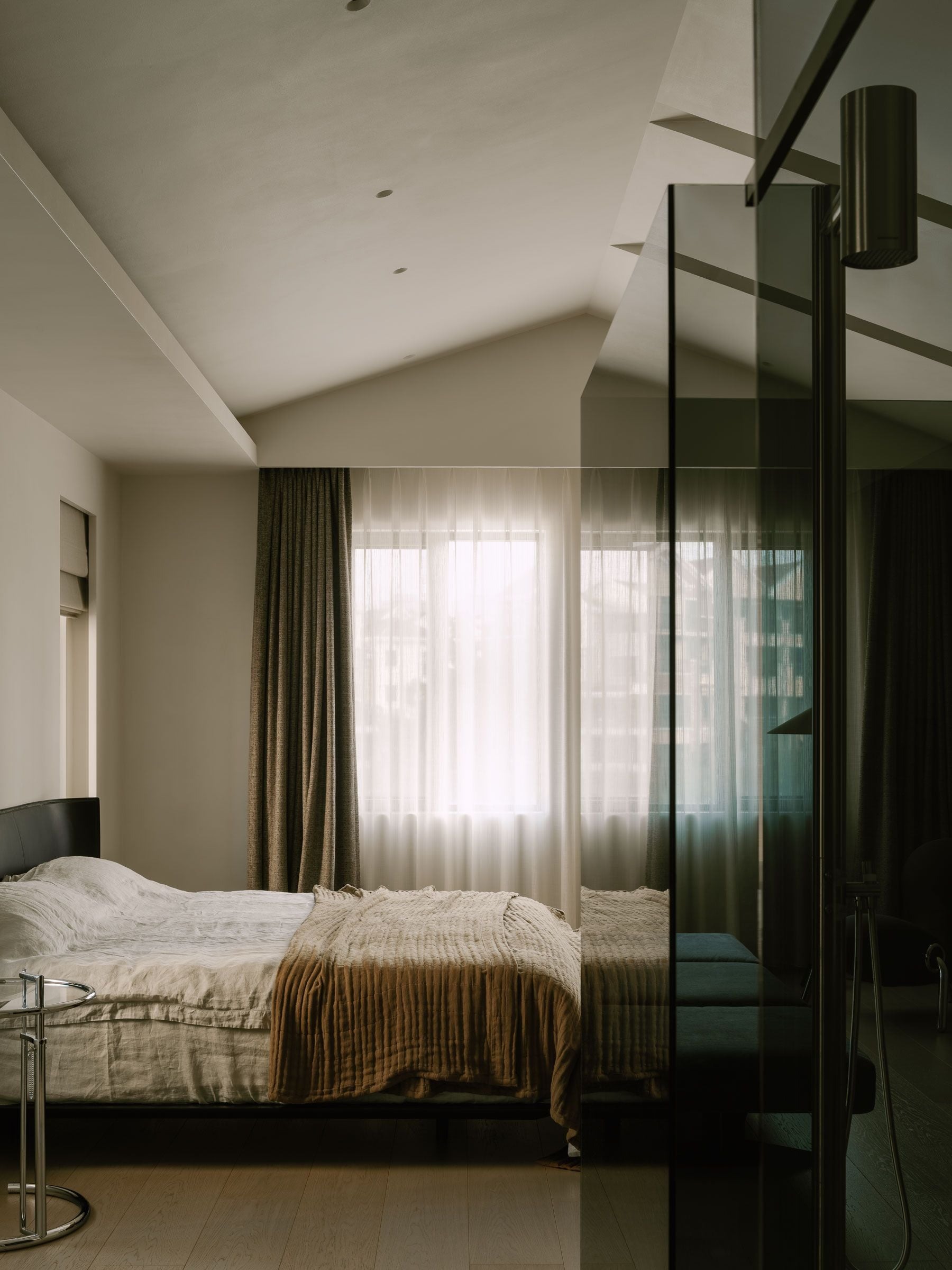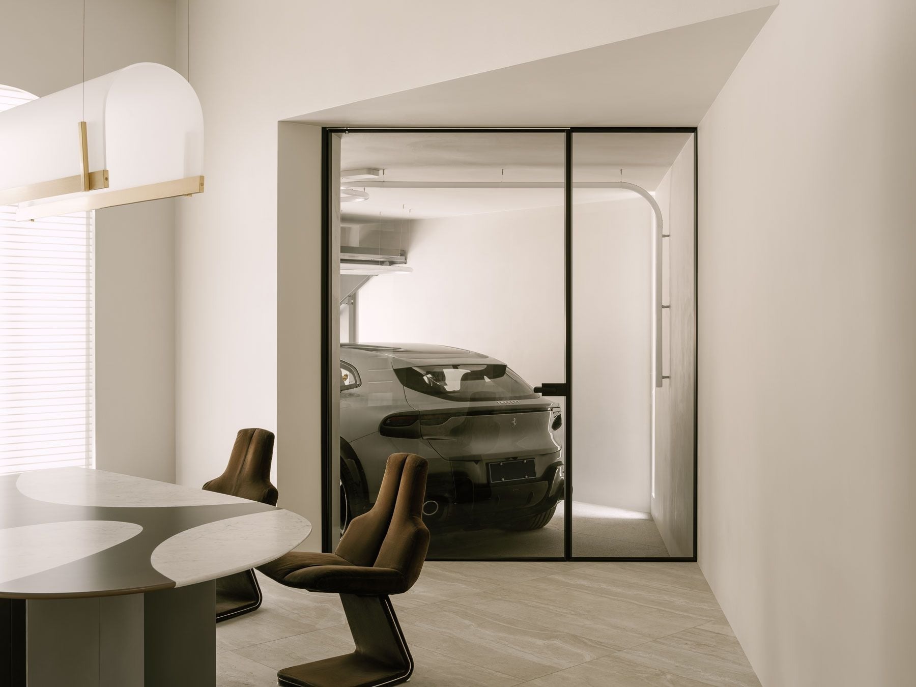 내부는 전혀 다른 이야기다. 한때 장식이 뒤섞인 공간은 이제 흐르는 선과 질감 있는 표면, 모노크롬 팔레트로 만들어진 미니멀한 세련미의 환경이 되었다. 건축주의 자동차 열정을 담아 유선형 곡선을 끌어온 이 공간에서는 모든 벽과 천장, 붙박이 요소가 끊김 없이 이어진다. 물 흐르듯 휘어진 칸막이, 둥근 모서리, 부드러운 천장 곡면이 방과 방 사이의 경계를 흐릿하게 만들며 움직임과 유동성의 감각을 만들어낸다. 아치형 개구부와 조각적 가구가 집의 공간 리듬을 더한다.