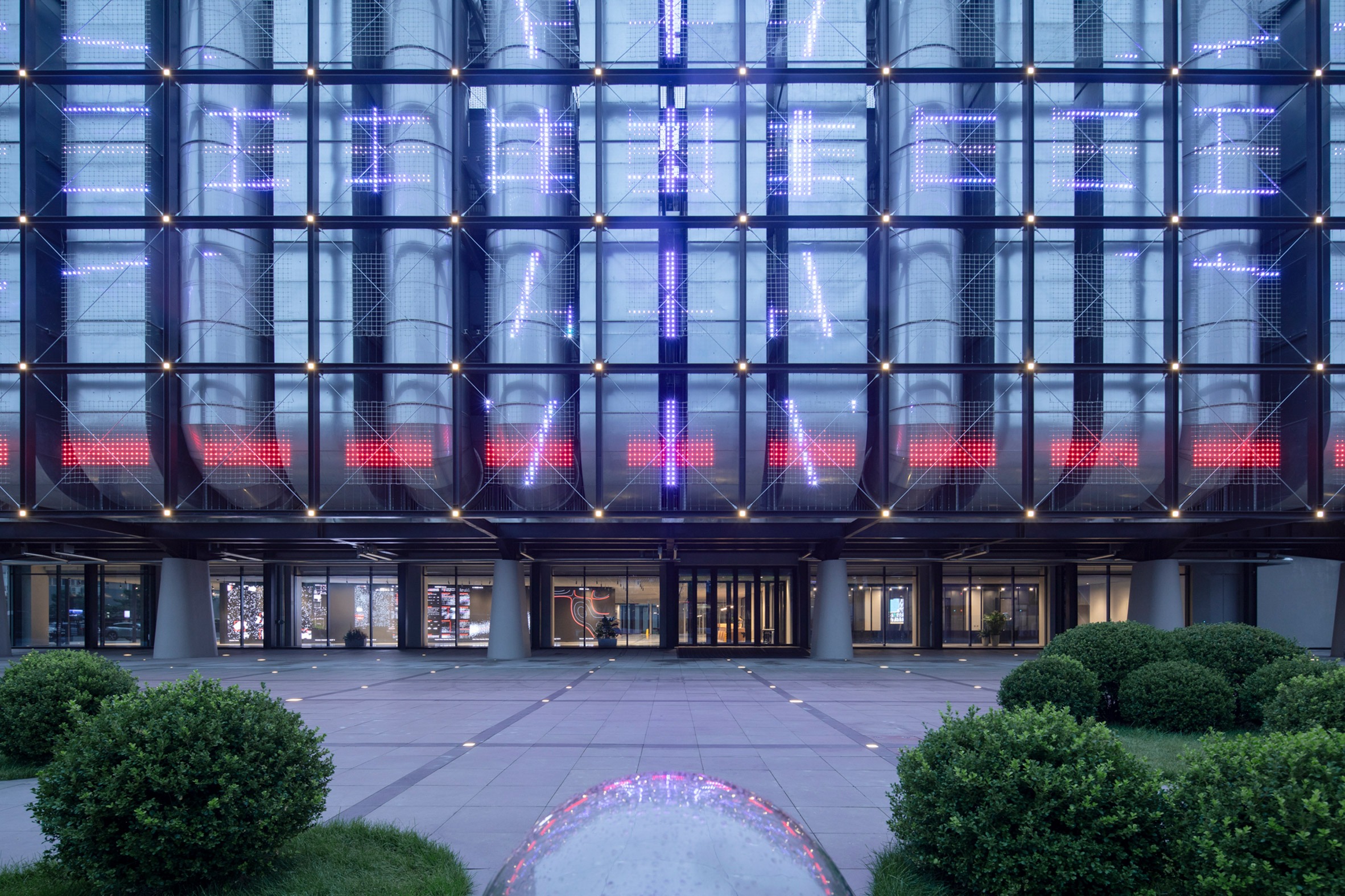 넓은 공공 광장 앞에 선 건물은 첫눈에 그 정체를 드러낸다. 거대한 원통형 냉각 덕트들이 파사드의 주인공이다. 서버의 열을 식히기 위해 필수적인 이 시설을 LLLAB은 숨기는 대신 그대로 노출시켰다. 강철 그리드가 건물 전체를 감싸고, 그 안에 LED 네팅을 채웠다. 낮 동안 건물은 투명한 격자 너머로 은빛 덕트들을 드러내며 단단한 실체로 다가온다. 밤이 되면 LED가 켜지며 건물은 완전히 다른 얼굴을 보인다. 청백색이던 빛이 뜨거운 적색으로 변모하면서 형태가 사라지며 도시의 디지털 풍경 속으로 녹아든다.