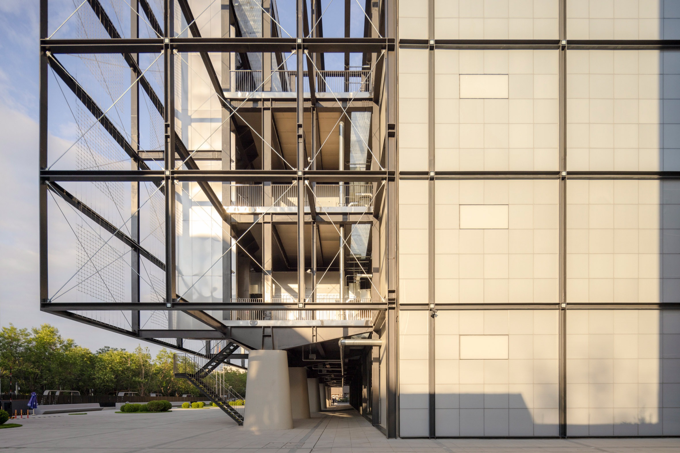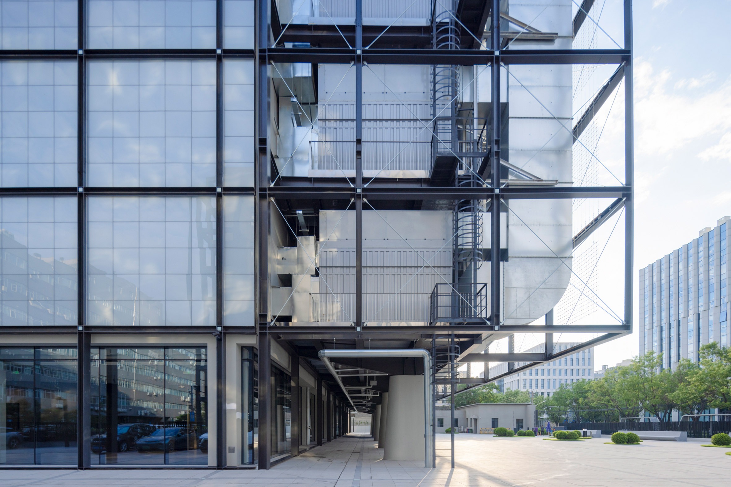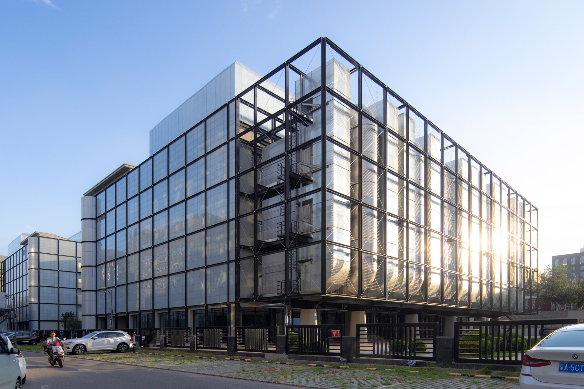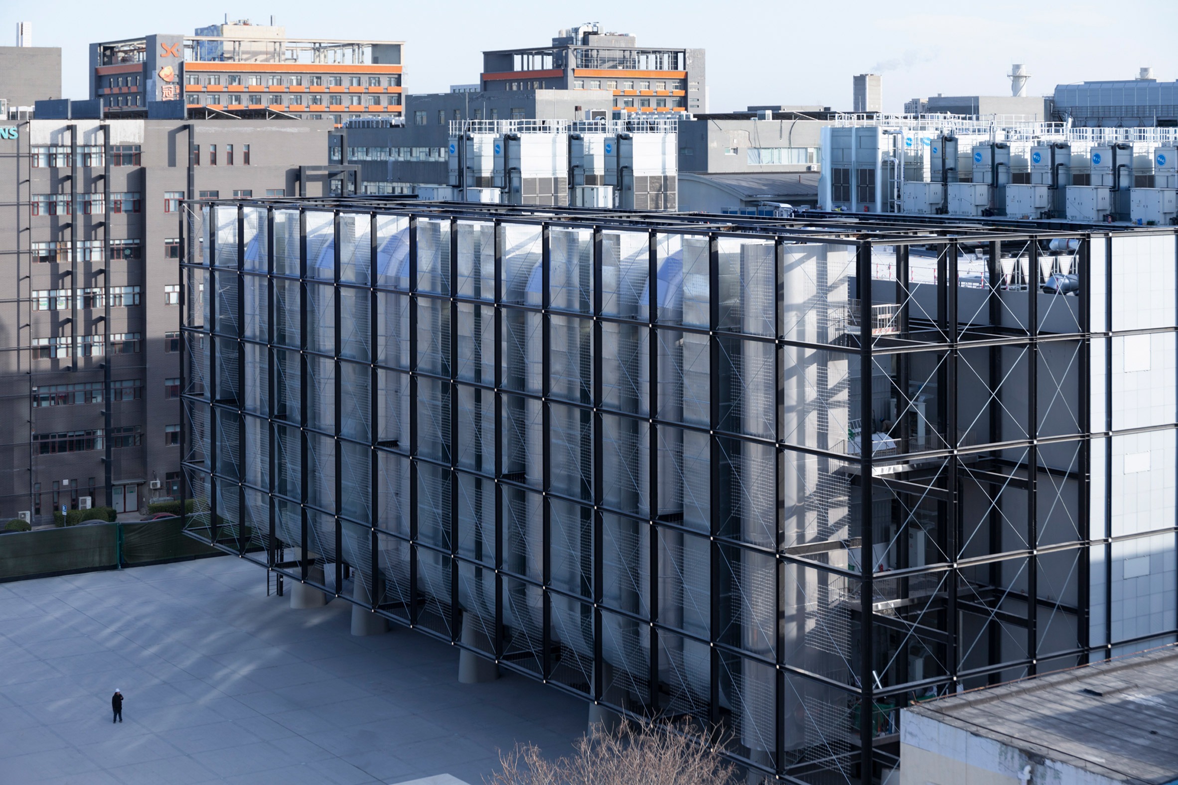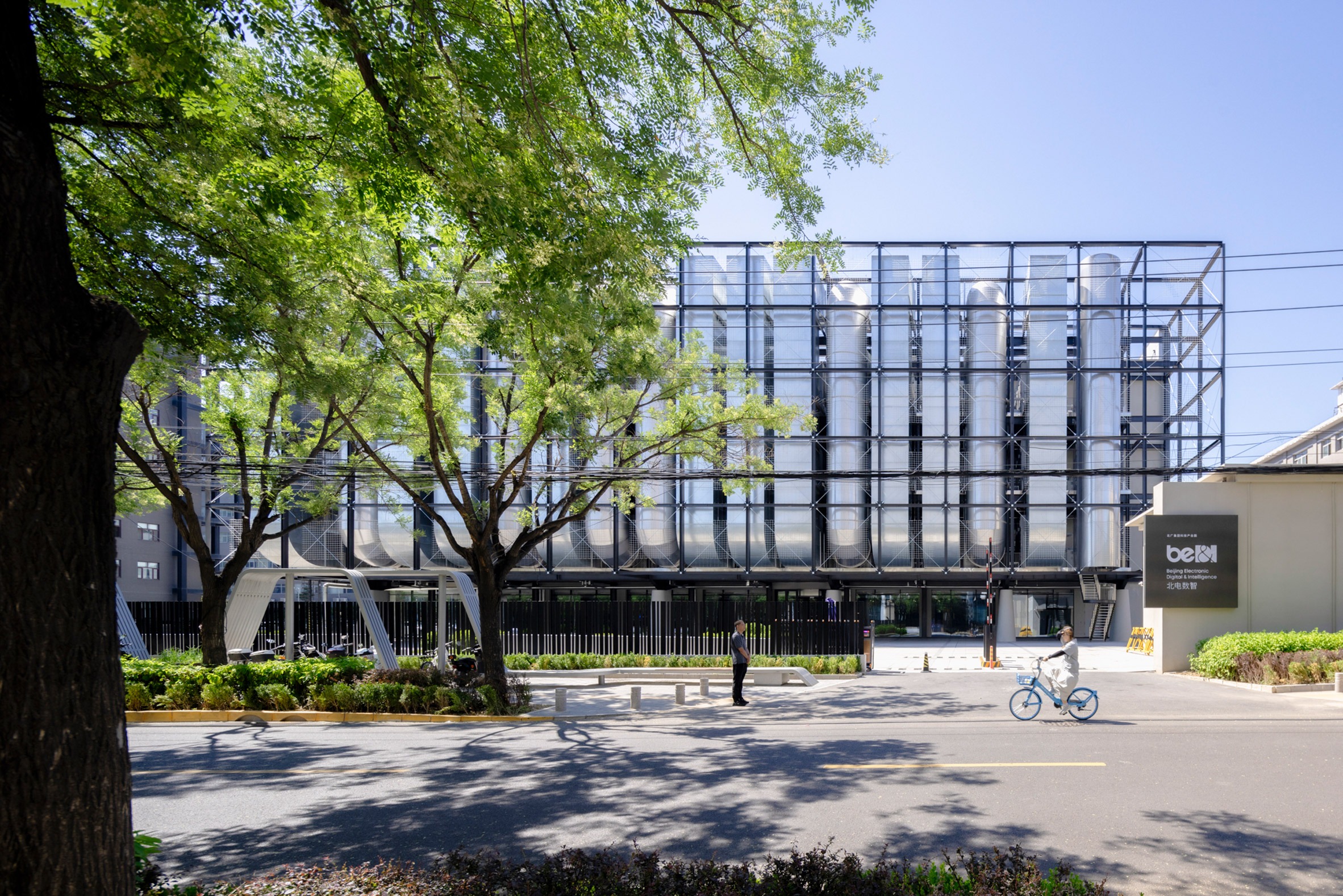 Located within Beijing's 798 Art District, the building was designed as an alternative to the traditionally closed-off typology of the data centre, instead allowing the infrastructure to co-exist with public and office facilities.
