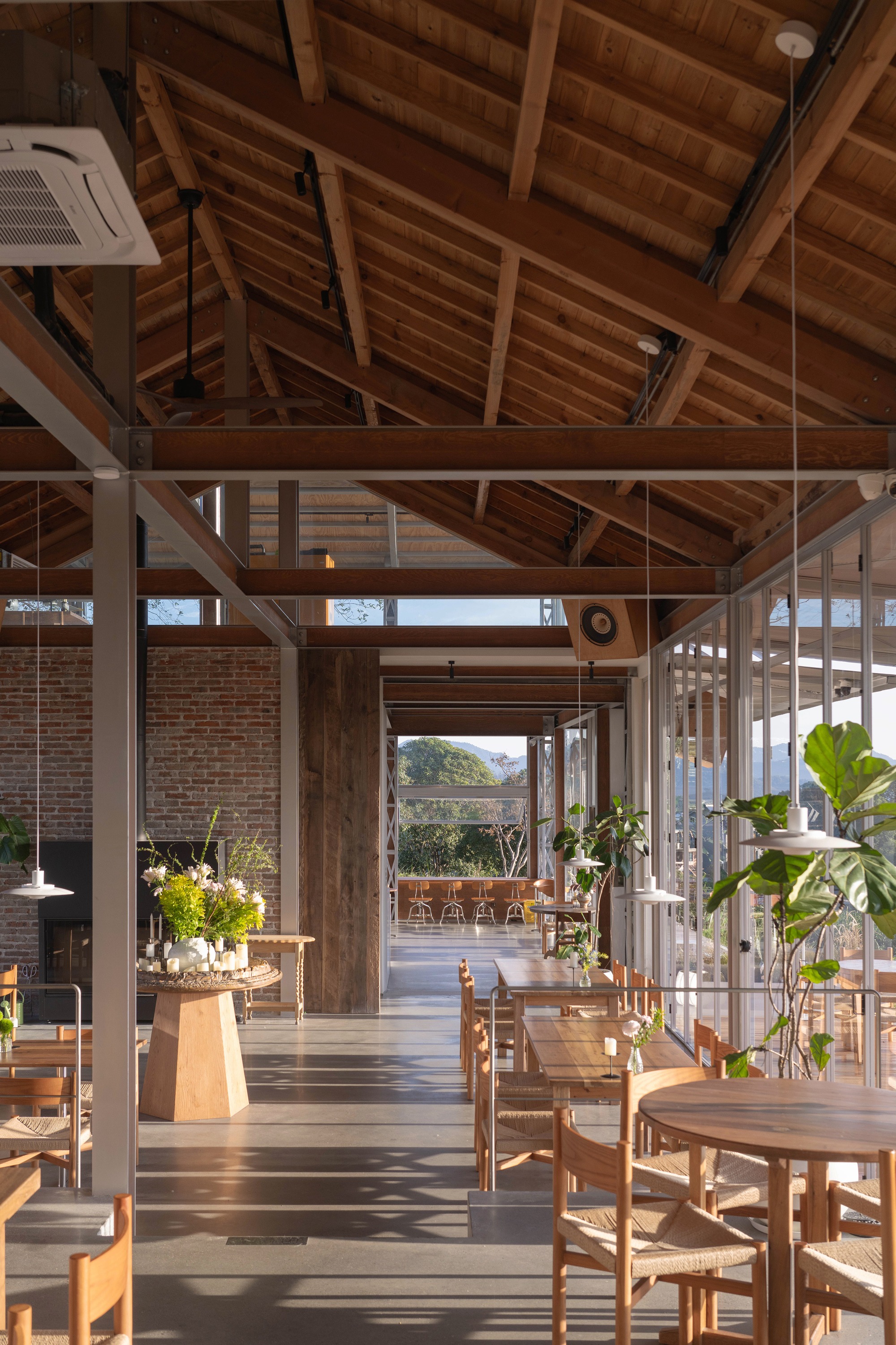 The beautiful tea garden landscape around the building makes the design consider ensuring the transparent indoor and outdoor vision as much as possible, so as to introduce the tea garden landscape into the interior without reservation. In addition to the necessary structural frame and local functional space partition walls, the remaining walls of the architectural design are all designed as highly transparent white glass partitions and folding doors and windows.