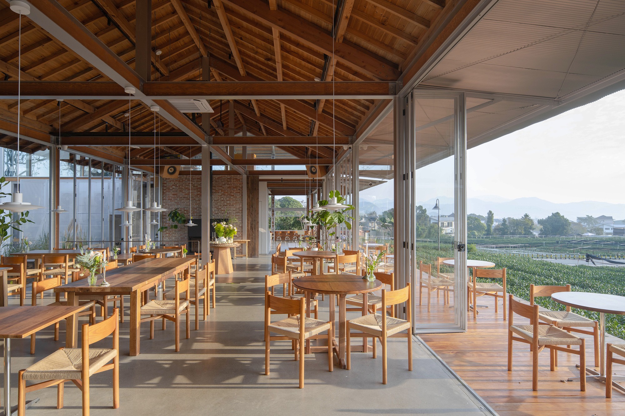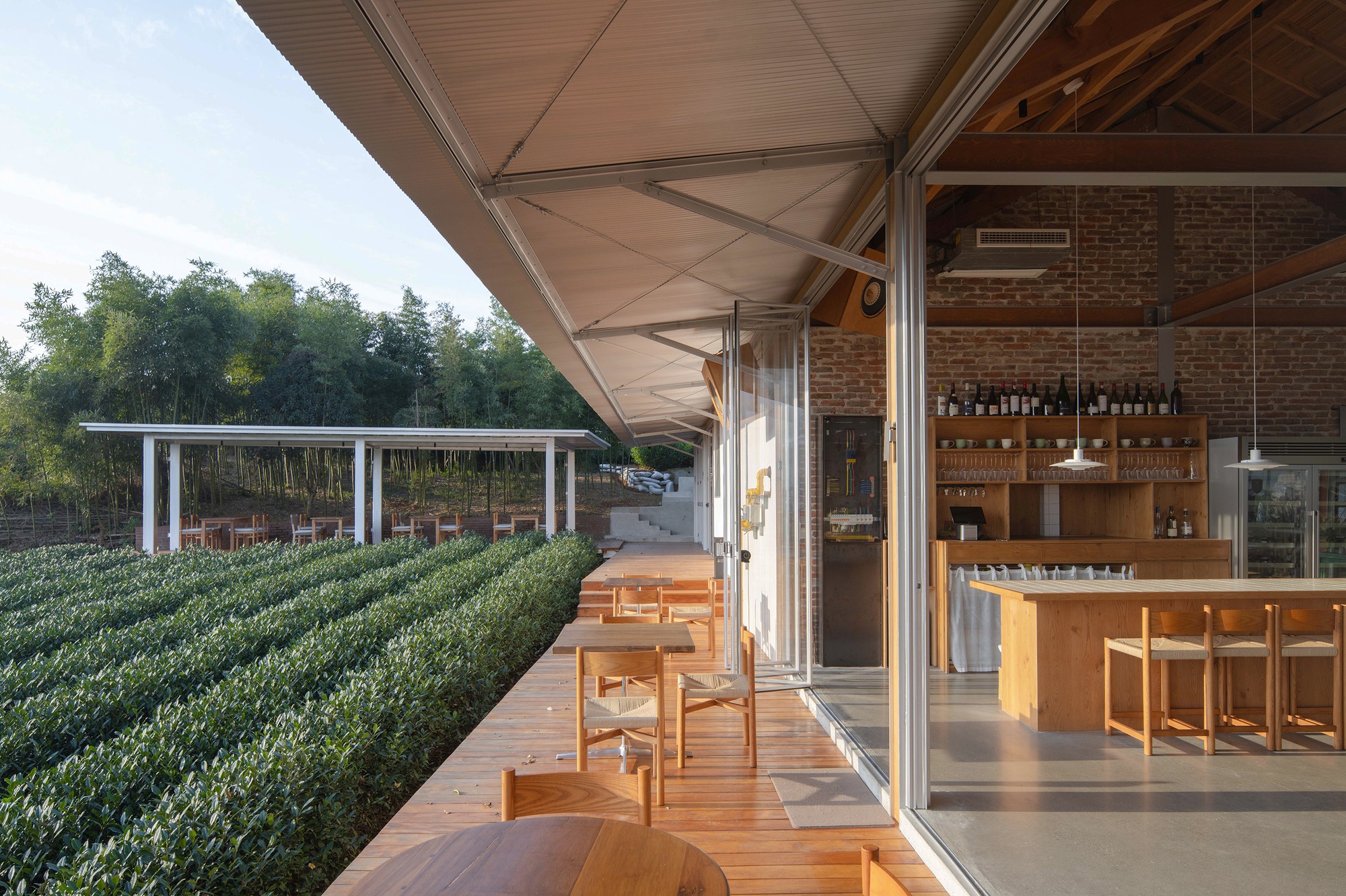 건물을 감싸고 있는 아름다운 차밭 경관은 설계의 핵심 과제가 되었다. 설계팀은 차밭 풍경을 실내로 온전히 끌어들이기 위해 최대한 투명한 시야를 확보하고자 했다. 구조 프레임과 필수적인 기능 공간의 칸막이를 제외한 나머지 벽체는 모두 투명한 유리 파티션과 폴딩 도어, 창호로 설계되었다. 건물 동쪽과 북쪽에는 금속 캔틸레버 처마를 설치하여 회랑을 만들었다. 이 중간 영역은 실내와 실외를 자연스럽게 연결한다. 동시에 식당의 좌석도 늘려주며, 공간 활용도를 높인다.