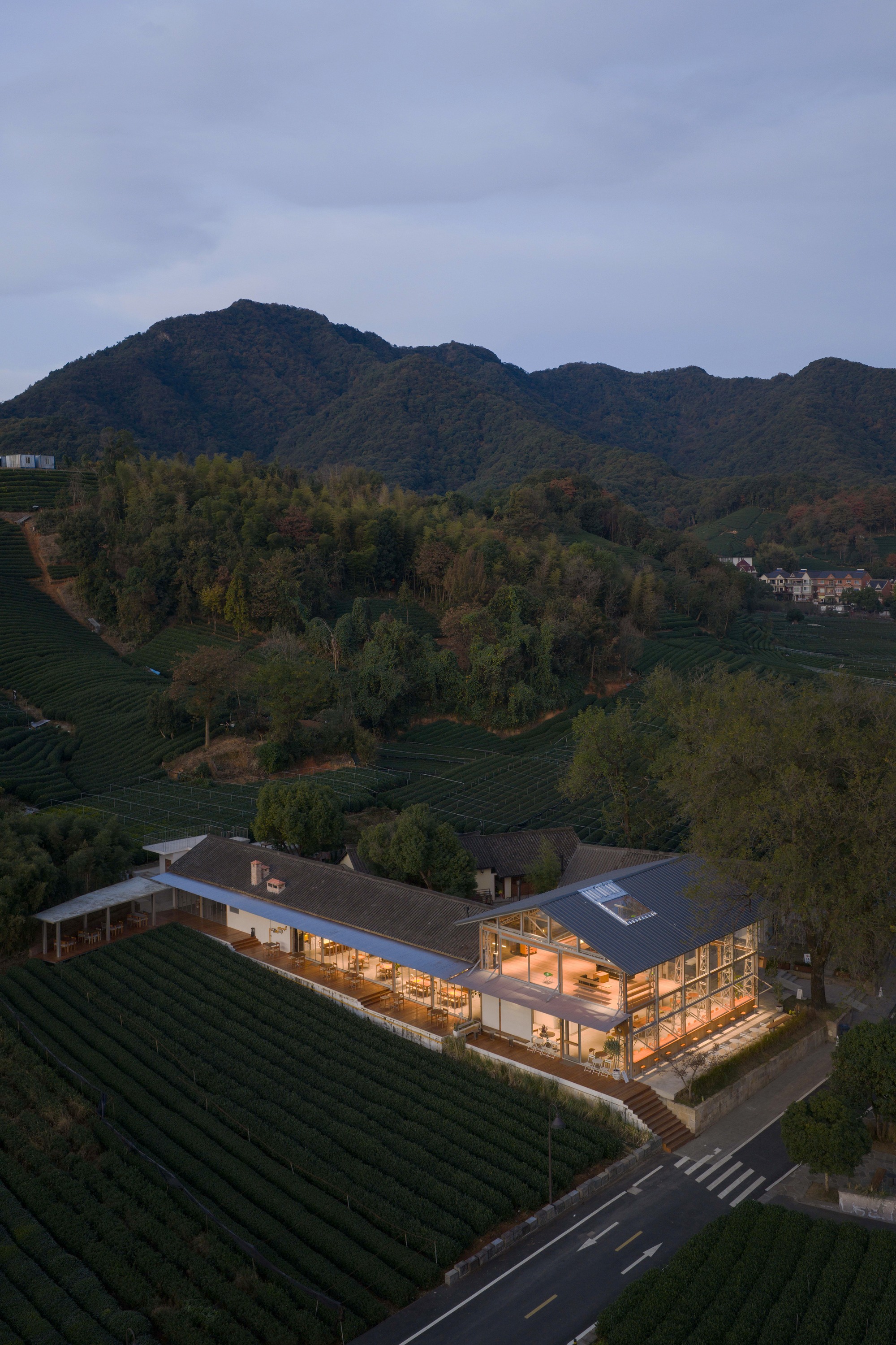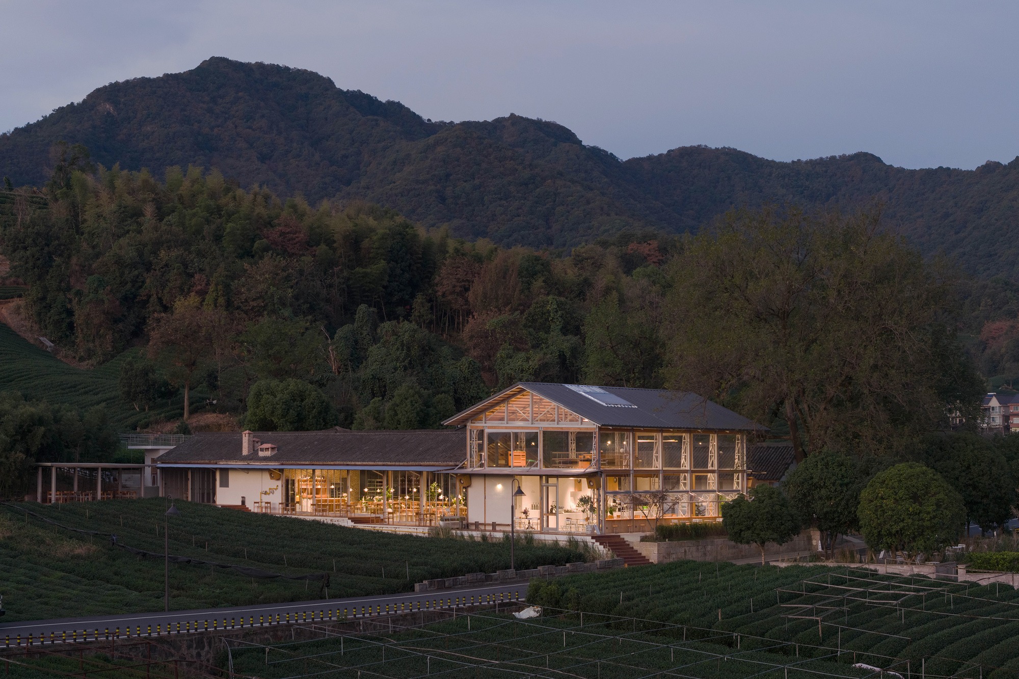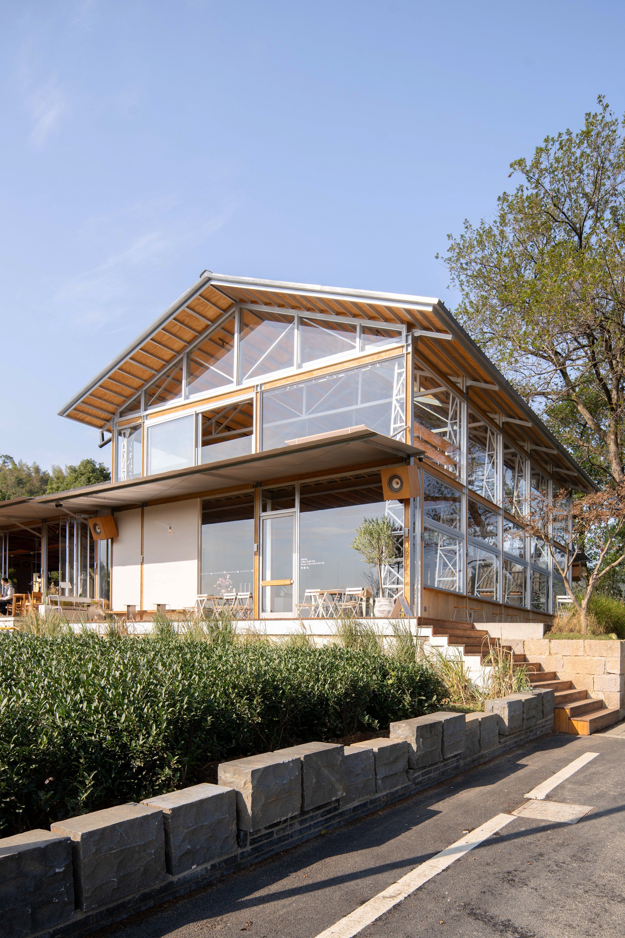 The building is a combination of blocks with high and low juxtaposition in a straight north-south shape. The first-floor building near the low tea hill in the south is designed as a kitchen and dining room, and the second floor building with a wide view in the north is designed as a coffee shop. Several huge trees in the west of the site can reduce indoor energy consumption in hot summer, which creates favorable conditions for the design of large-area glass floor-to-ceiling windows. The lower terrain in the northeast of the building can be seen by tea gardens and villages in the distance.