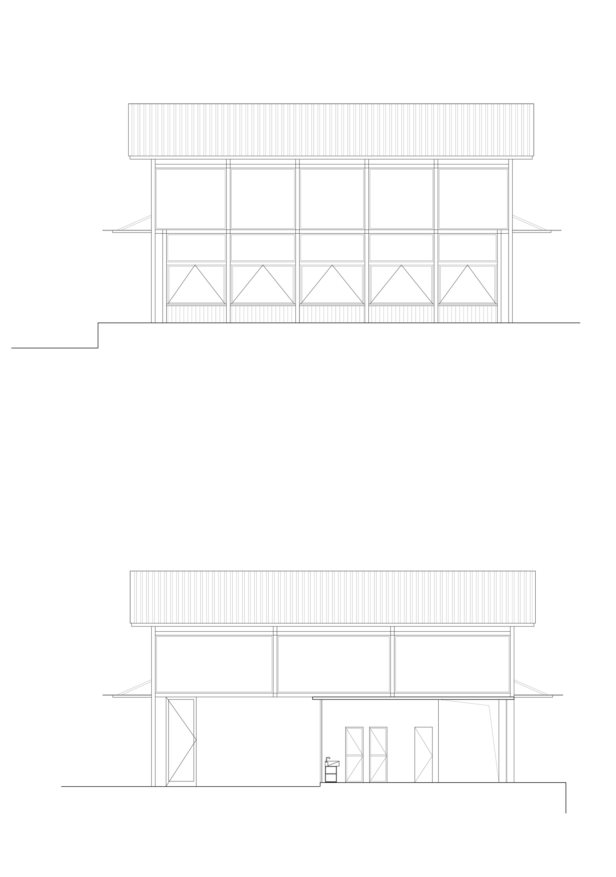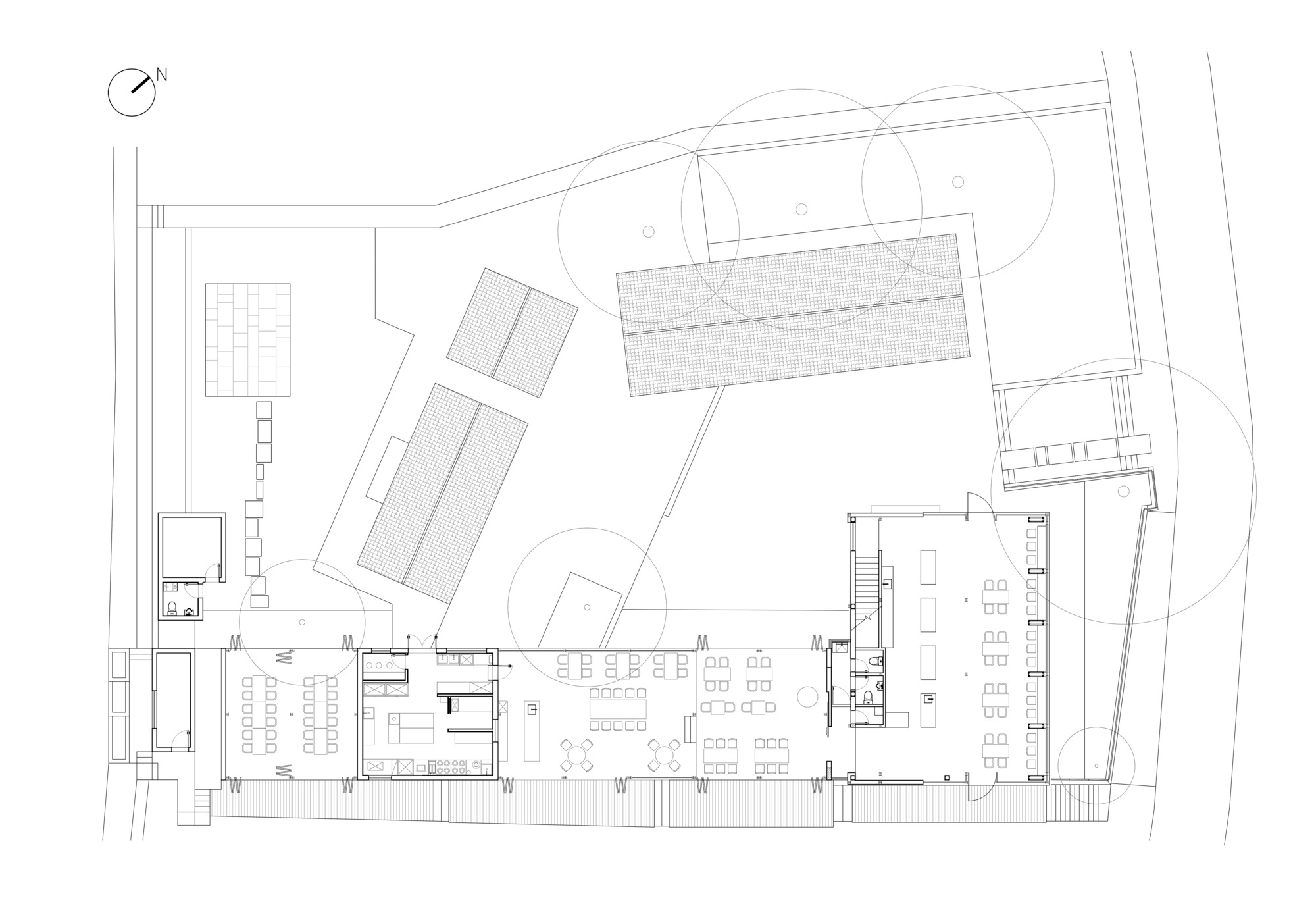 차밭 사이로 난 길을 따라가면 유리와 철골의 두 건물이 남북으로 나란히 서 있다. 낮은 차밭 언덕 가까이 자리한 남쪽 건물은 1층 규모의 주방과 식당으로, 북쪽의 탁 트인 조망을 품은 2층 건물은 카페 공간으로 계획되었다. 대지 서쪽에 자리한 몇 그루의 거대한 나무는 한여름 뜨거운 햇살을 막아주며, 덕분에 건물 전면에 큰 유리창을 낼 수 있었다. 건물 북동쪽의 낮은 지형 너머로는 원경의 차밭과 마을 풍경이 시원하게 펼쳐진다.