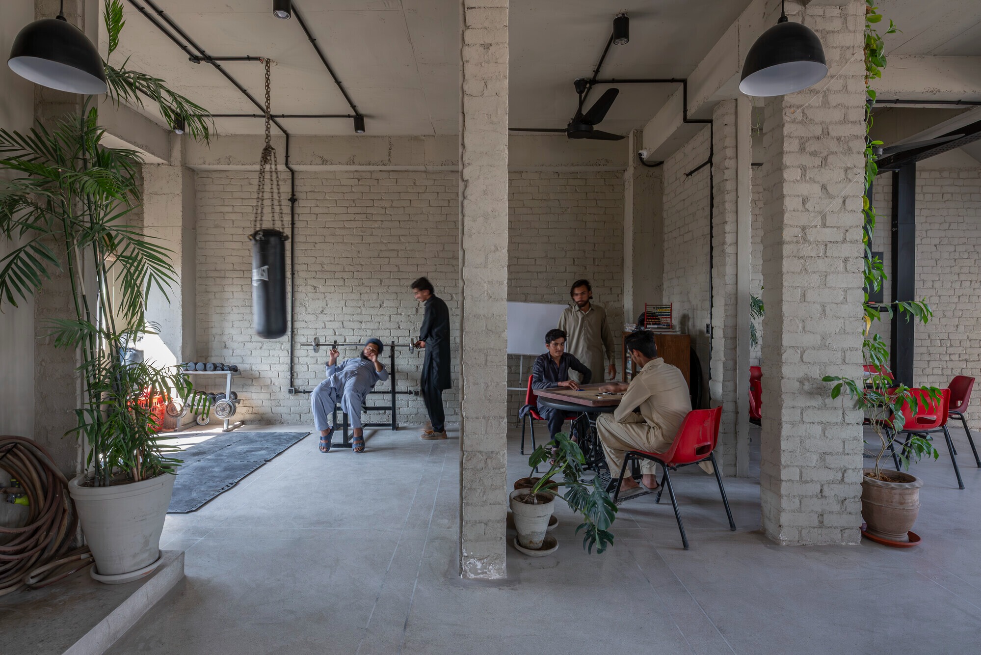재료 선택은 저비용, 내구성, 사용자 참여를 중심에 두었다. 철근 콘크리트 골조와 노출 콘크리트, 드러난 벽돌, 수성 페인트가 주를 이룬다. 기계/전기/배관 설비는 감추지 않고 드러냈고, 테라조 바닥과 내부 청소가 쉽도록 설계한 알루미늄 창호를 사용했다.