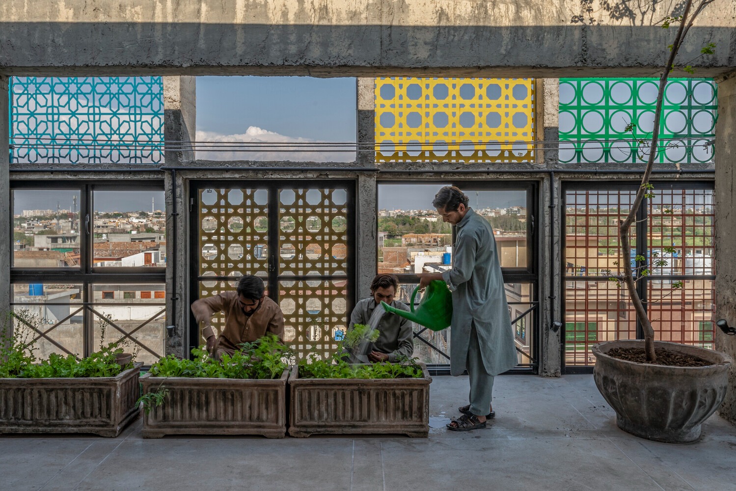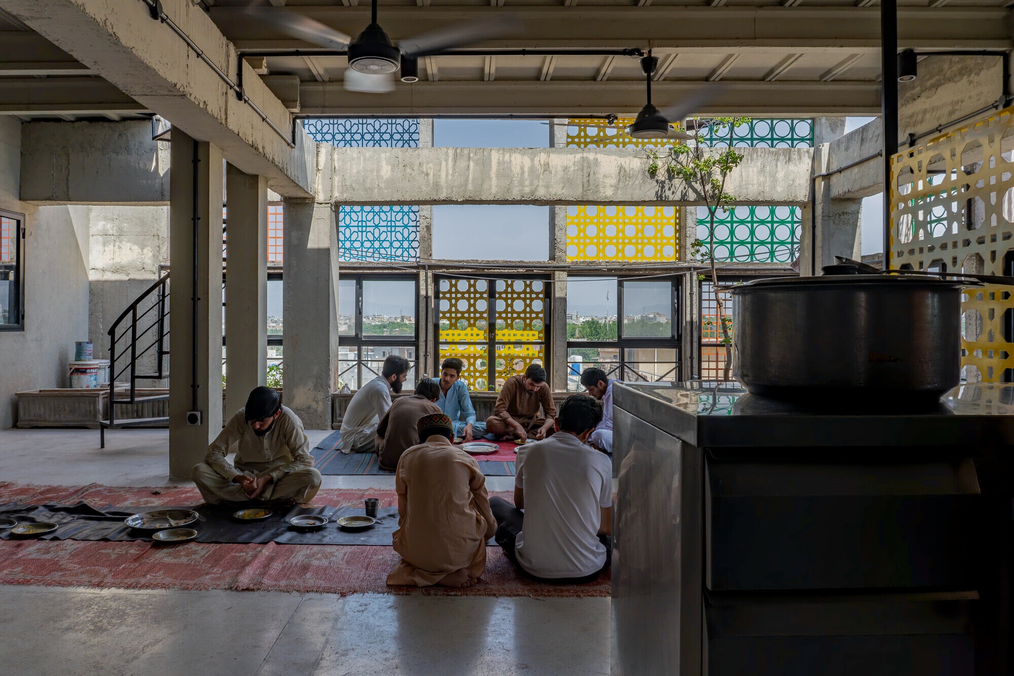 파키스탄 이슬라마바드 외곽, Ghauri Town의 비정형적으로 밀집된 도시 풍경 속에서 한 건물이 눈길을 사로잡는다. 노란색과 청록색, 주황색과 초록색으로 물든 자알리 스크린이 회색 콘크리트 골조를 감싼 6층 건물. 이곳은 비전 파키스탄 복지재단이 운영하는 직업훈련 교육원이다.