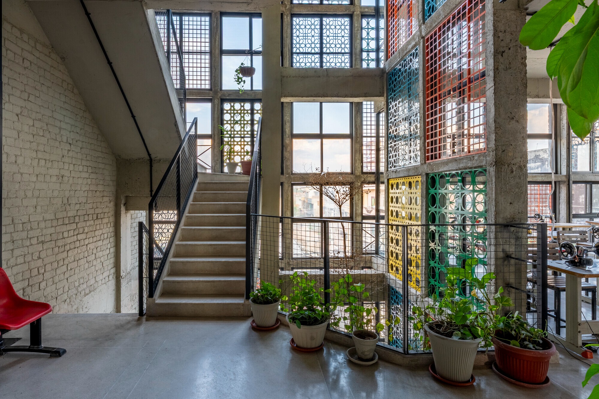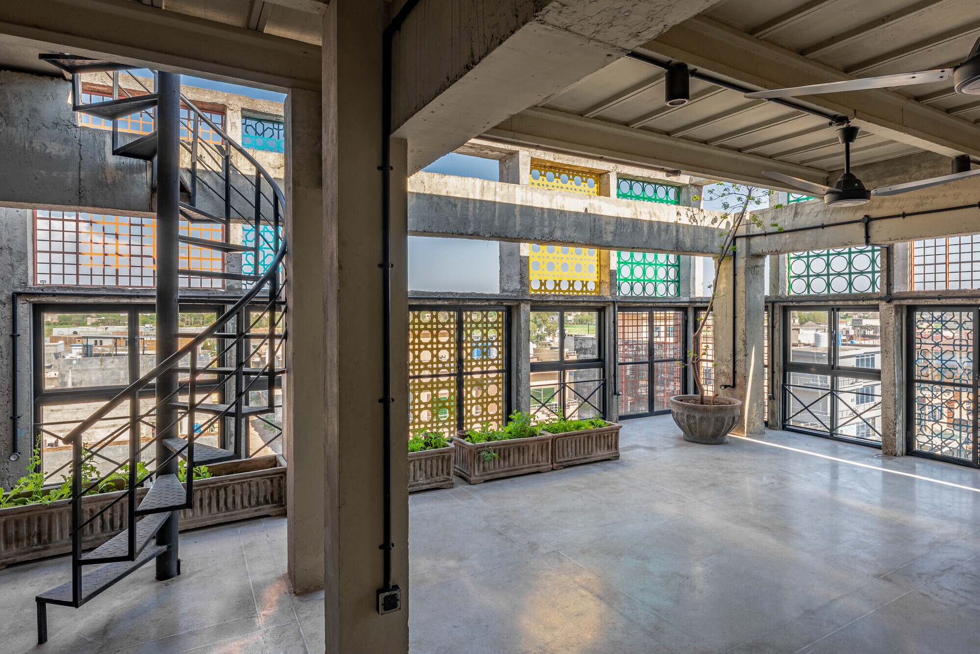 Materials emphasize low cost, durability, and user engagement: RCC frame, fair face concrete, exposed brick, distemper, exposed MEP, terrazzo flooring, aluminum windows designed for easy inside cleaning, and colorful geometric metal jaali screens referencing local culture, Pakistani crafts, Islamic patterns, and 1960s Islamabad modernism.