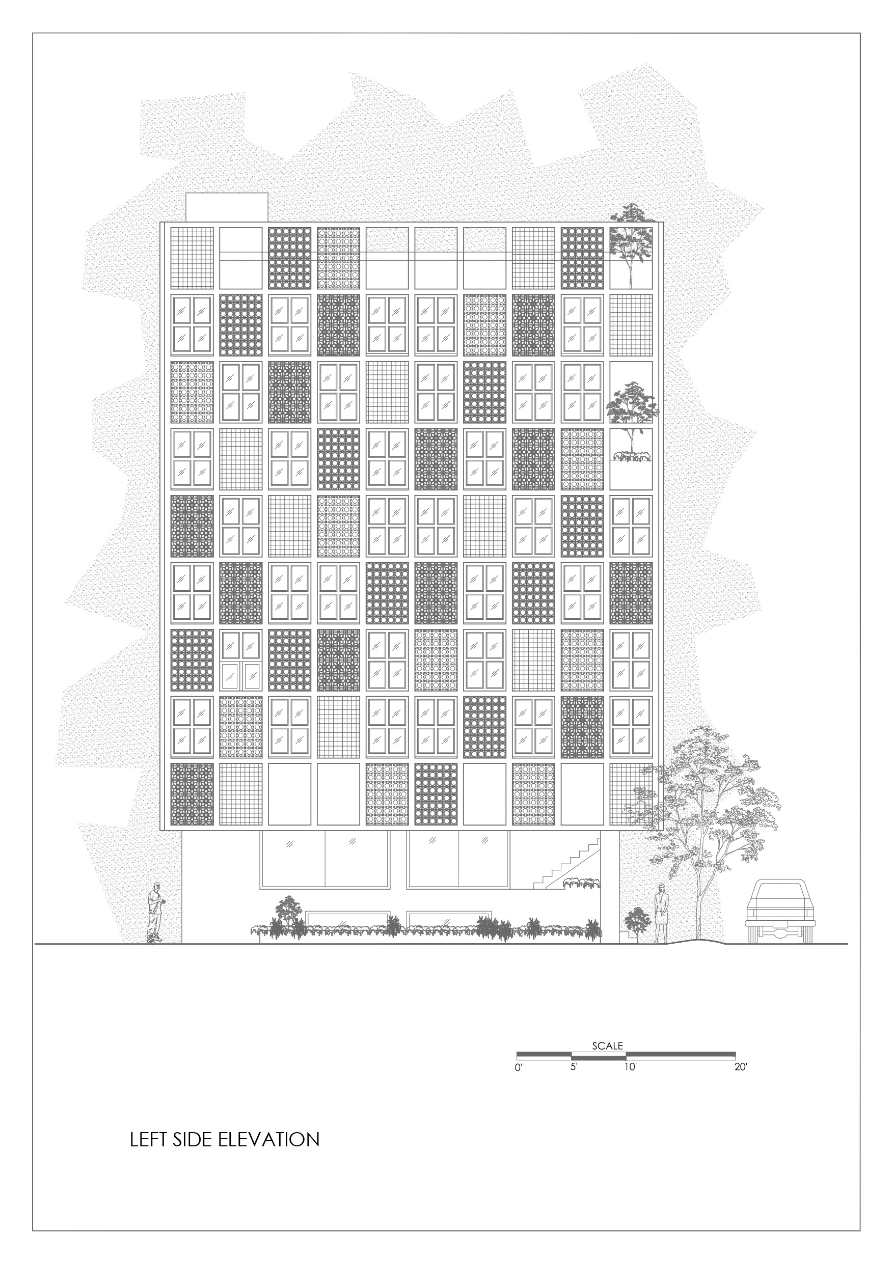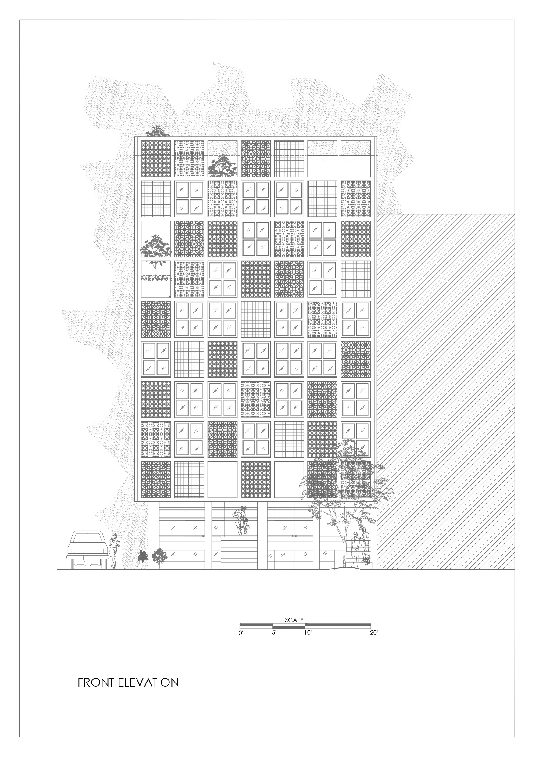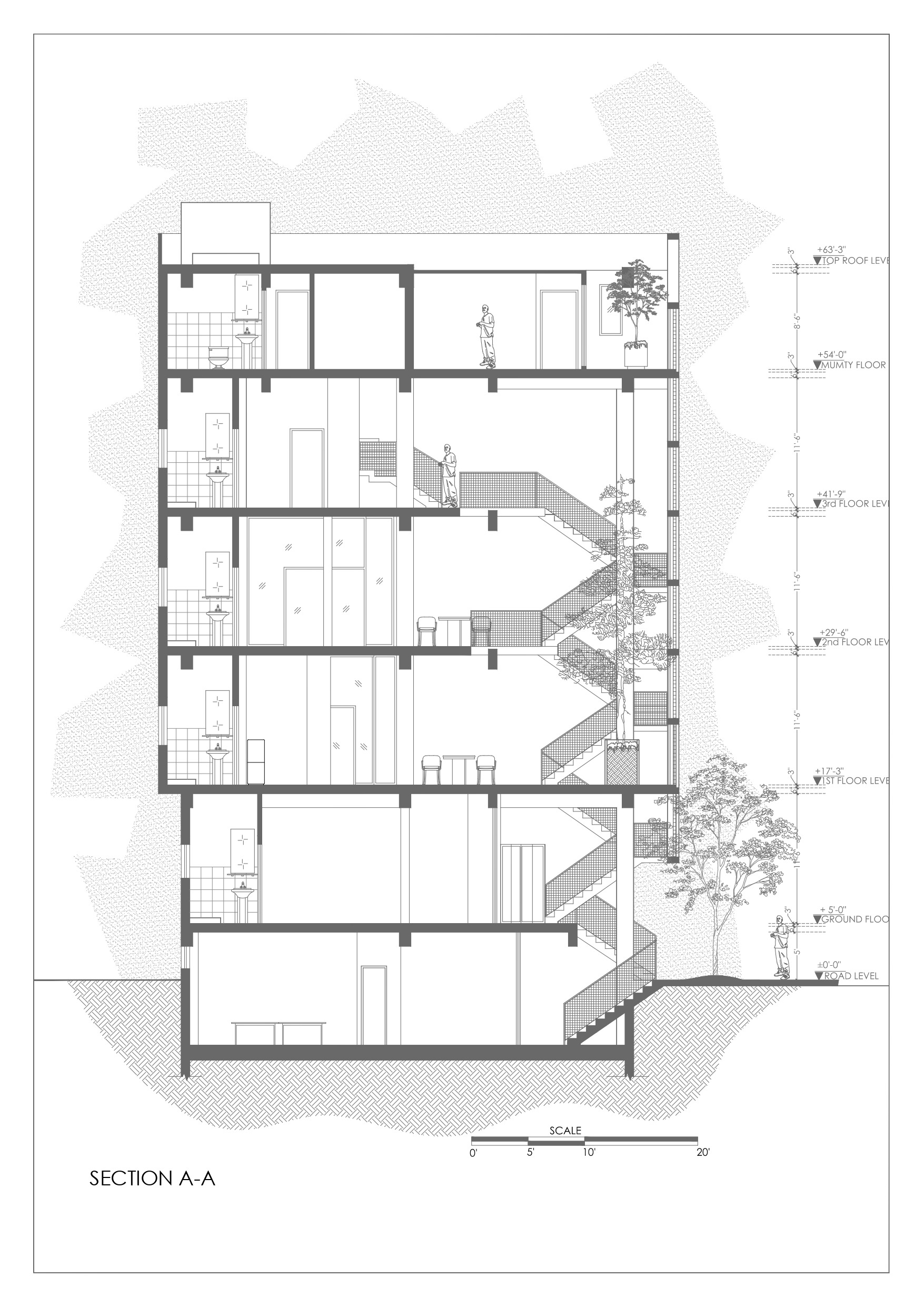 Located on a 130 sqm corner lot on Ghauri Road, the site sits in a dense, informal peri-urban context of mixed use plazas, small houses, vendors, and eclectic architecture. The building maximizes the full volume allowed, using a central vertical core enabling independent floor operation for revenue generation. Lower/upper ground levels include rentable retail/exhibition spaces and parking. Upper floors contain classrooms (on the east for daylight/ventilation), offices, washrooms, multipurpose halls, and a triple-height atrium with a tall anchor tree enhancing ventilation and unity. The top floor includes staff quarters, a dining hall, terraces, a prayer area, and a kitchen garden.