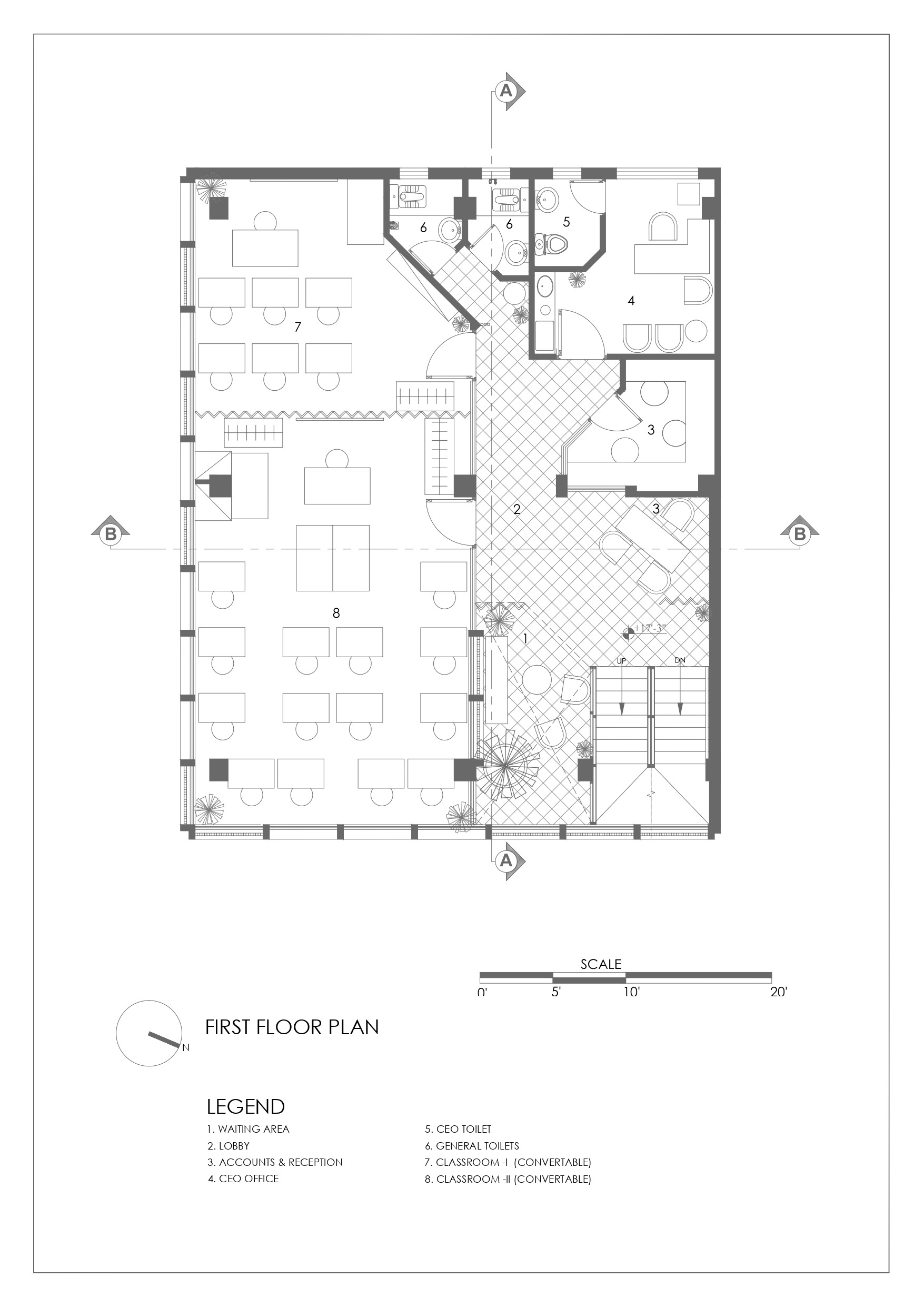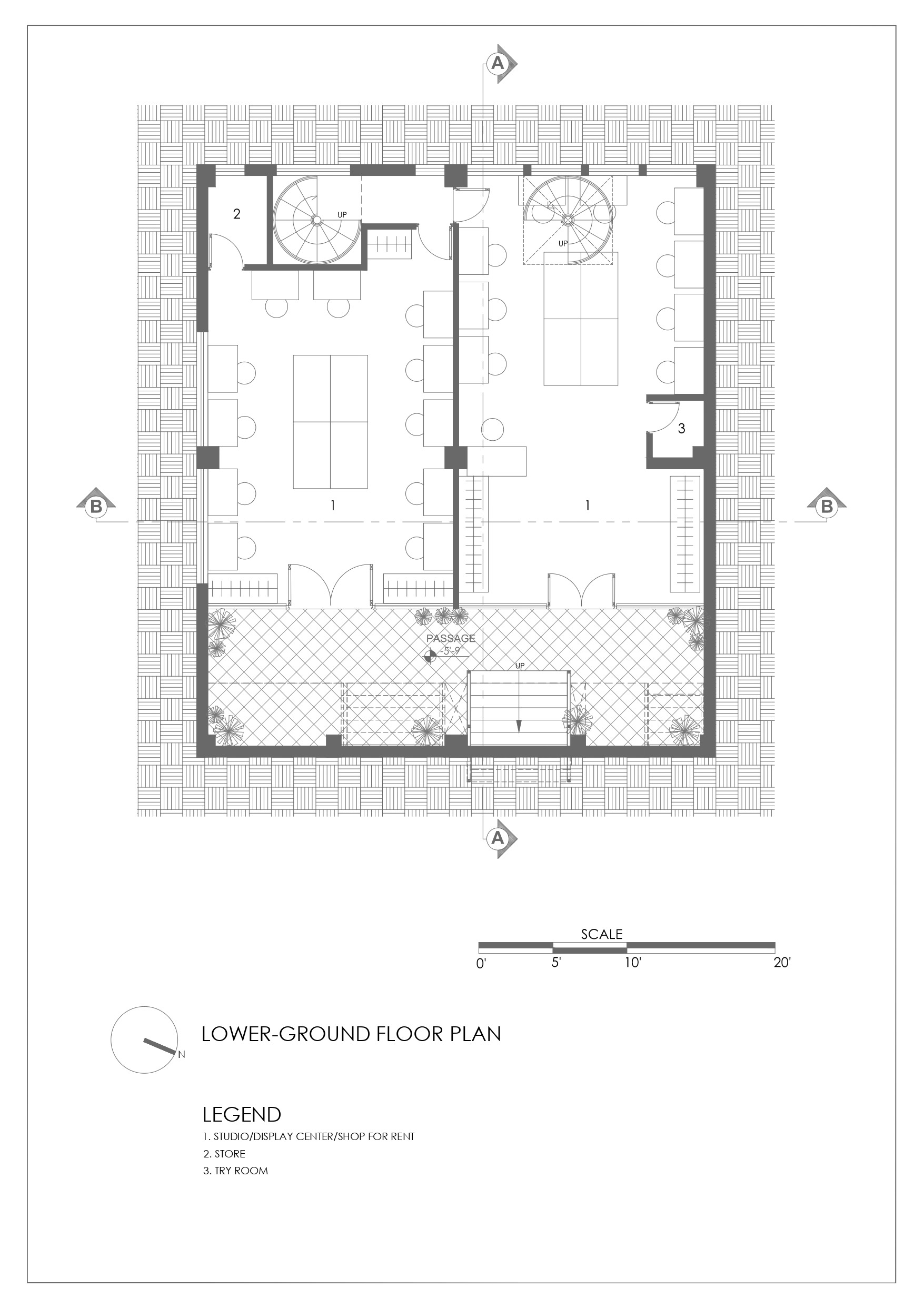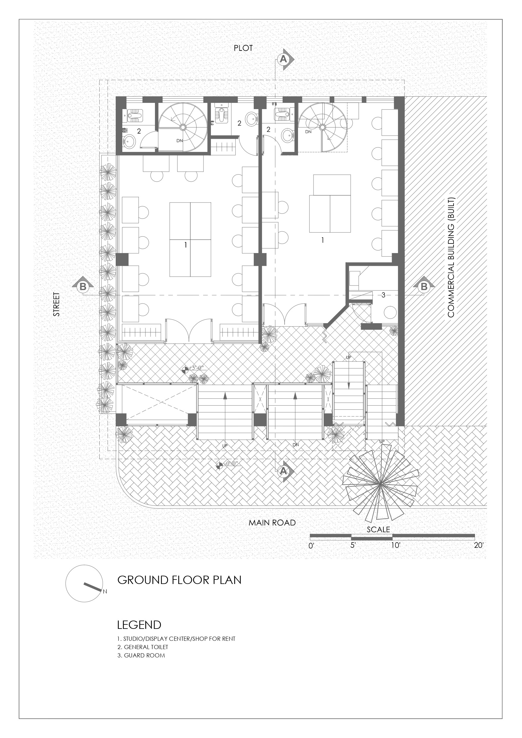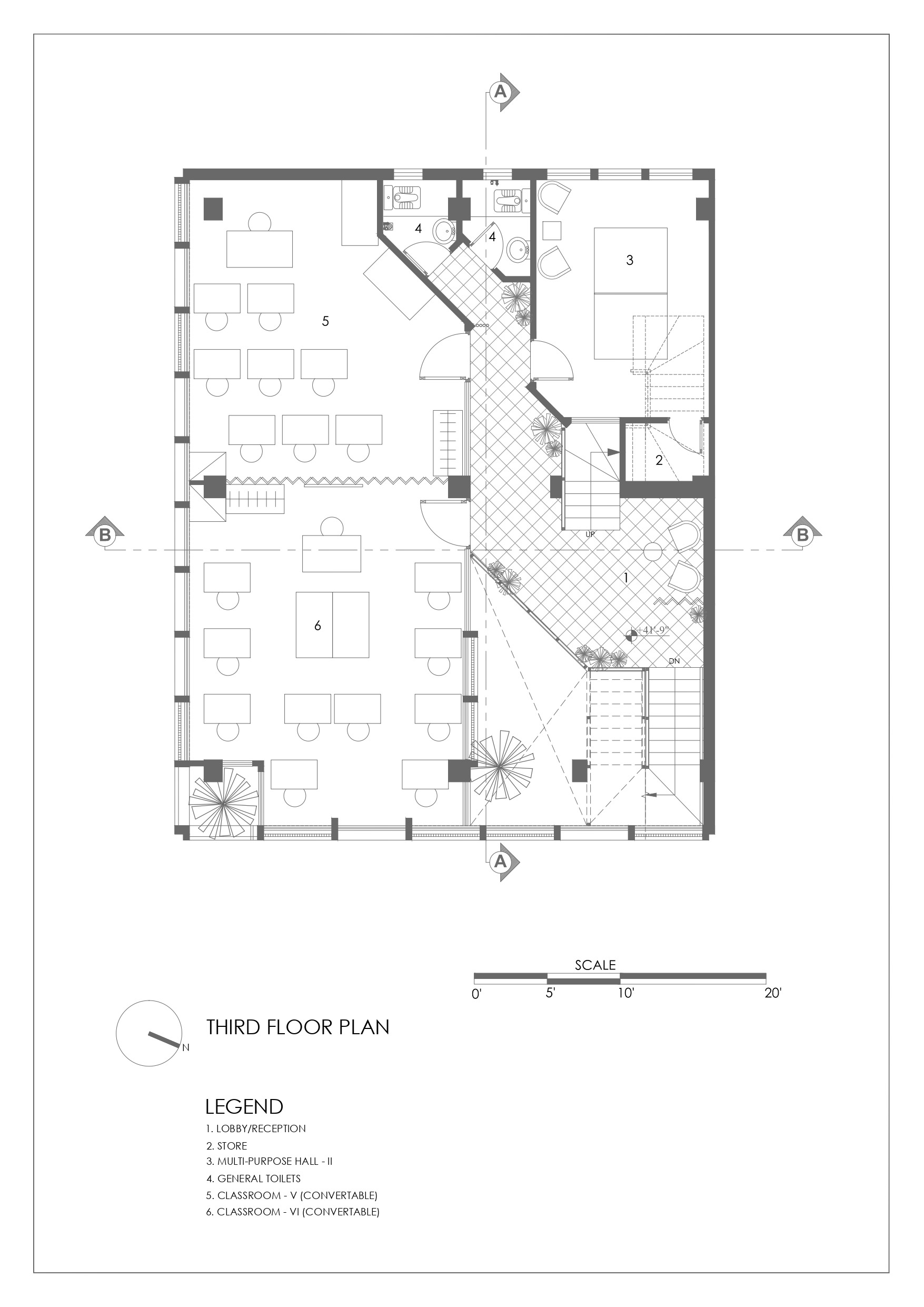 Located on a 130 sqm corner lot on Ghauri Road, the site sits in a dense, informal peri-urban context of mixed use plazas, small houses, vendors, and eclectic architecture. The building maximizes the full volume allowed, using a central vertical core enabling independent floor operation for revenue generation. Lower/upper ground levels include rentable retail/exhibition spaces and parking. Upper floors contain classrooms (on the east for daylight/ventilation), offices, washrooms, multipurpose halls, and a triple-height atrium with a tall anchor tree enhancing ventilation and unity. The top floor includes staff quarters, a dining hall, terraces, a prayer area, and a kitchen garden.