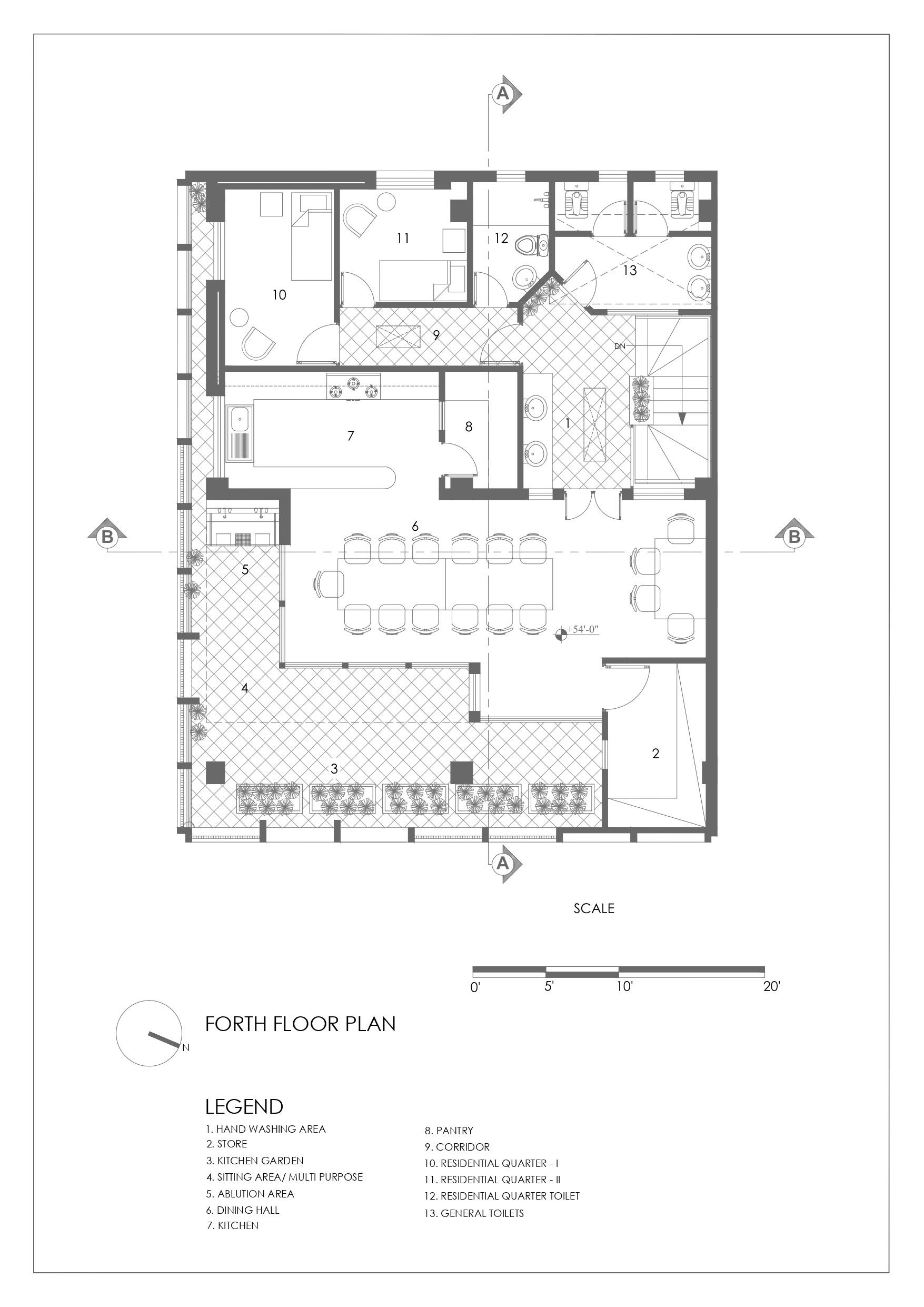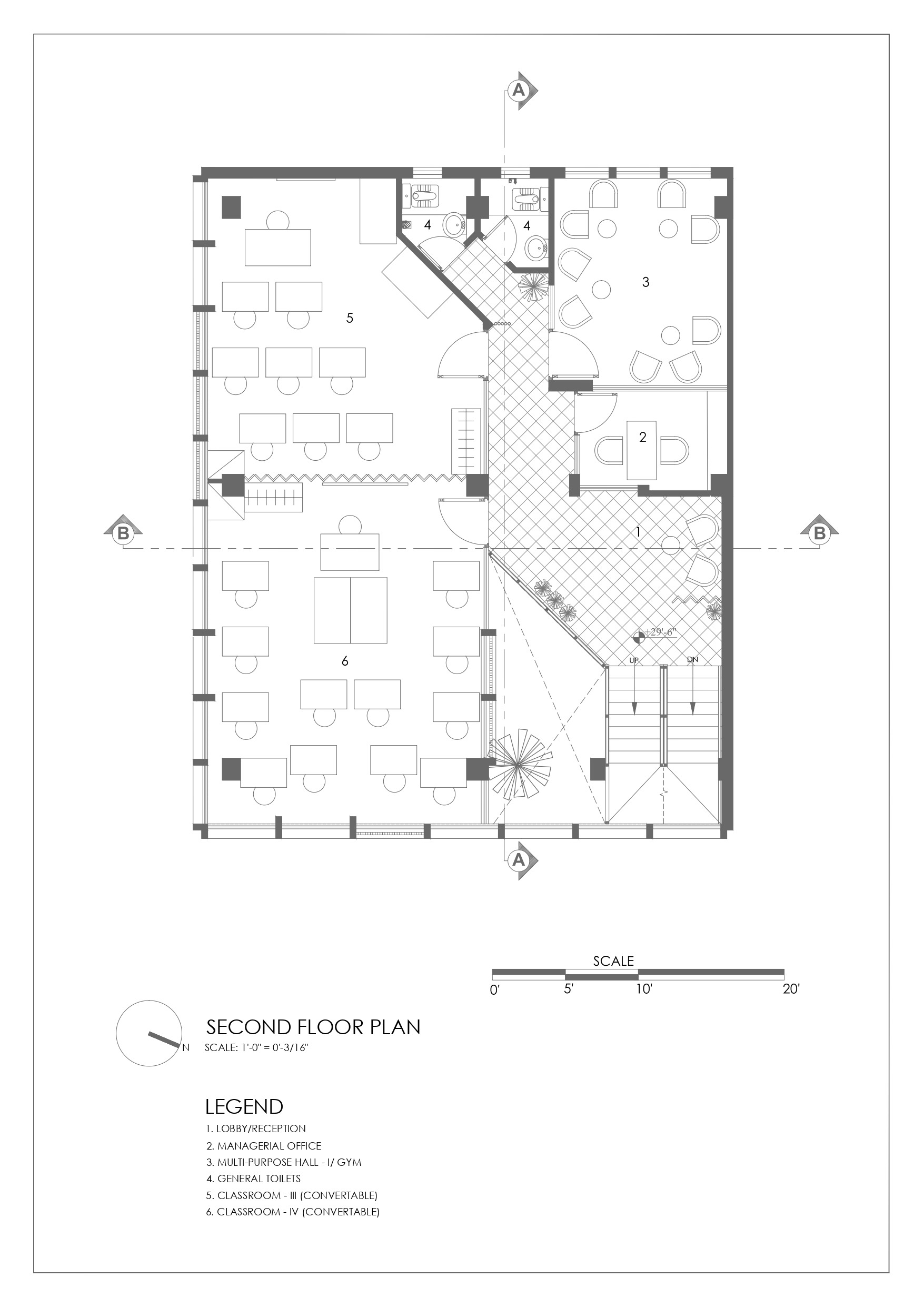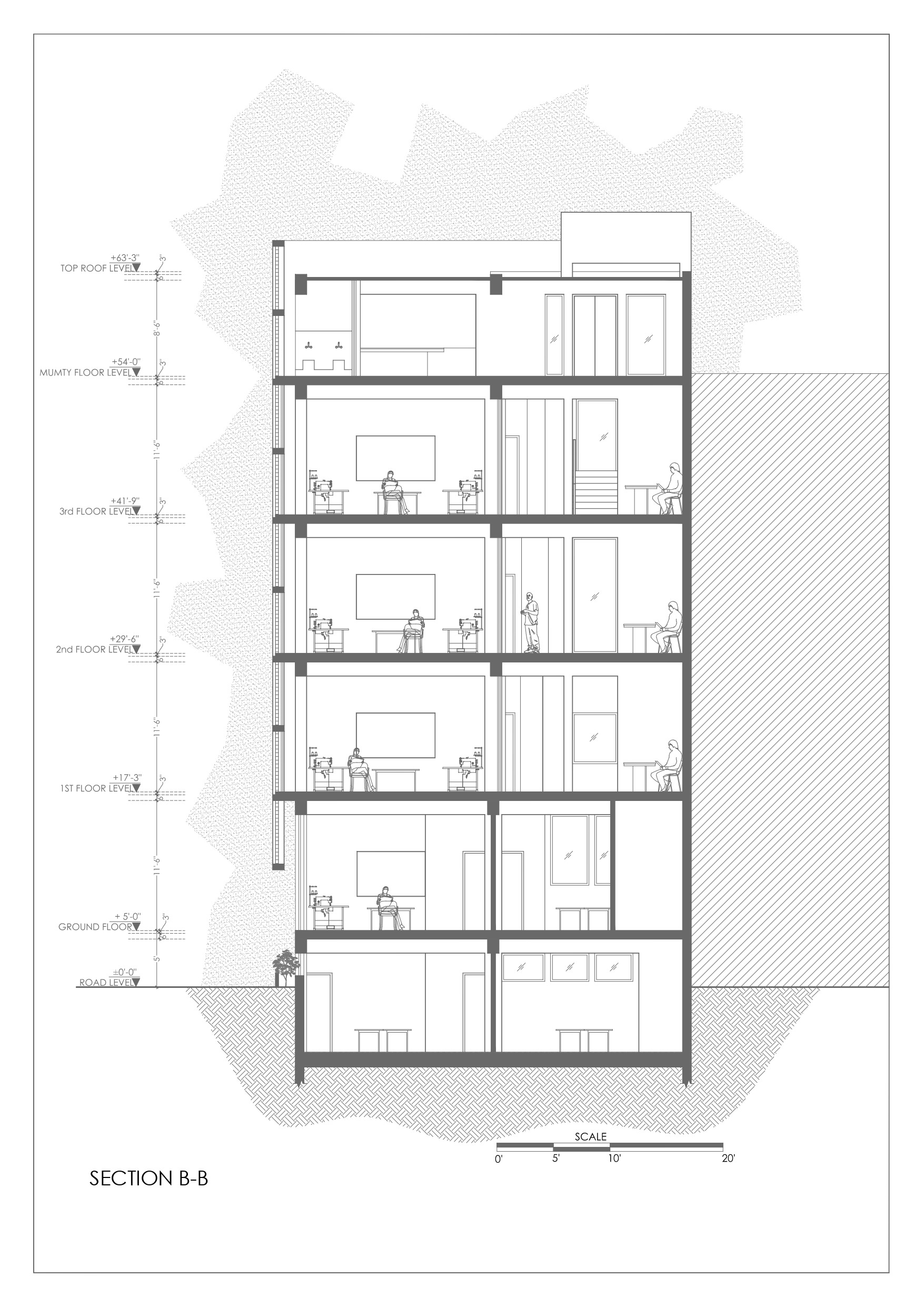 지하와 1층은 임대 가능한 소매점이나 전시 공간, 주차장으로 활용한다. 상층부에는 교실을 동쪽에 배치했다. 자연광과 환기를 고려한 선택이다. 사무실, 화장실, 다목적 홀도 상층부에 자리한다. 3층 높이 아트리움 중앙에 솟은 수목이 시선을 끌어올리며 자연 환기를 돕고 공간에 통일감을 부여한다. 최상층에는 직원 숙소, 식당, 테라스, 기도 공간, 그리고 텃밭이 자리한다.