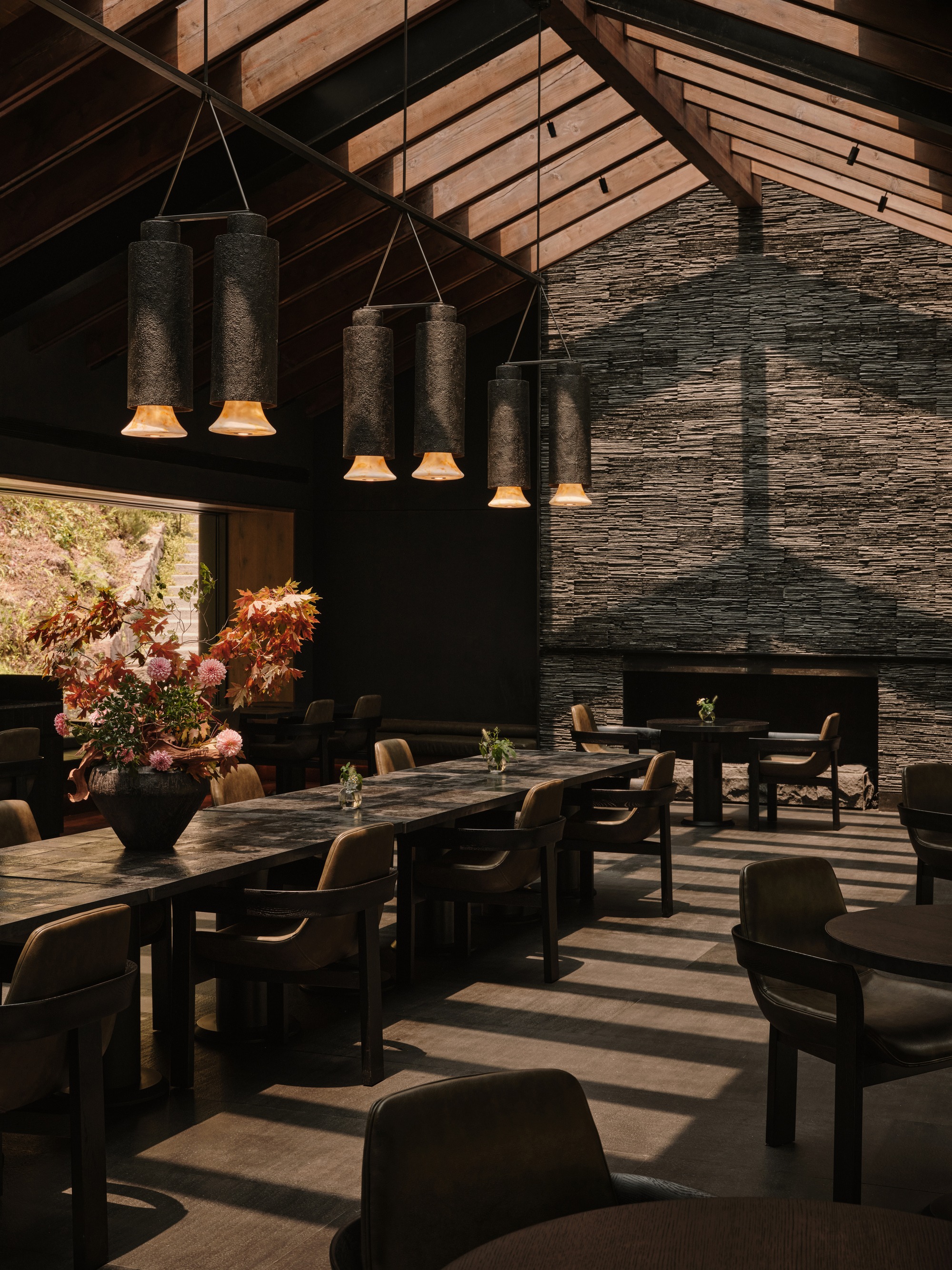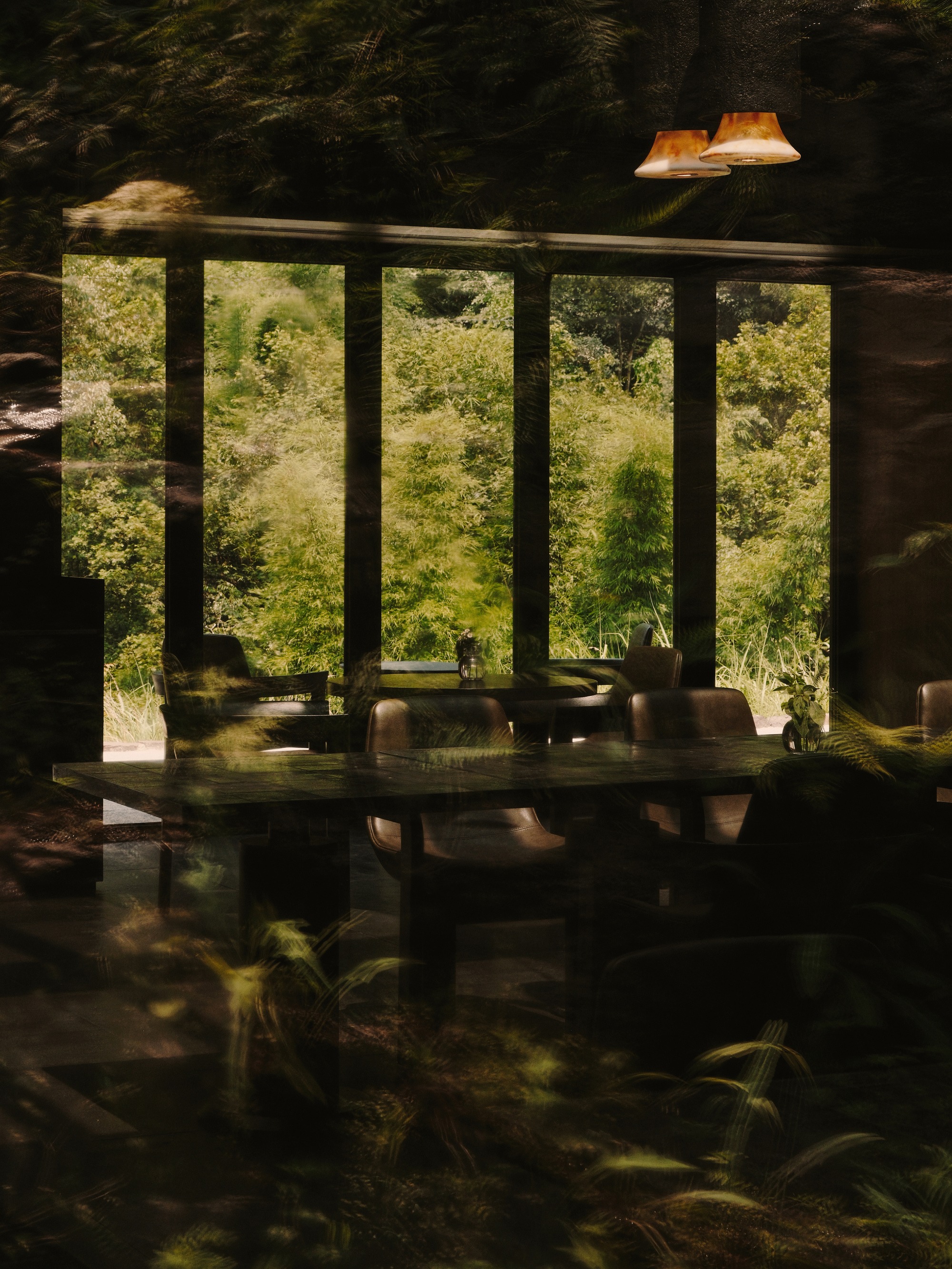 식당은 지역 장인 정신과 정제된 구조의 결합을 표현한다. 외부에서는 지붕이 전통적인 러산 회색 기와로 마감되고, 내부에서는 삼나무 구조틀이 천장을 가로지르며 따스함과 리듬감을 더한다. 에메이산에서 채취한 편암으로 쌓은 벽이 공간을 이 땅의 지질 위에 뿌리내린다.