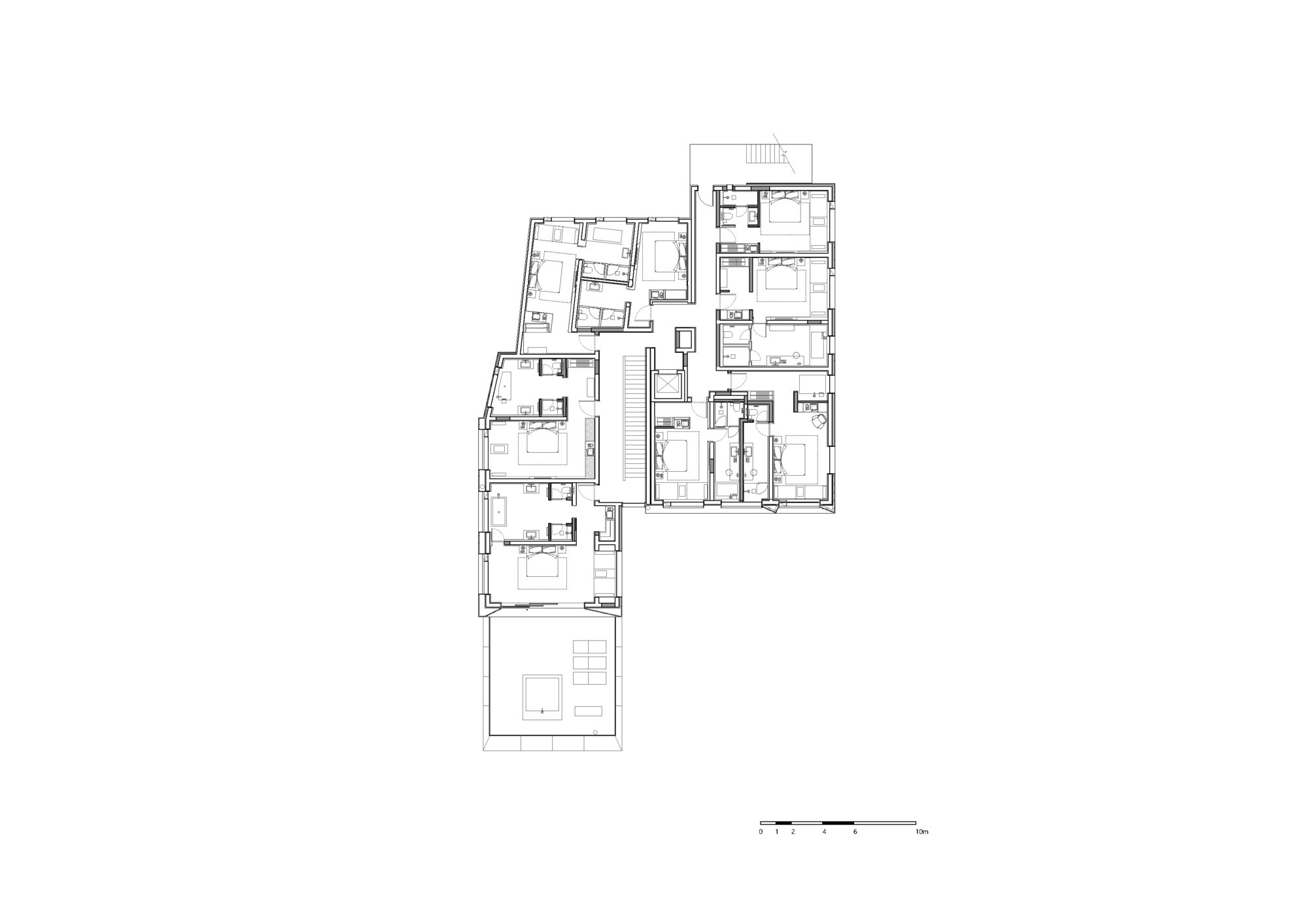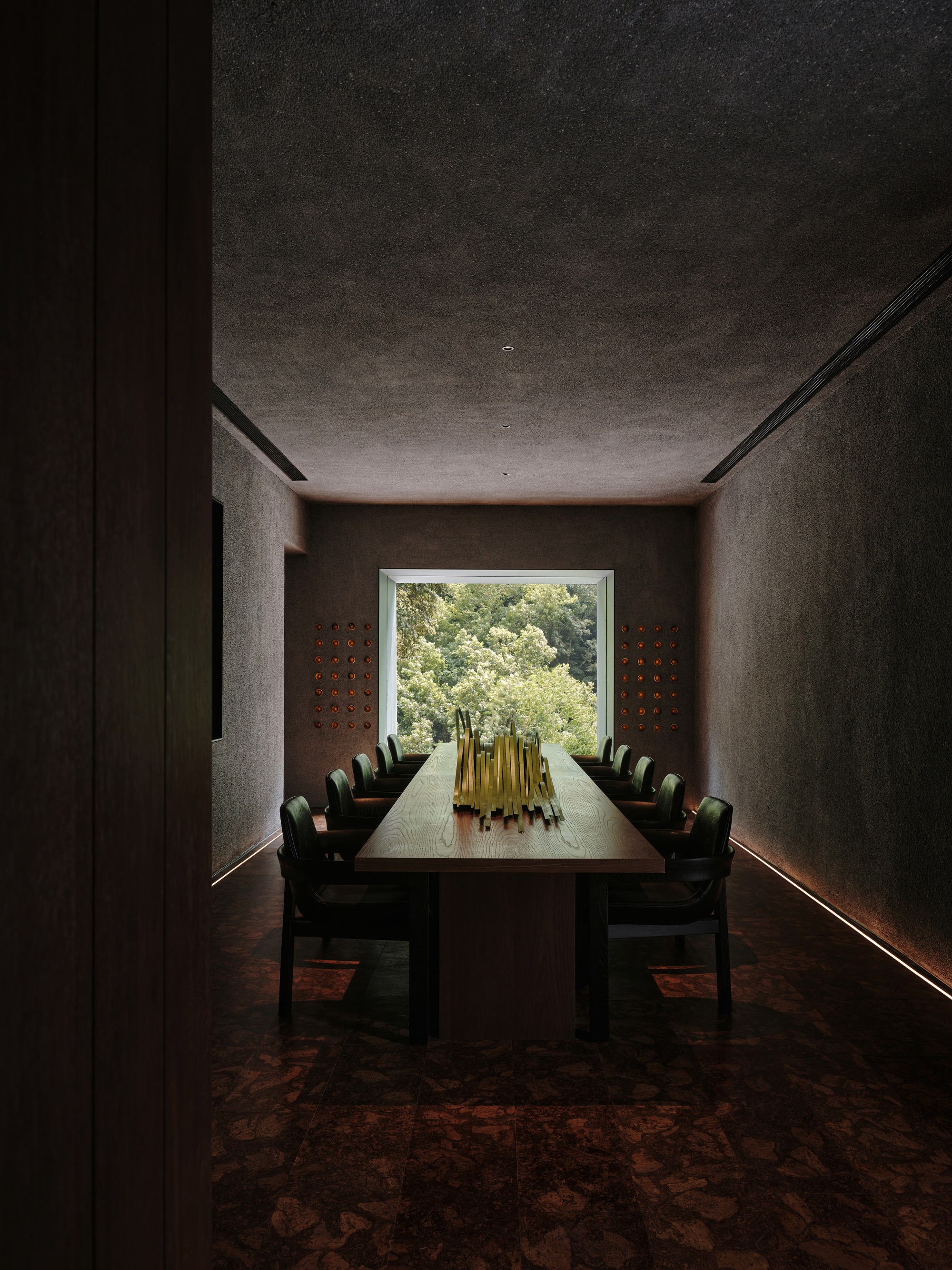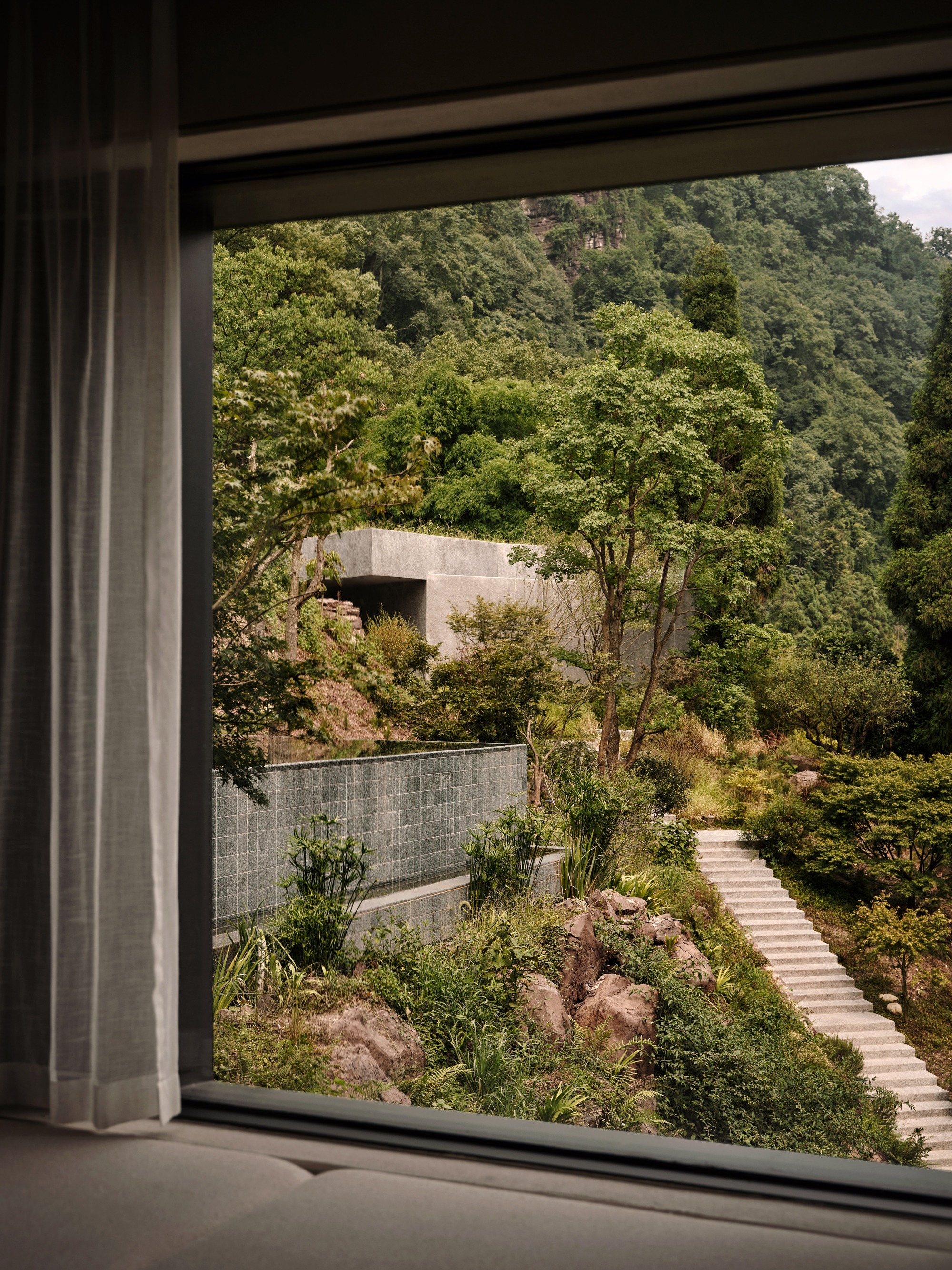 가장 높은 곳에는 물갈이돌로 마감된 구조물이 자리한다. 객실은 들어 올려진 녹색 경관 아래 은밀하게 통합된다. 외부에서는 건물이 거의 보이지 않고, 내부에서는 통창이 고요한 산의 풍경을 액자처럼 담아낸다.