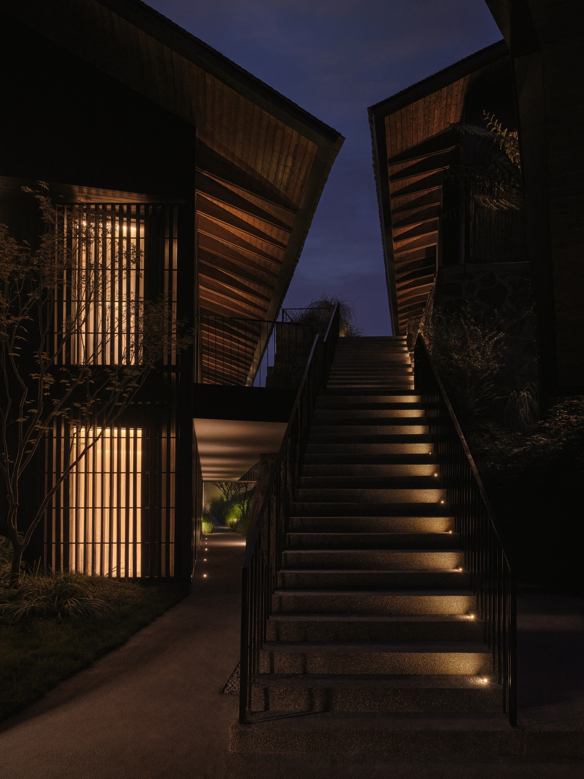 The architecture draws inspiration from the site's terrain and cultural heritage. Buildings are arranged in a staggered, village-like composition, recalling stone dwellings nestled into the hillside. Traditional pitched roofs and deep eaves are reinterpreted with a contemporary sensibility, bridging past and present. With its landscape-first approach, restrained material palette, and poetic integration of tradition and modernity, ZOLAND·Emei Resort is conceived not merely as a hotel but as a secluded haven—an environment that encourages reflection, slowness, and a renewed dialogue between people and the land.