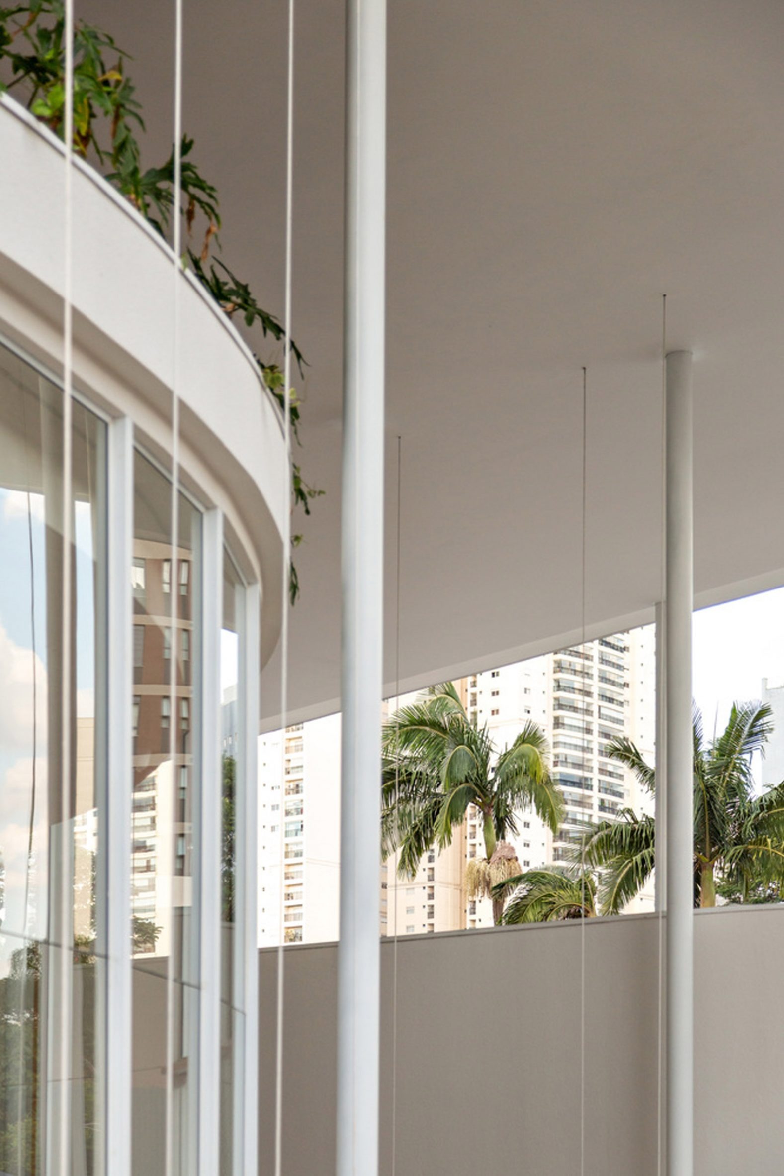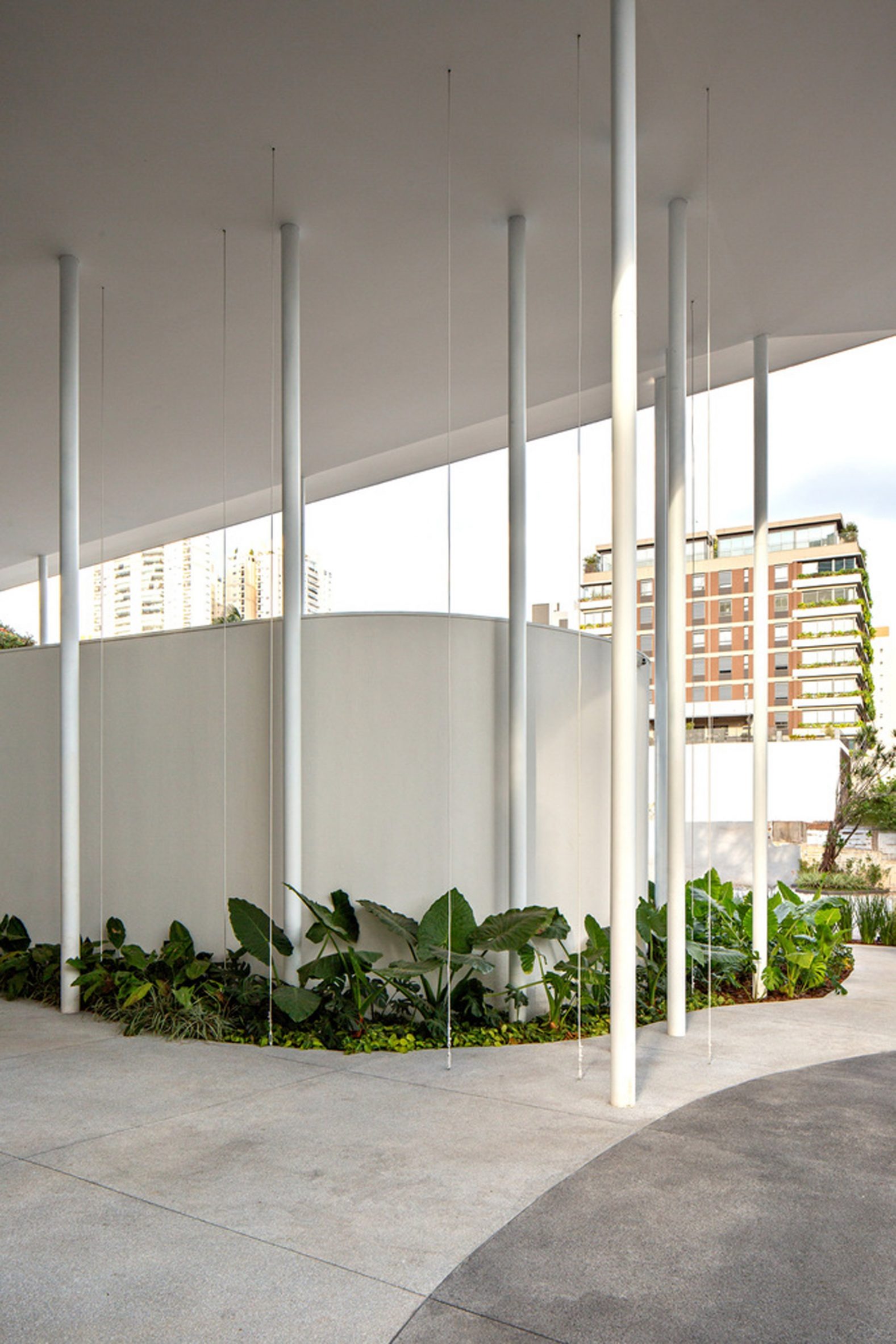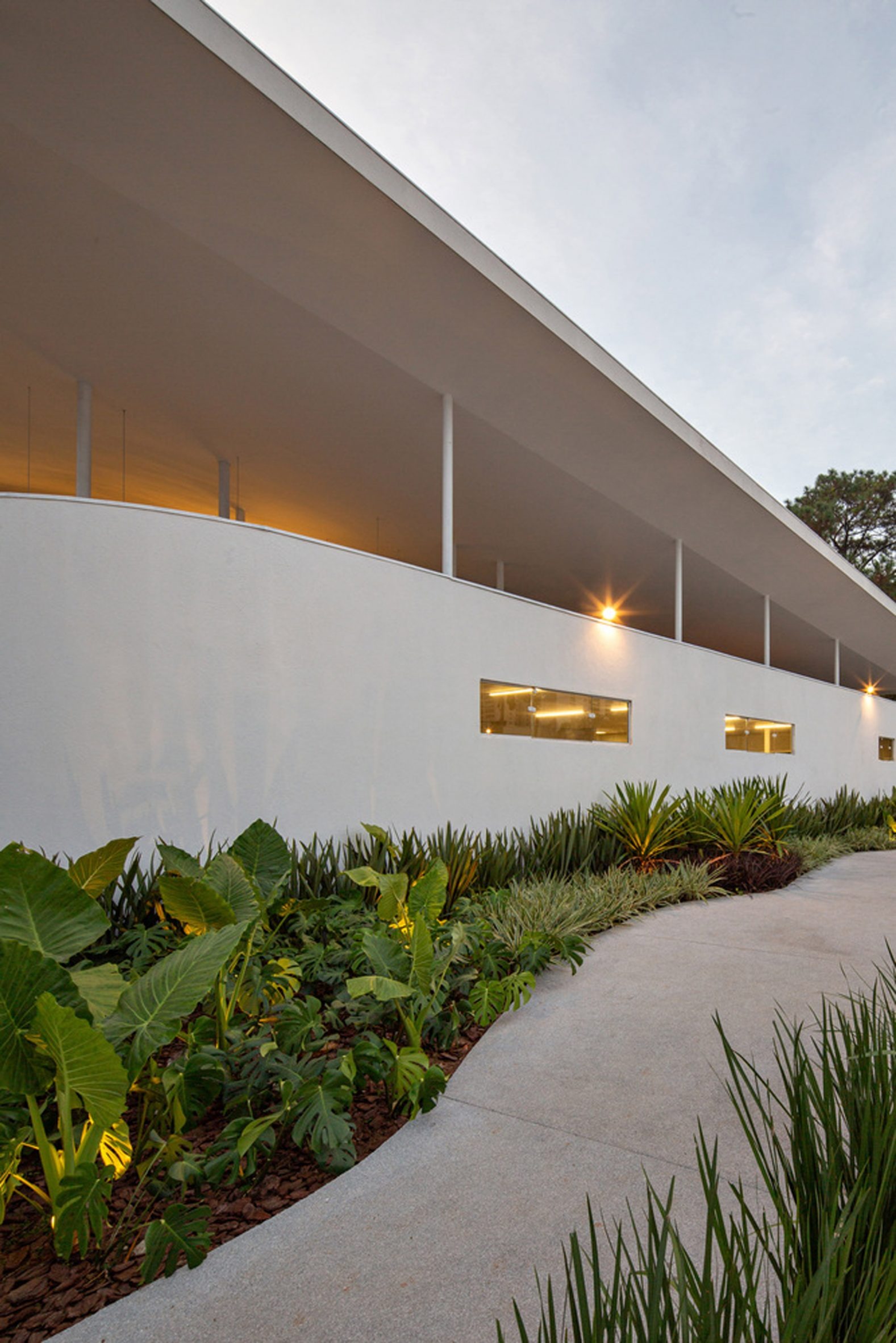 The structure is left exposed with white concrete that emphasises the form and contrasts the green plantings, which are shaded by the deep cantilever of the roof.