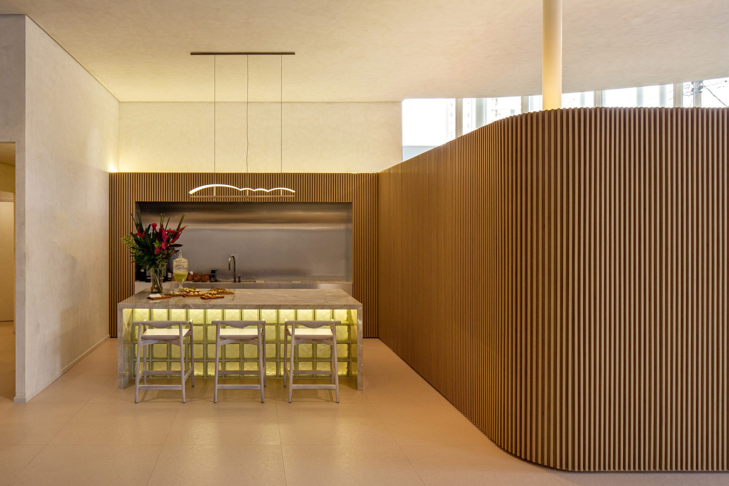 Inside, the smooth floor and ceiling seem to hover around frameless glass walls. Slatted wooden dividers form seating, planters and smaller spaces within the pavilion.