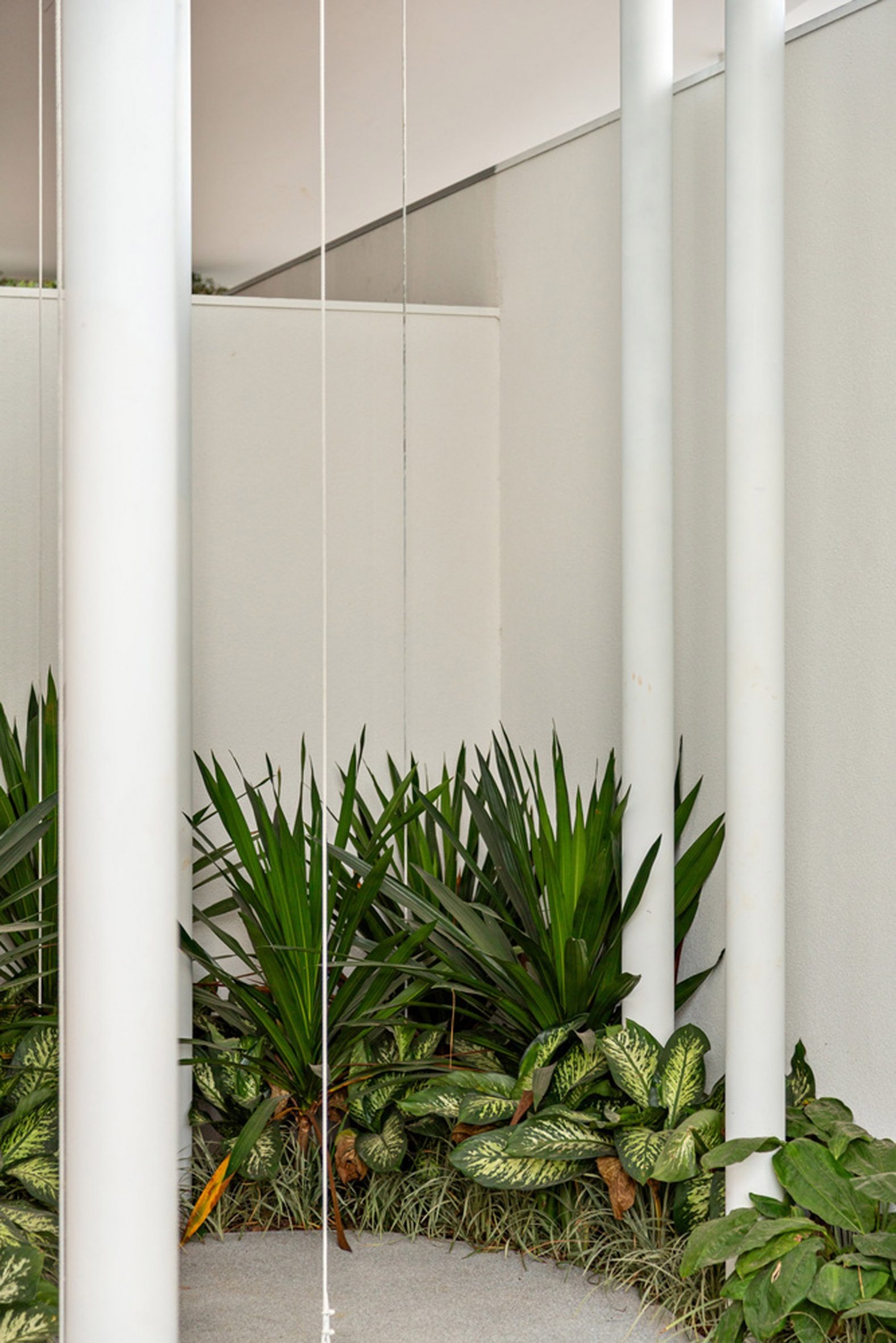 열대 식물이 층층이 자라는 정원이 파빌리온을 감싼다. 바나나 잎, 야자수, 다육 식물들이 기둥 사이사이를 채우며, 지붕 아래 그늘진 공간과 햇빛이 쏟아지는 야외를 부드럽게 연결한다. 사람들은 포장된 보행로를 따라 원형 유리벽을 돌아가거나, 기둥 숲 사이를 가로지르며 다양한 각도에서 건물을 경험한다. 어느 지점에서 보느냐에 따라 건물의 형태가 달라진다. 때로는 투명한 유리 너머로 내부가 훤히 보이고, 때로는 흰 벽면이 시선을 막으며 다음 공간에 대한 호기심을 자극한다.