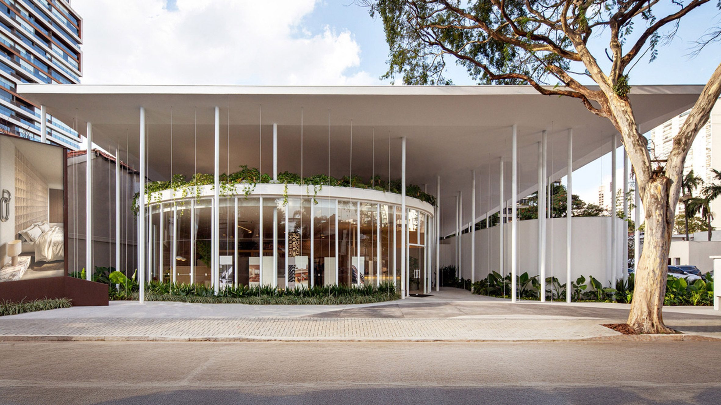 상파울루 브루클린 지역의 저층 주거지를 따라 걷다 보면, 고층 아파트 사이로 수평으로 긴 흰 지붕이 눈에 들어온다. 2025년 완공된 테스 파빌리온이다. 에스투디오 레오나르도 자나타가 설계했다. 350제곱미터 규모의 이 문화 공간은 주변의 수직적 도시 풍경 속에서 의도적으로 낮게 엎드린다. 건물은 무거운 느낌을 없애고, 대신 가볍게 떠 있는 지붕 아래로 누구나 걸어 들어갈 수 있는 열린 공간을 만들어낸다.
