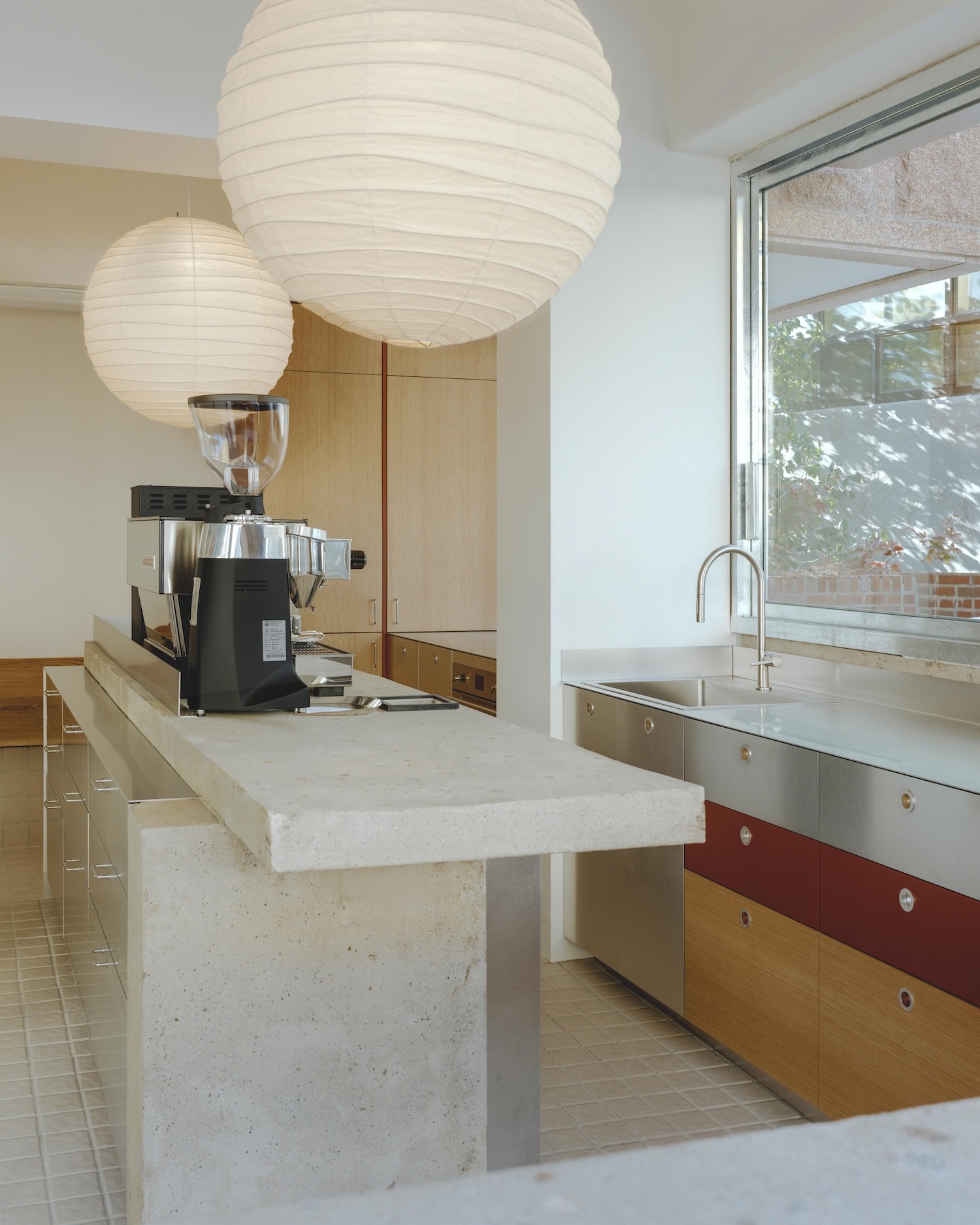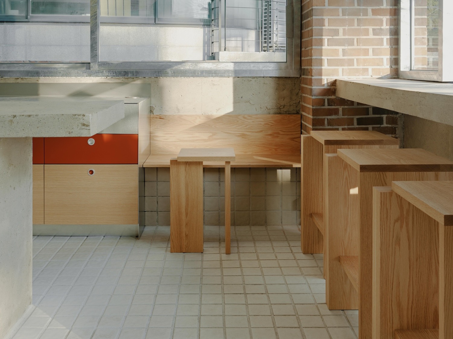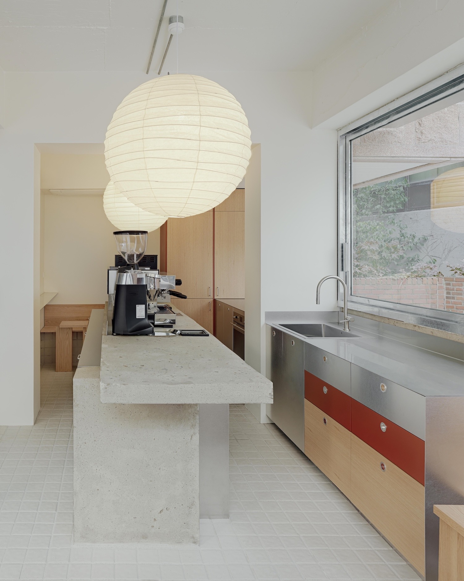 좁은 공간이지만 모든 것이 들여다보인다. 낮은 벤치, 열린 창틀, 길가를 향한 바는 카페 내부 전체를 하나의 관찰 가능한 주방 작업장으로 바꾼다. 준비와 서빙 사이의 경계가 지워진다. 거리에서 바라보면 구조가 훤히 드러난다. 금속 이음, 콘크리트 지지, 재료 전환. MMK가 가구를 만들 때 조립 과정을 드러내듯, 이 카페 역시 구축 과정을 숨기지 않는다. 장식으로 가리기보다 구조적 정직함이 미적 특성을 규정한다.
