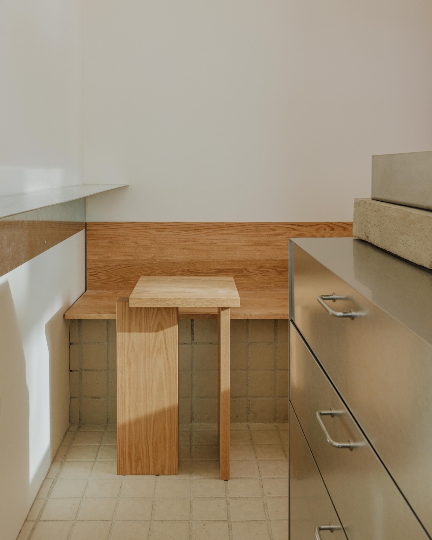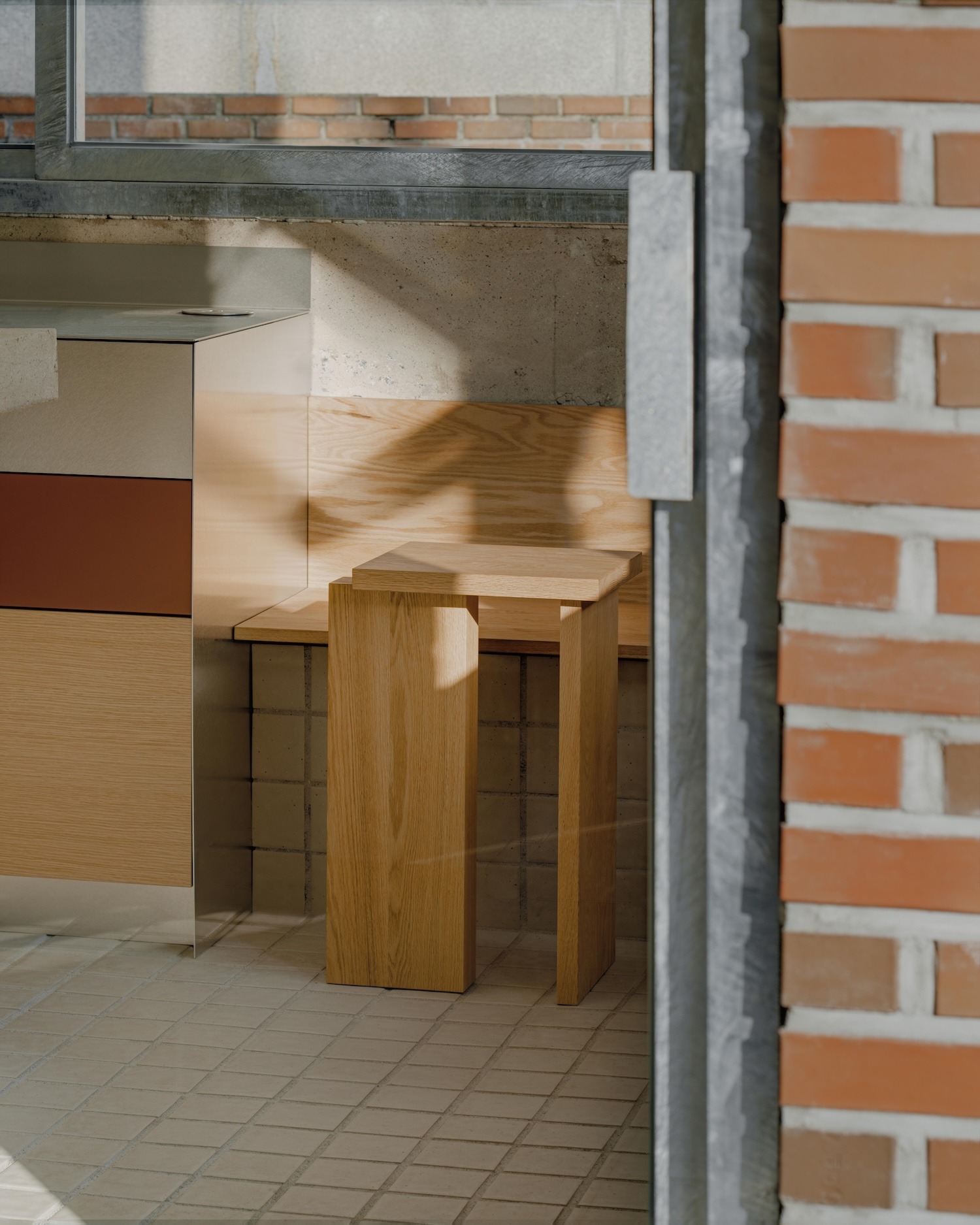 The layout transforms spatial limitation into transparency. A low bench, open window frames, and a street facing bar turn the entire interior into an observable kitchen operation, erasing the typical divide between preparation and service. From the sidewalk, the structure remains fully legible – metal joinery, concrete support, material transitions – reinforcing the brand’s commitment to exposed construction over decorative concealment. This openness extends MMK’s furniture philosophy, where assembly logic stays visible and mechanical honesty defines aesthetic character.