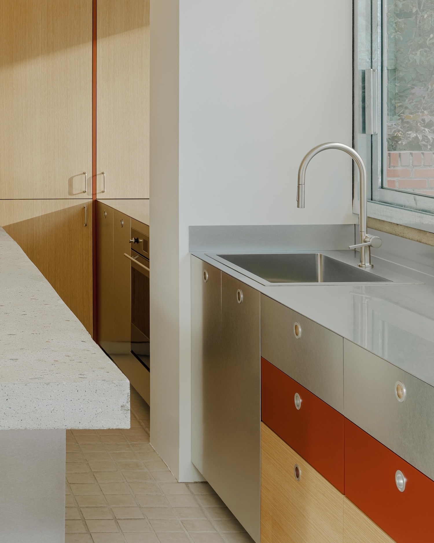 The material strategy operates through deliberate contrast. Stainless steel and hot dip galvanized surfaces carry the marks of fabrication and use without apology, reflecting light unevenly and aging visibly in ways that connect to workshop environments. Against this, a thick concrete counter establishes structural weight, its rough texture creating friction with the polished metal while grounding the modest scale of the space. Wood elements soften the palette through minimal finishing, offering tactile warmth that references kitchen familiarity rather than slick retail polish. Red accents appear precisely where materials meet – along seams, edges, transitions – adding visual rhythm that echoes the utilitarian color found in home kitchens and industrial spaces alike.