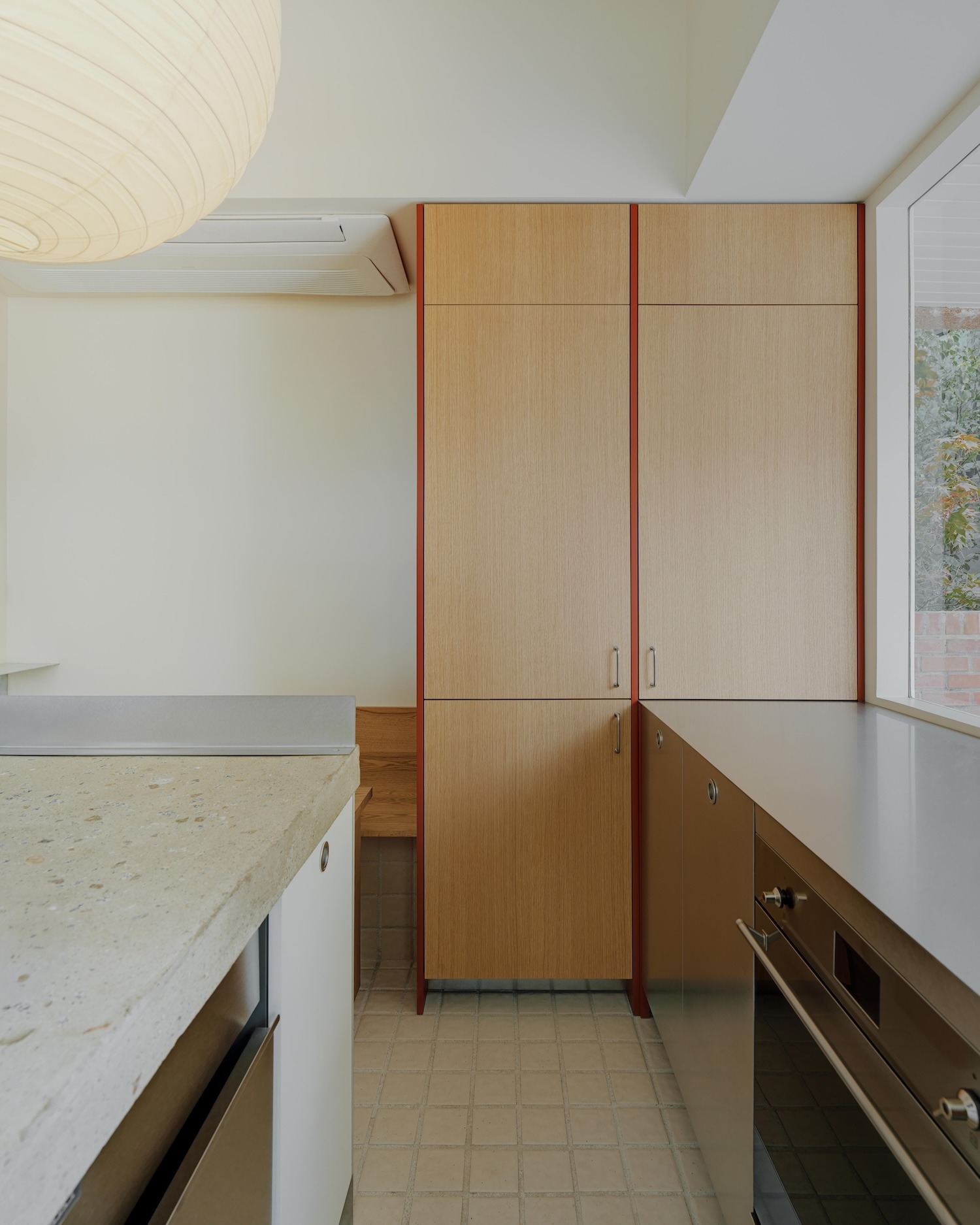 Lighting operates between the cool palette of metal and concrete, filling interstitial spaces with warmth that shifts as natural light moves through the day. Small scale details like brick walls, compact tiling, and intentionally exposed junctions create a sense of settled occupation, making the space feel inhabited rather than staged. The design avoids the clinical precision of showroom environments, instead cultivating the comfortable imperfection of a working kitchen.