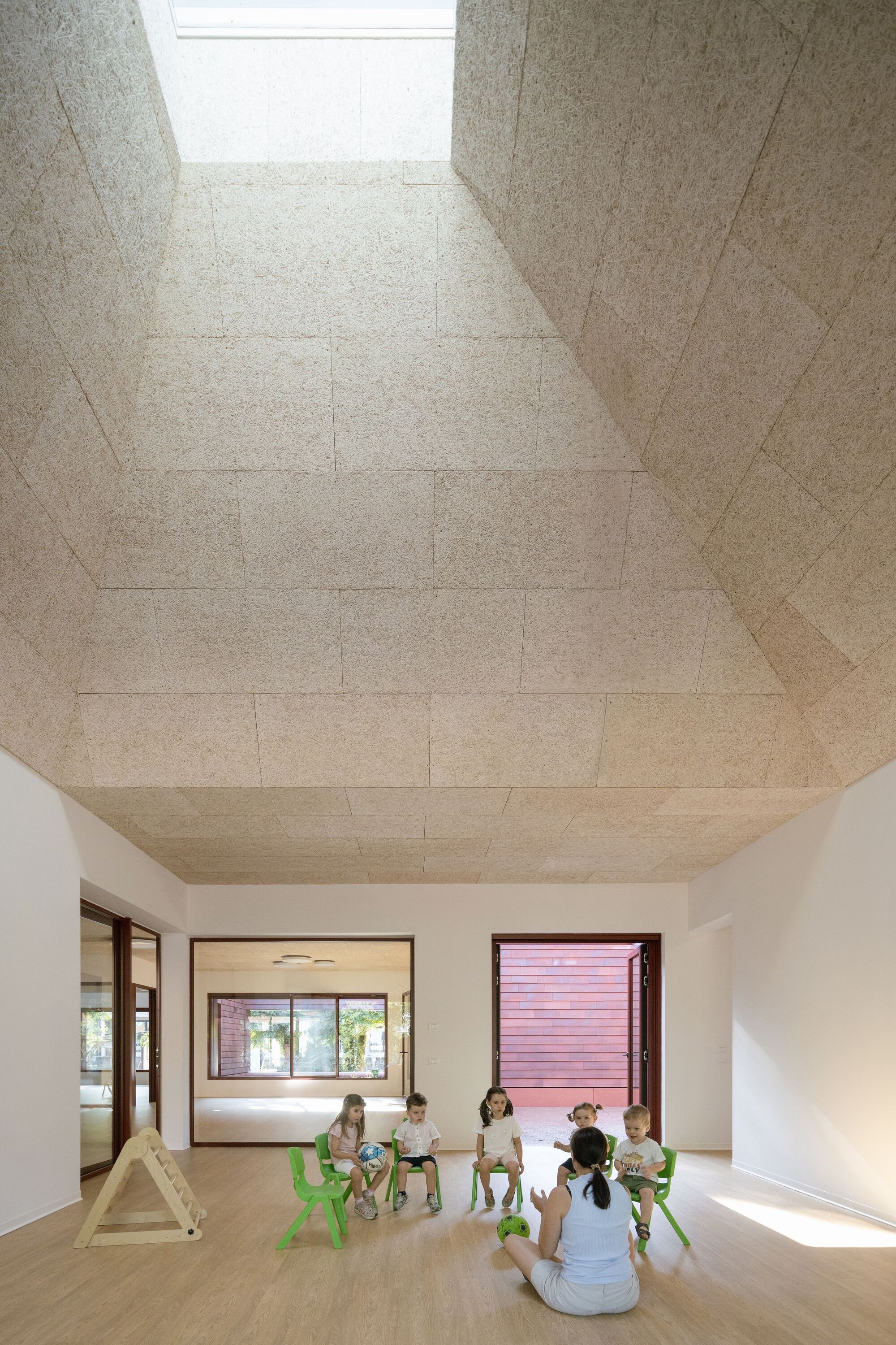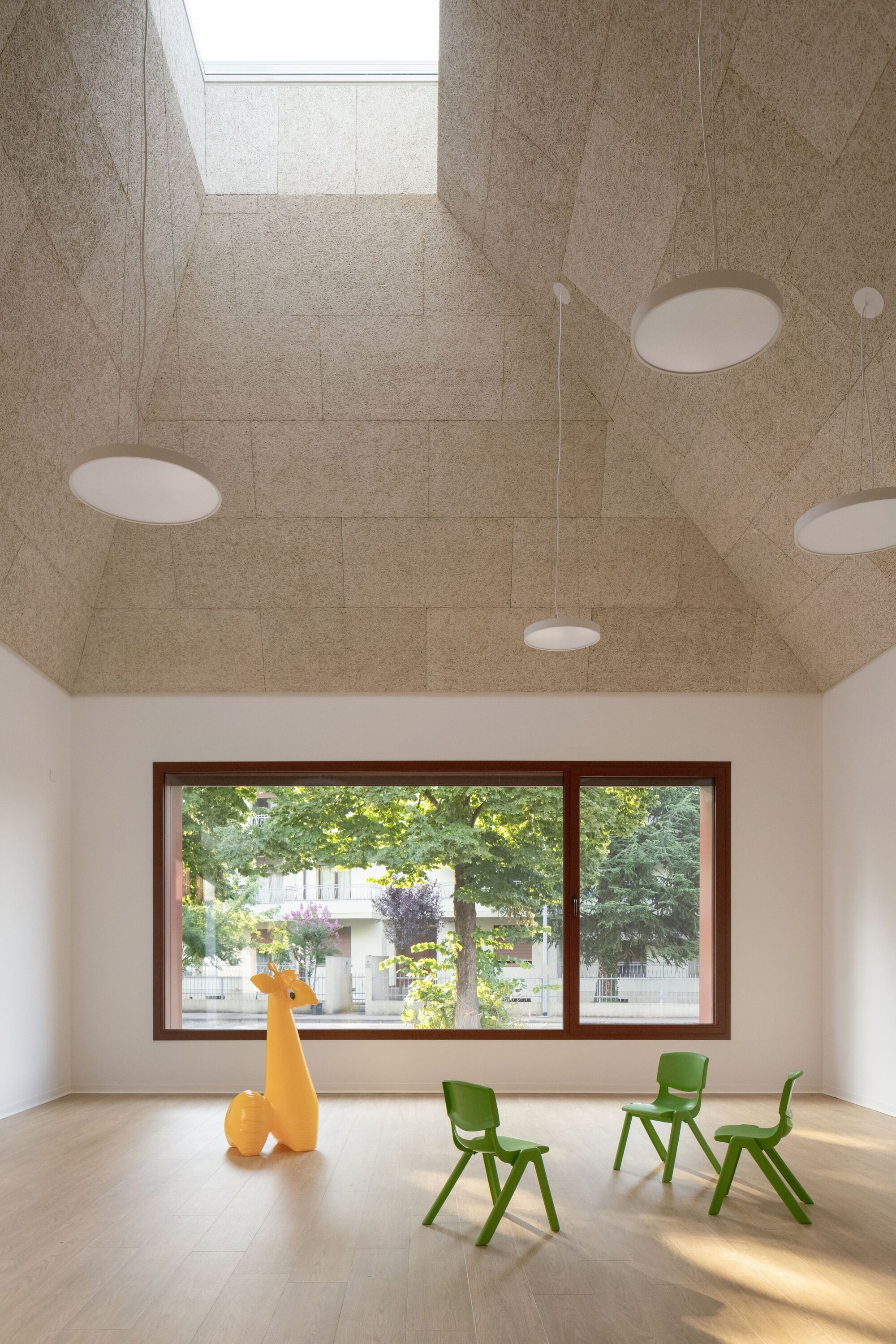 Like houses around a village square, the classrooms also face inward, engaging through a central agorà, a shared space for play and informal learning. Here the gaze drifts toward the garden, crossing classrooms and patios, drawing continuous relationships between spaces. Eventually, it turns upward, expanding toward a zenithal skylight. The sun marks the passing of time like a sundial, grazing the textured wood ceiling; a quiet, material echo of the thatched roofs of the Casoni.