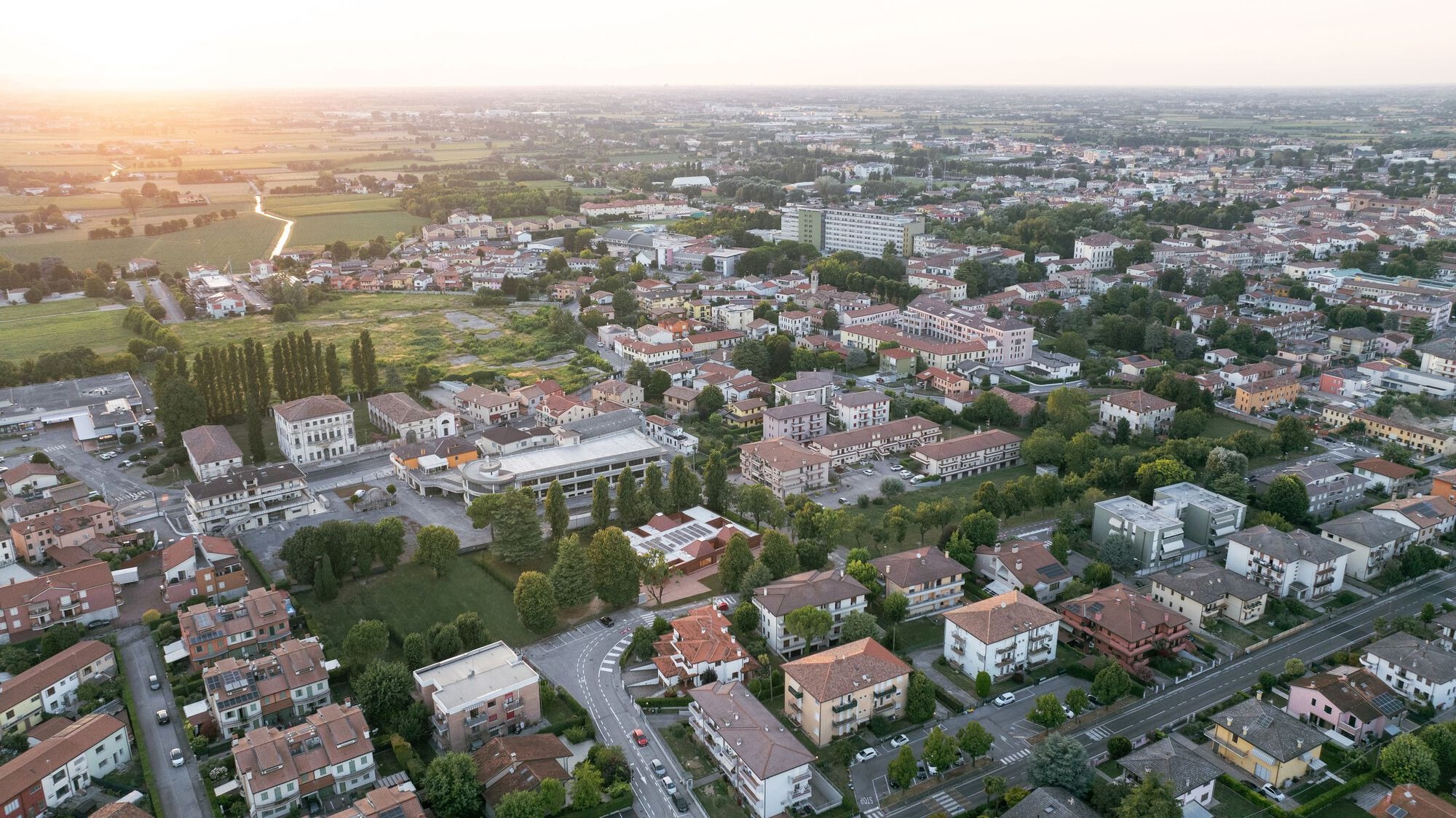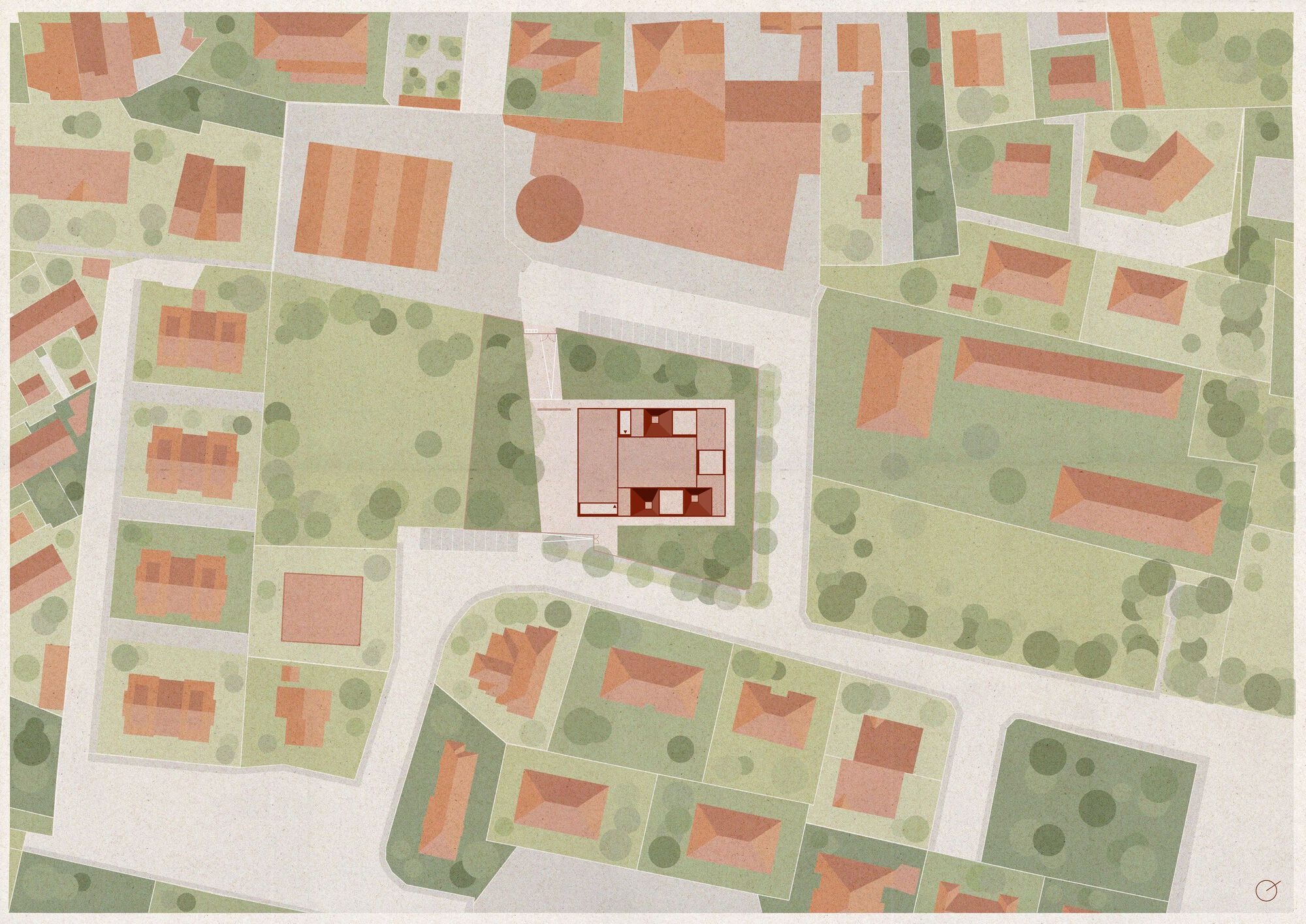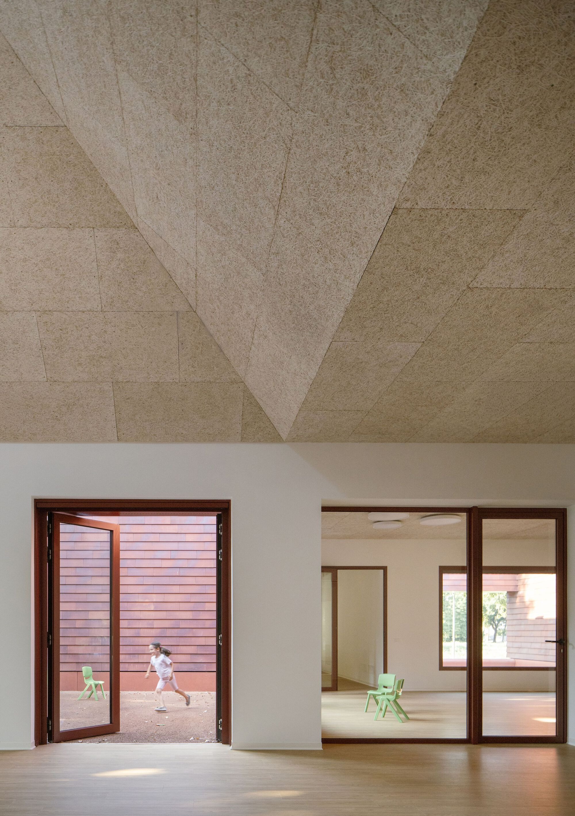 Kinder Rain emerges from the memory of the landscape, reinterpreting the archetype of the Casone Veneto: the vernacular dwelling of farmers and fishermen, known for its distinctive thatched roofs. Its form identifies three classrooms, standing out as volumetric exceptions within a continuous terracotta skin, evoking the age-old tradition of clay construction and pitched tile roofs. At the base, a soft, pigmented concrete bench gently meets the ground, becoming both urban furniture and a playful threshold between the didactic and the spontaneous, the indoor and the outdoor. The volume, seemingly compact, conceals a play of solids and voids. Each classroom mirrors itself outward, extending into outdoor learning patios, protected and framed by the surrounding courtyard.