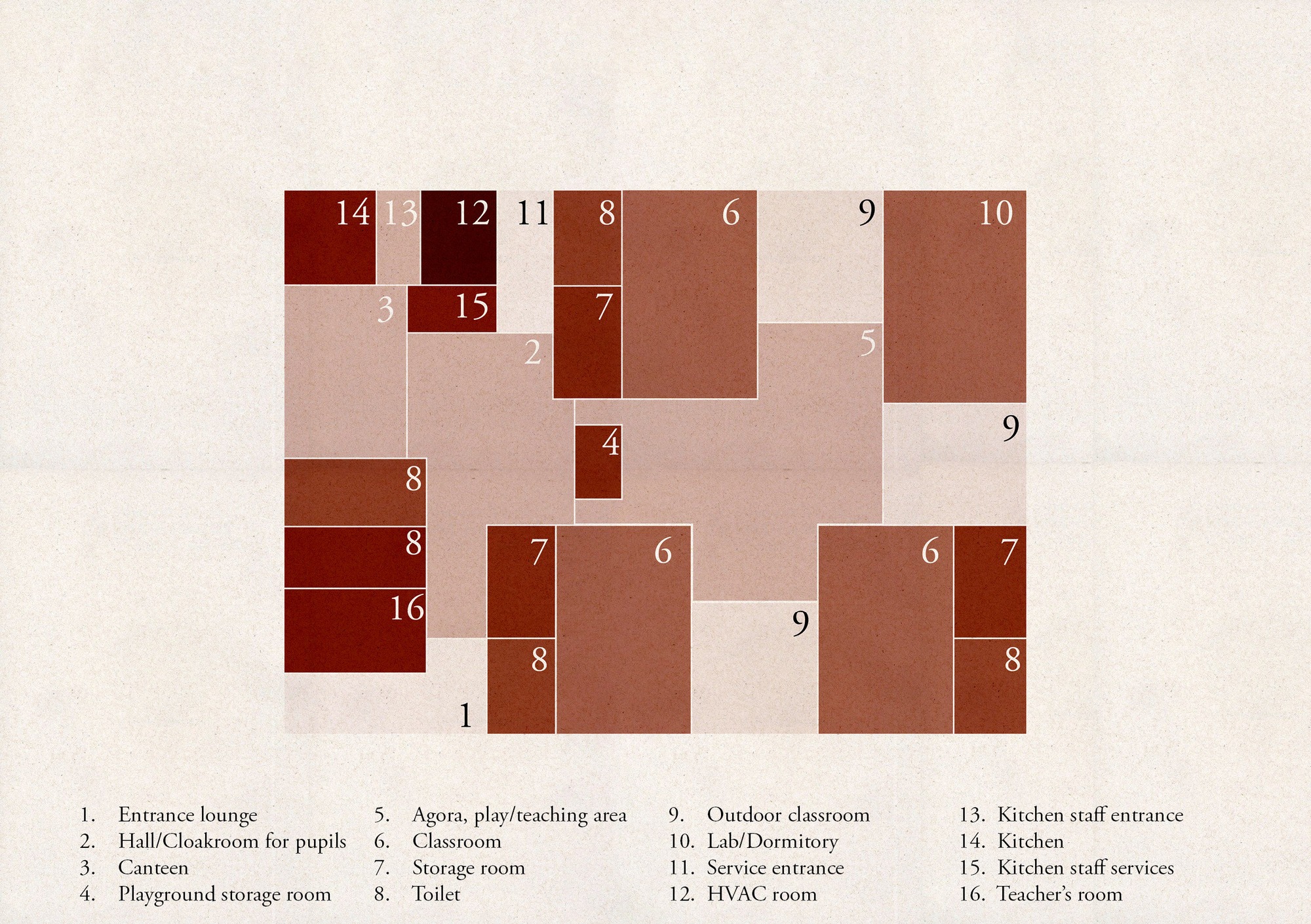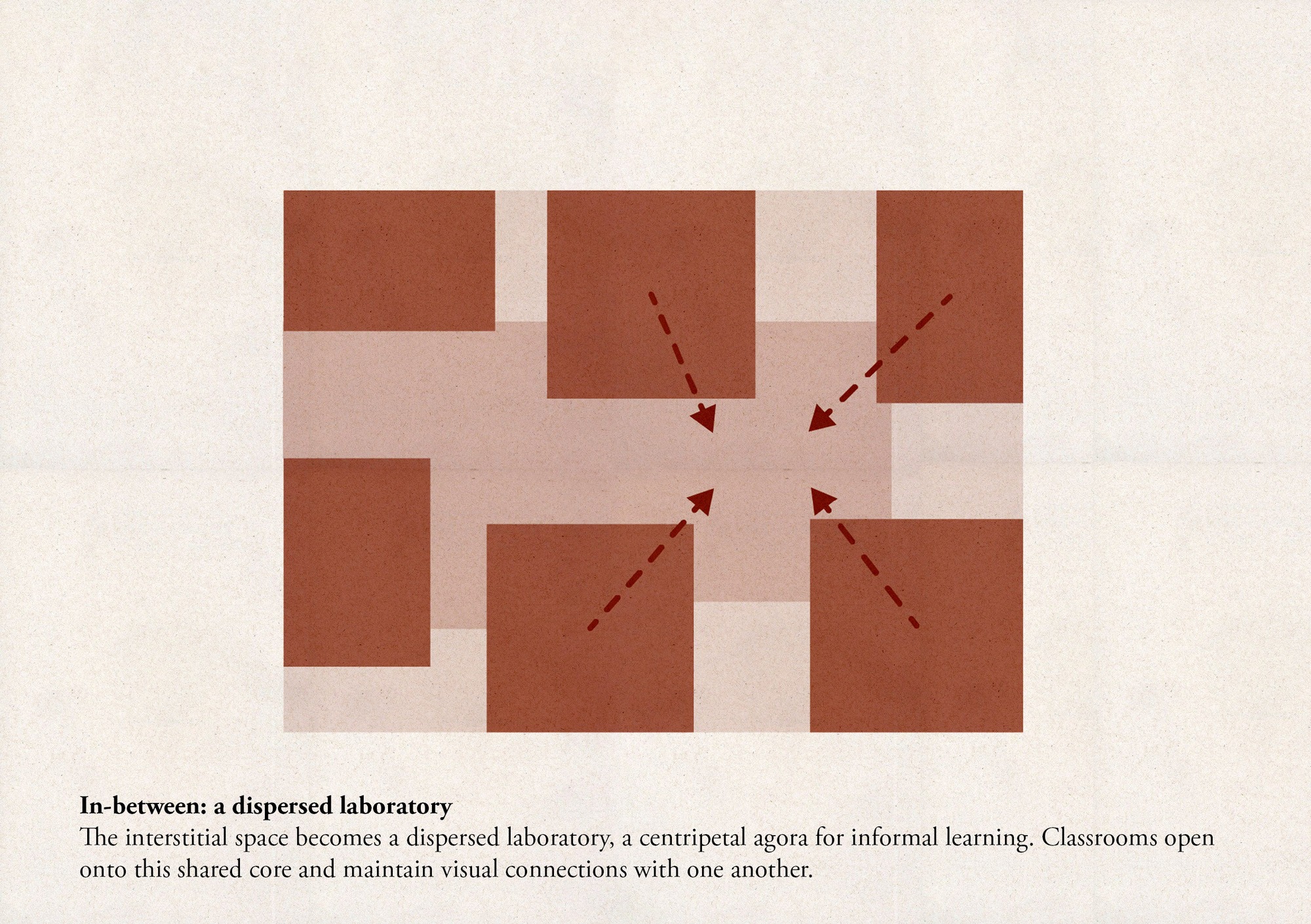 겉보기엔 단단해 보이지만, 이 건물은 속으로 비움과 채움의 놀이를 감춘다. 각 교실은 스스로를 바깥으로 비추며, 외부 학습 마당으로 확장된다. 이 마당들은 중정이 둘러싸며 보호하고 경계를 만든다. 마을 광장을 둘러싼 집들처럼, 교실들도 안쪽을 향한다. 놀이와 비형식 학습을 위한 중앙 마당, 아고라와 맞닿는다. 이곳에서 시선은 정원을 향해 흐르고, 교실과 마당을 가로지르며, 공간들 사이로 끊임없는 관계를 그린다. 결국 시선은 위로 향하고, 꼭대기 천창에 닿는다.