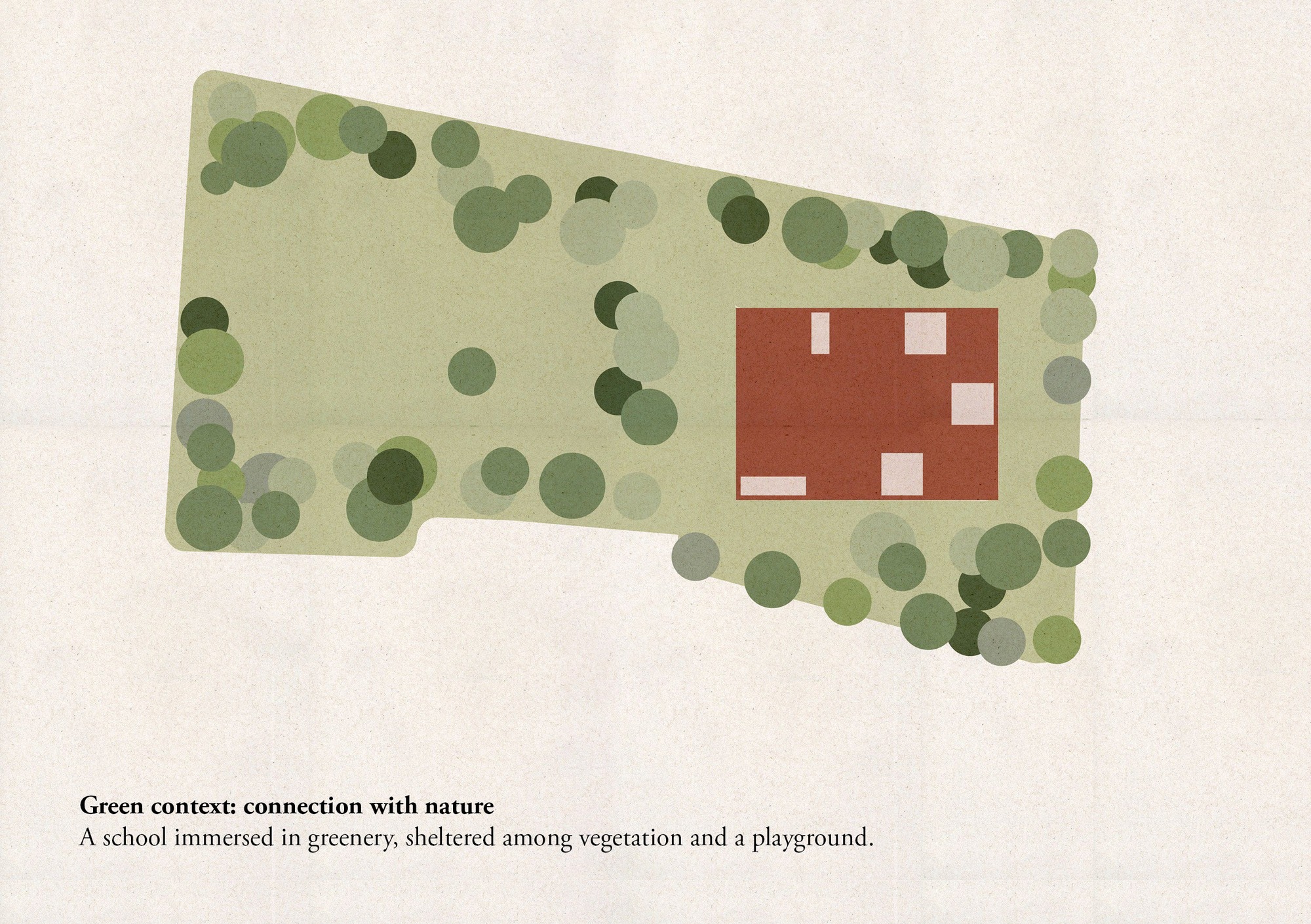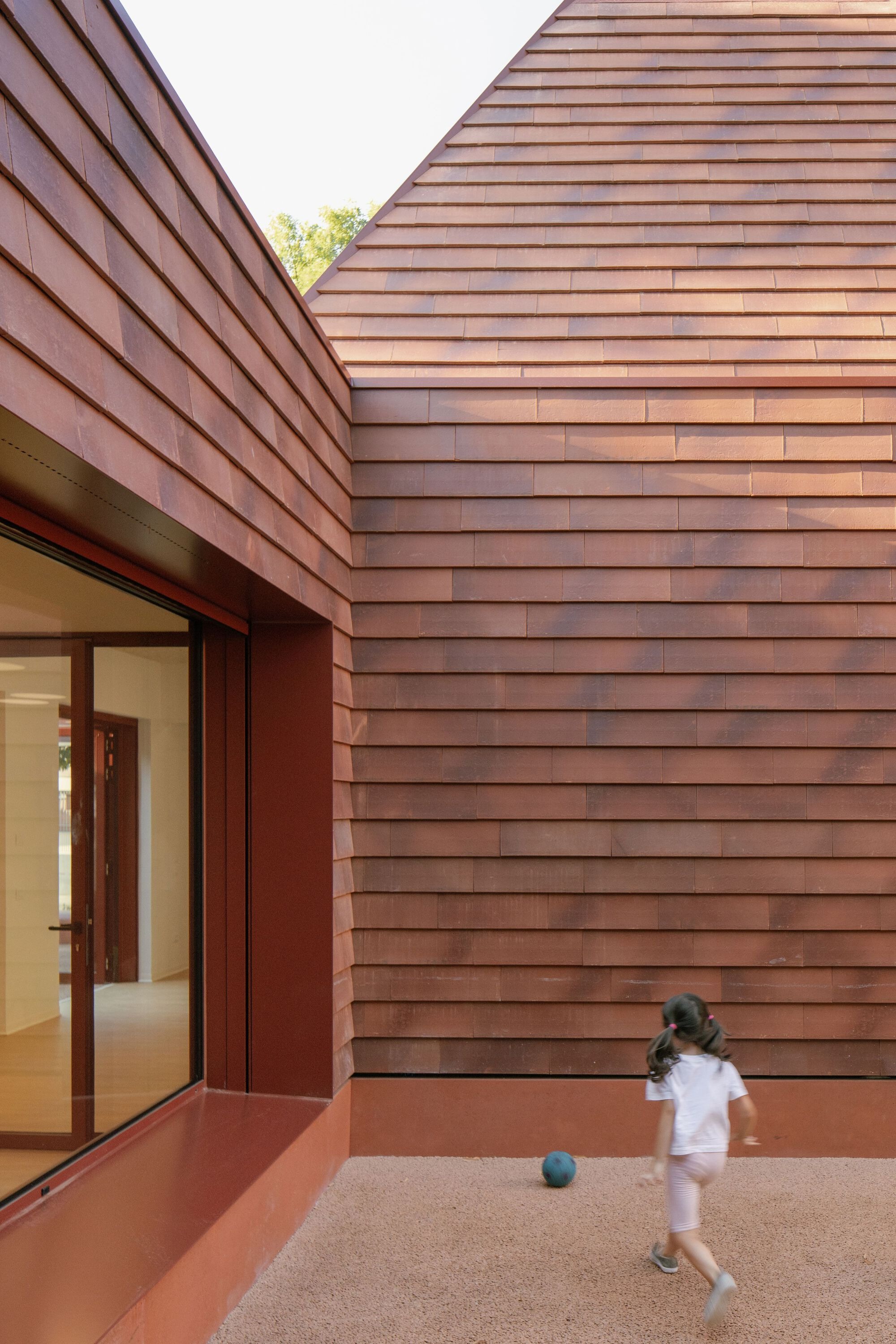 A primordial kindergarten, shaped by the spirit of the place and the emotions of the child. A space both protected and dreamlike, safe yet open to wonder. A small village, an abstract ensemble of pyramidal volumes joined by open courtyards. A vermilion school, warm and welcoming, rising among trees, nestled in green.